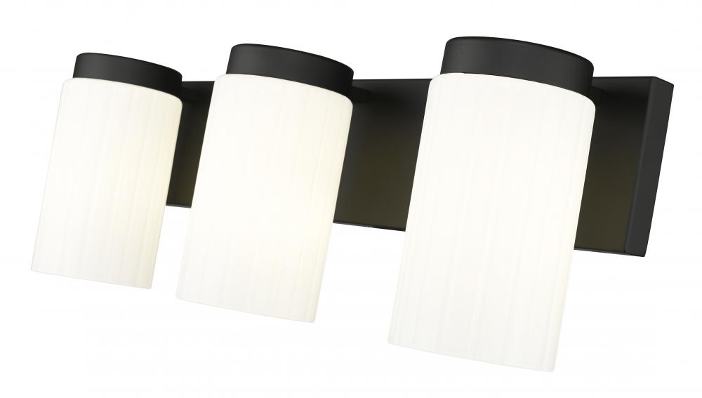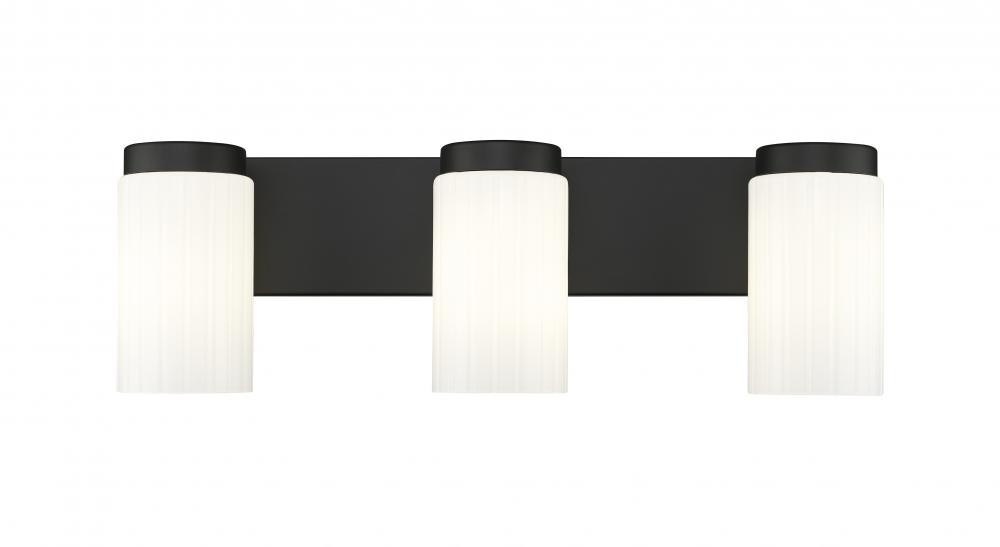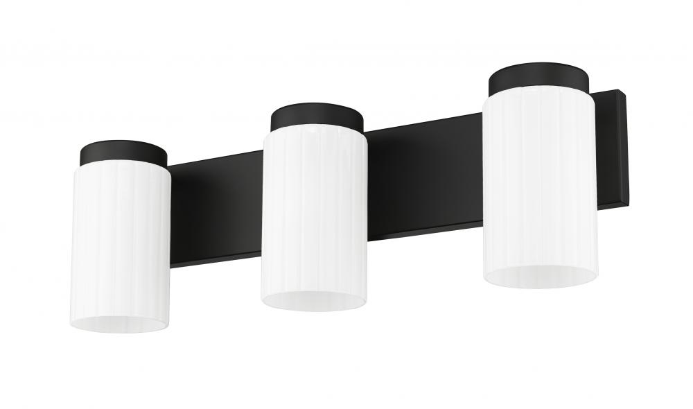 Rich matte black creates bold contrast and depth for the clean-lined silhouette of this modern three-light vanity fixture. Its wide rectangular wall plate creates distinctive flair, while a trio of cylindrical shades are made from opal glass to softly diffuse illumination.