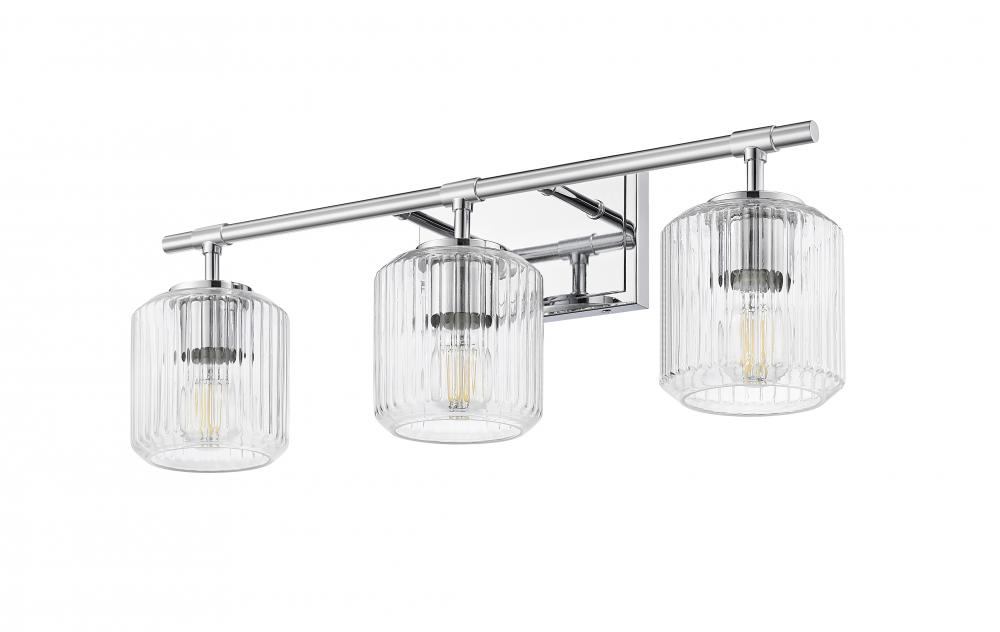A chrome finish frame gleams in the light of this modern three-light vanity bath light. It features a trio of clear ribbed glass shades that create a refreshing, sophisticated ambiance. The shades almost undulate in the light, creating the perfect dimensional finishing touch over your vanity.