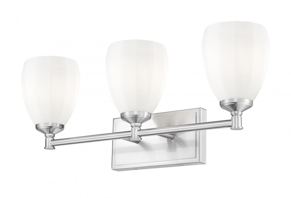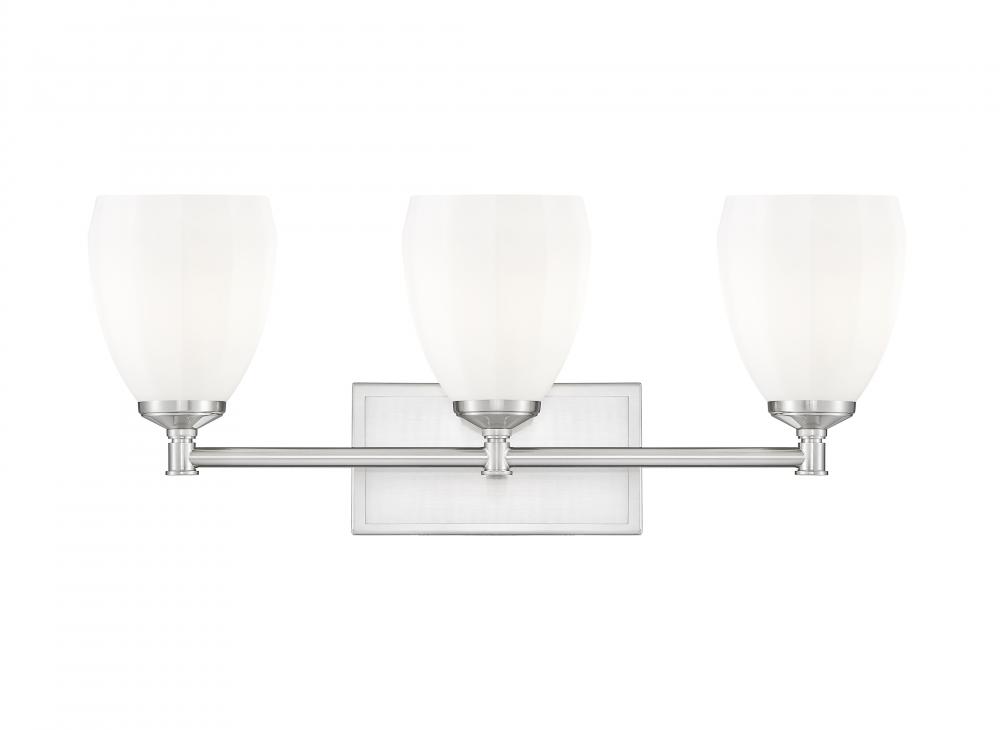 Refine your bathroom ambiance with the beauty and simple elegance of a modern three-light vanity wall light. Perfect for bright, diffused illumination, it features three tall, faceted matte opal glass shades that bring soft botanical flair. A brushed nickel finish gleams softly in the light and offers decorative versatility.