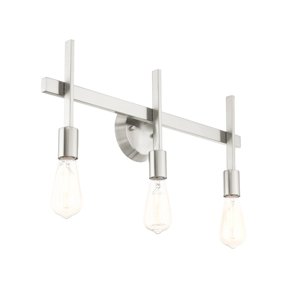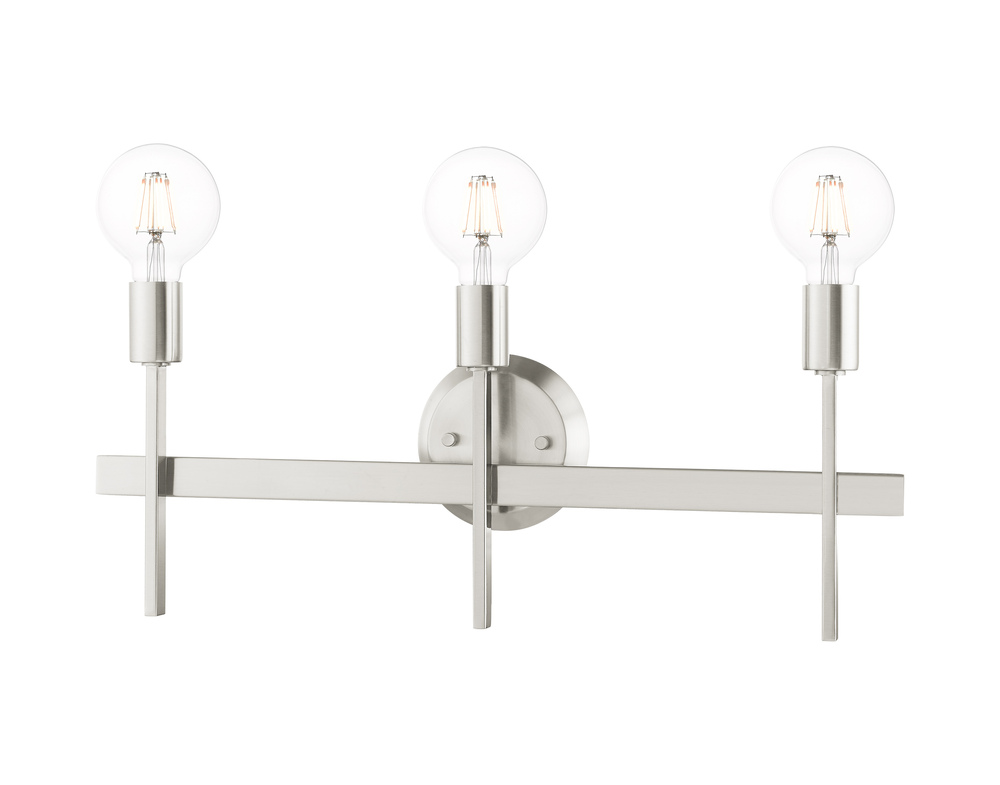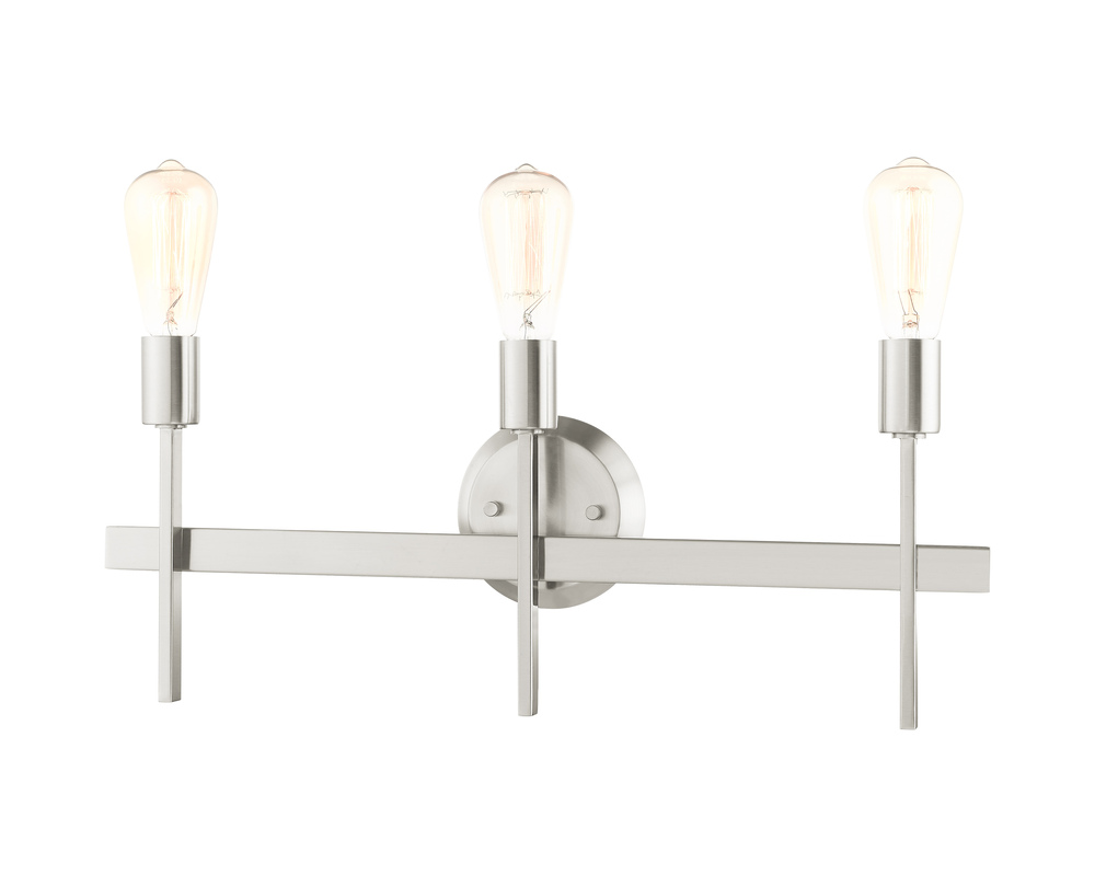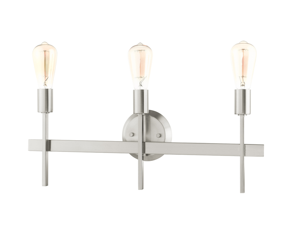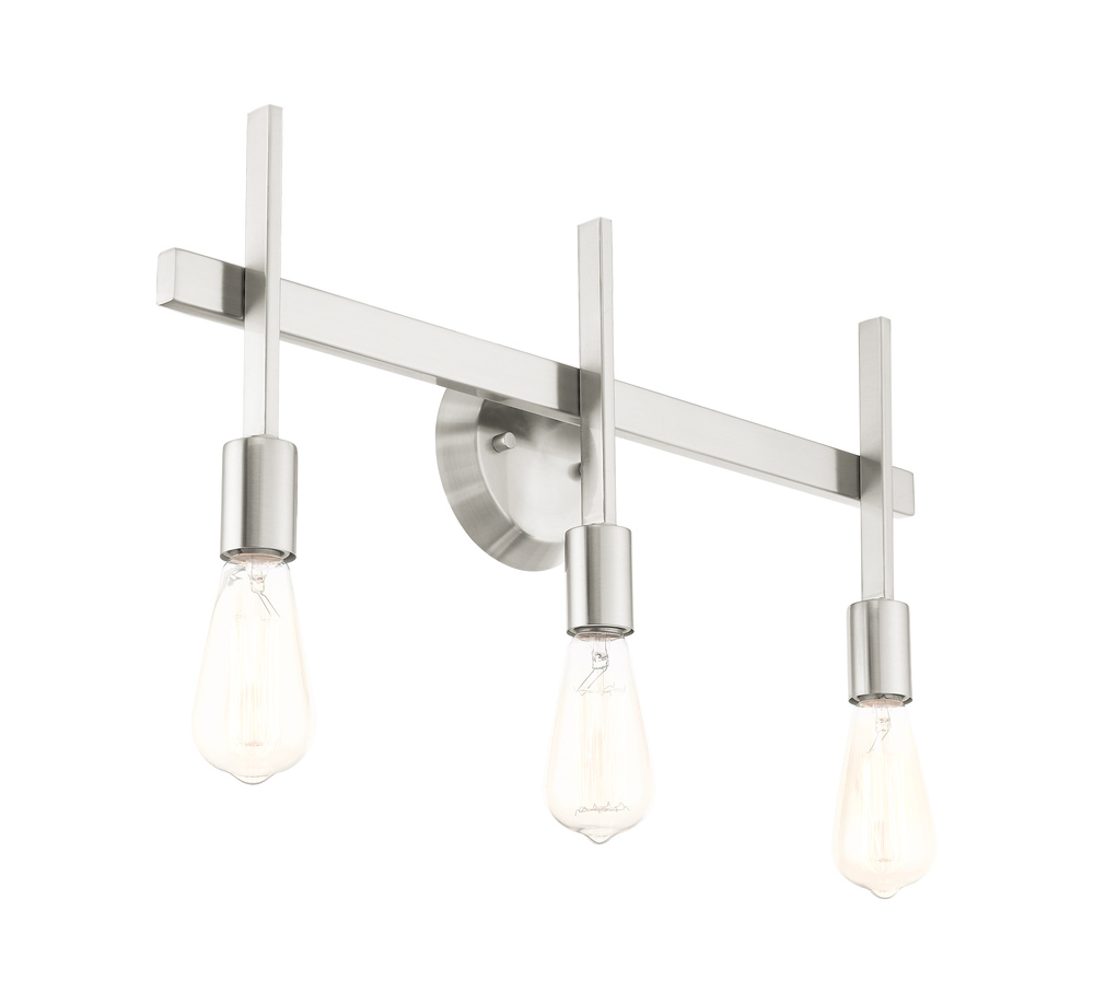 Clean lines and exposed bulb sockets make the Prague collection?perfect for your mid-mod or transitional bath. The eclectic look is perfect for spaces wanting an urban, minimalistic or industrial touch. With superb craftsmanship and affordable price, this brushed nickel three-light vanity sconce is sure to tastefully indulge your extravagant side.