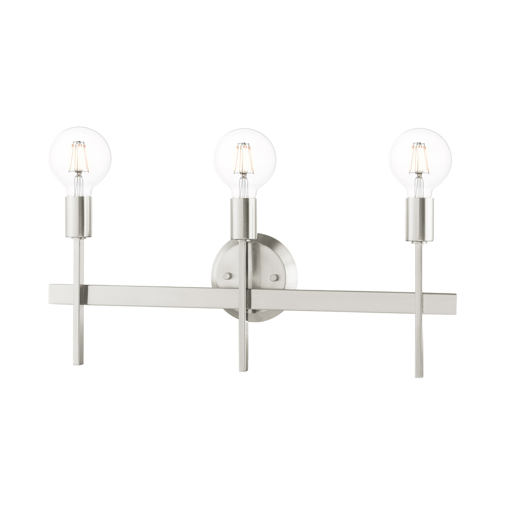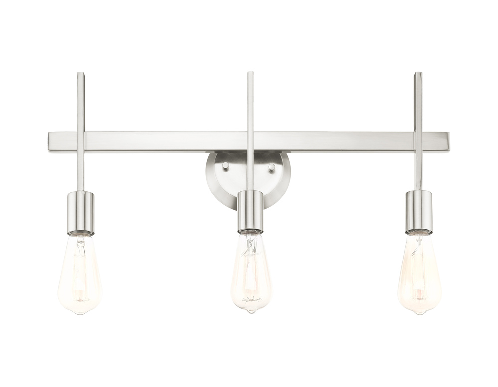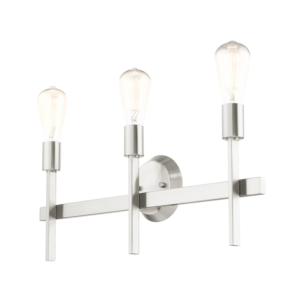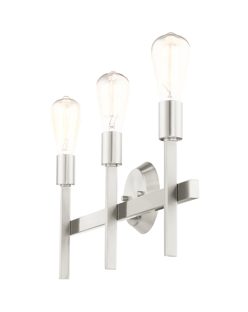 Clean lines and exposed bulb sockets make the Prague collection?perfect for your mid-mod or transitional bath. The eclectic look is perfect for spaces wanting an urban, minimalistic or industrial touch. With superb craftsmanship and affordable price, this brushed nickel three-light vanity sconce is sure to tastefully indulge your extravagant side.