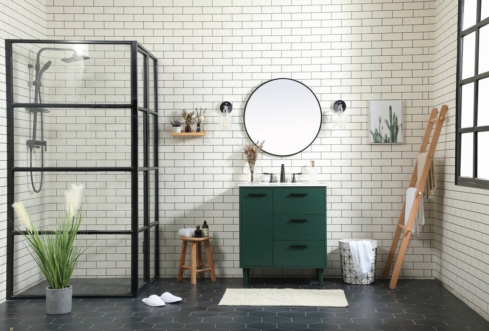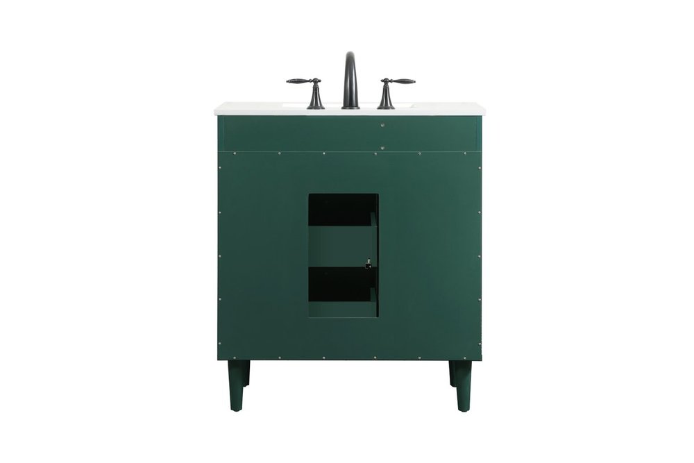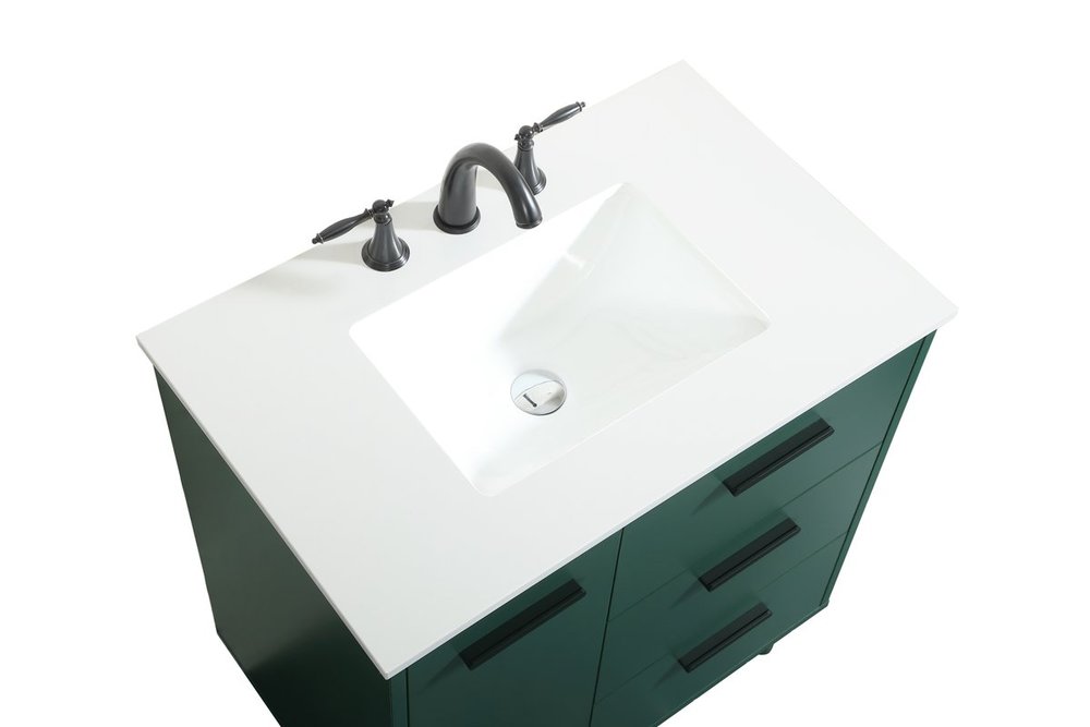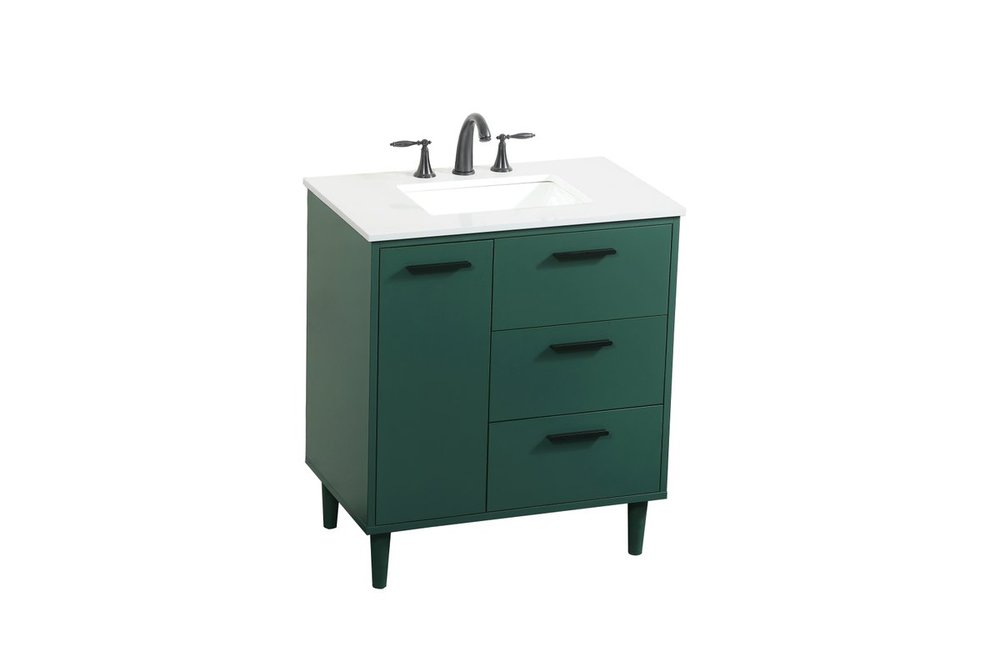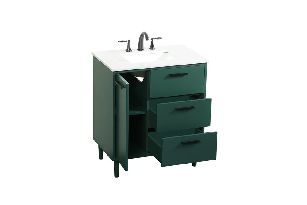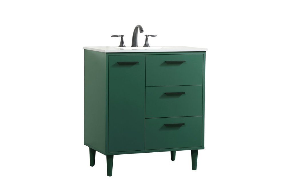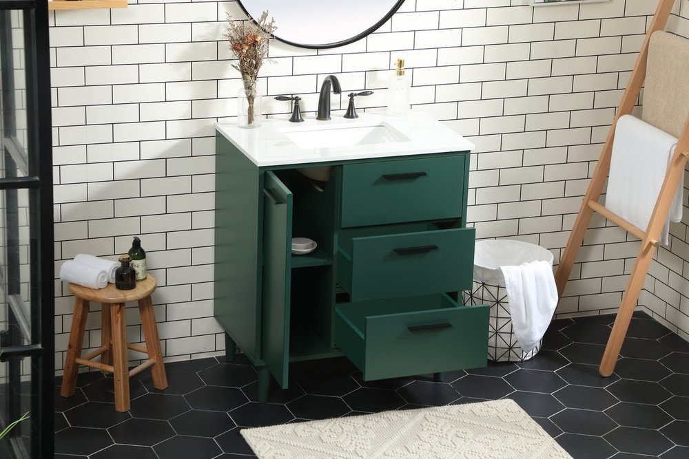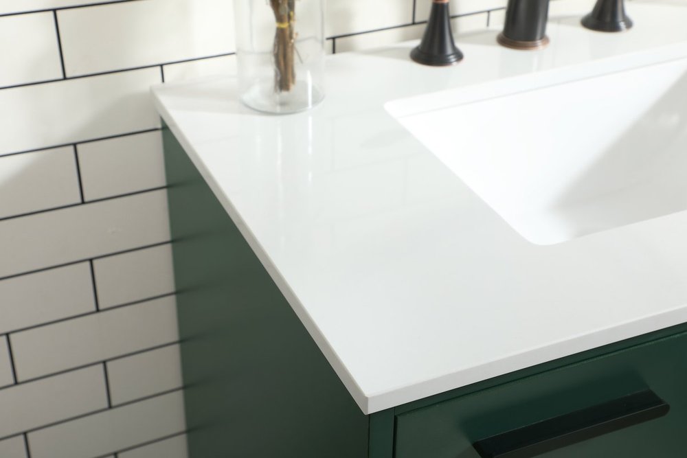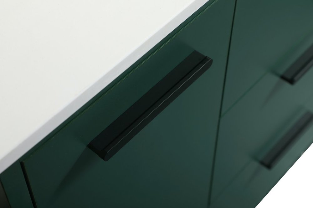 Modern sophistication is defined with the green finish and black barpulls of this vanity and slender tapered legs. Its length makes it the perfect addition to any sized home, and saves space with its storage area hidden behind the Single cabinet door and two bottom drawers. Topped with a highly durable engineered stone countertop and a porcelain undermount sink, this modern design will become your focal point of your bathroom or powder room. Equipped with soft-closing drawer and doors adds a quiet functional touch.