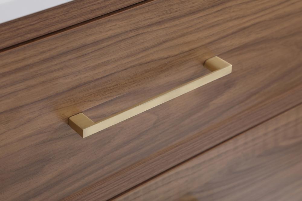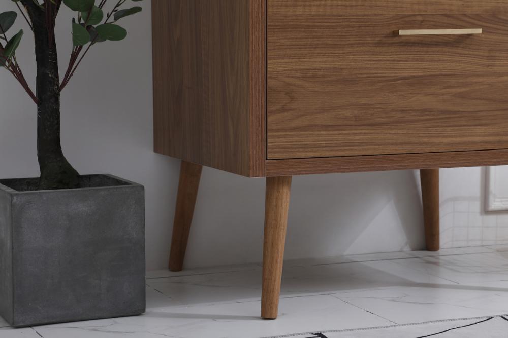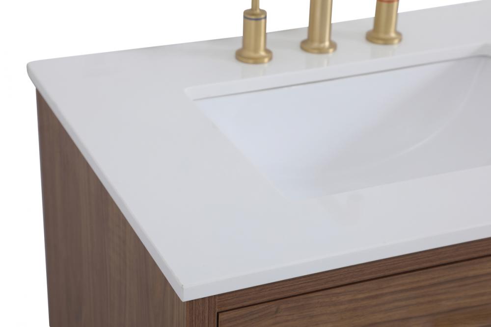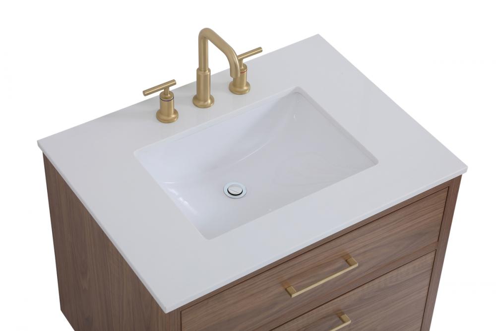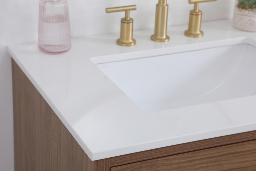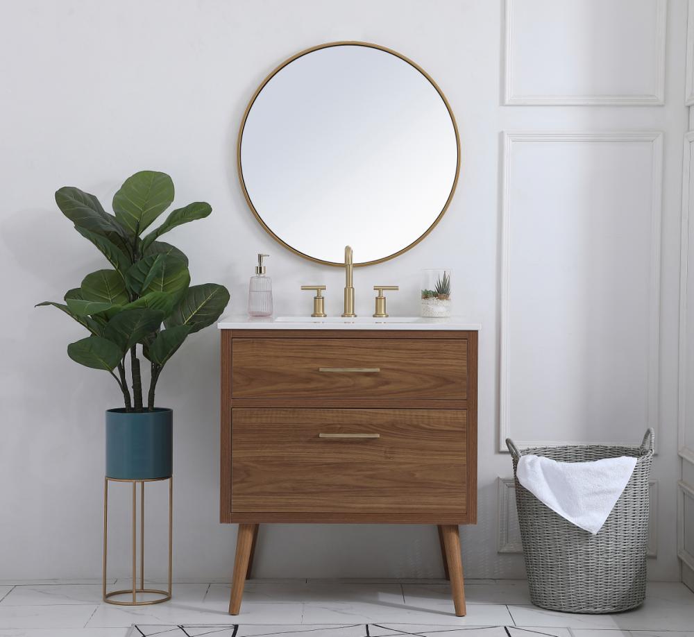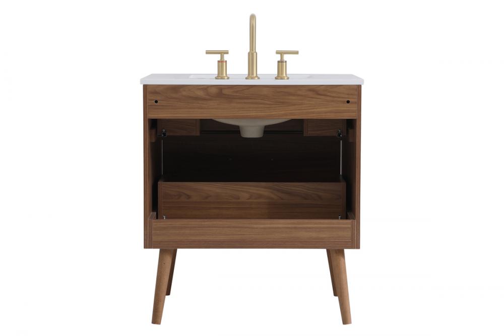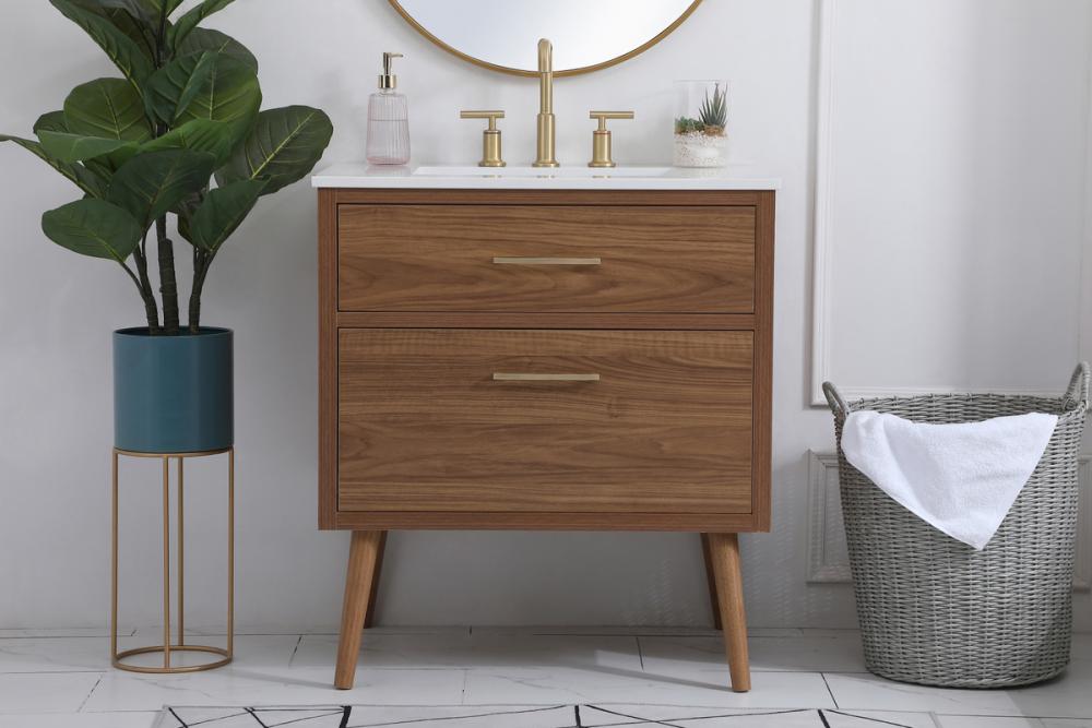 Delve into a world of minimalistic fashion and contemporary styling with this midcentury modern 30" vanity. The clean lines anchors the design, while the oblique tapered cylinder legs add subtle interest. However, the artful juxtaposition creates a blend of bright modernity and classical traditions. A gold handle adorns the top fake drawer hiding the base of the undermount porcelain sink while another one allows you to pull the bottom drawer out, letting you store your bathroom necessities and toiletries. The compact size makes it the perfect vanity for any bathroom or powder room, regardless of size.