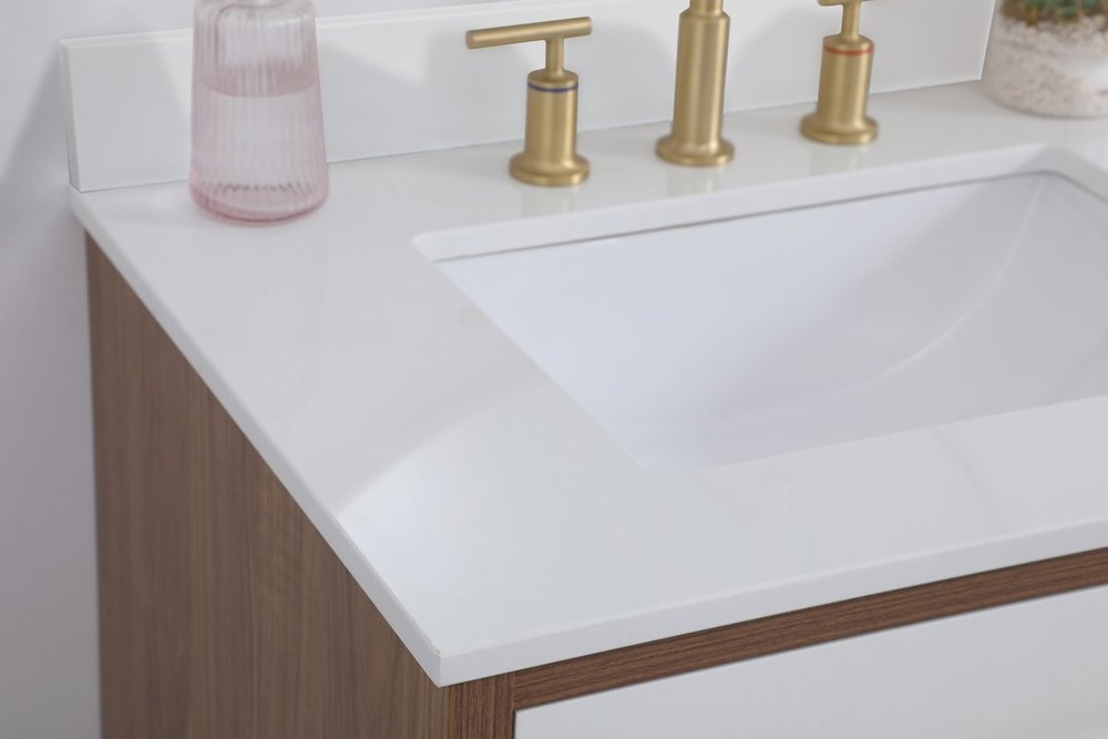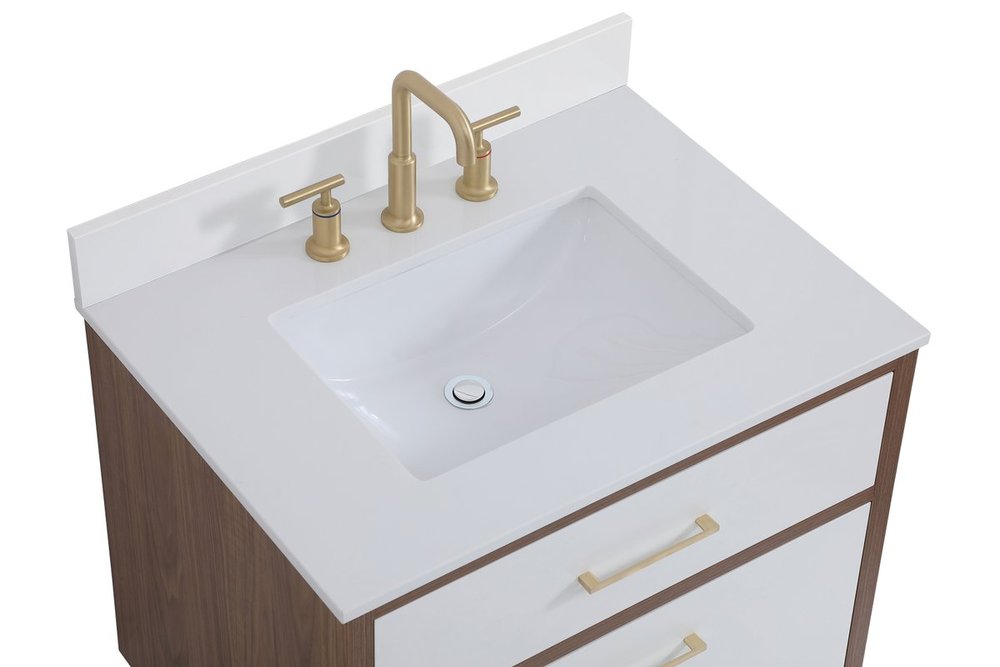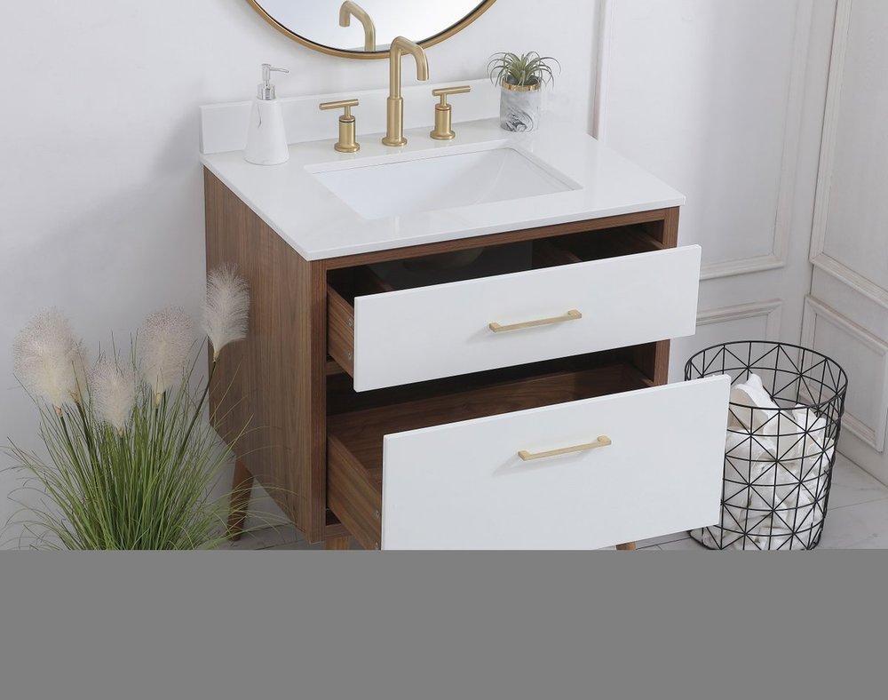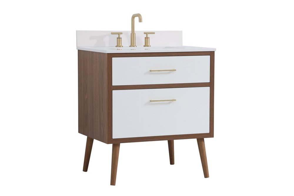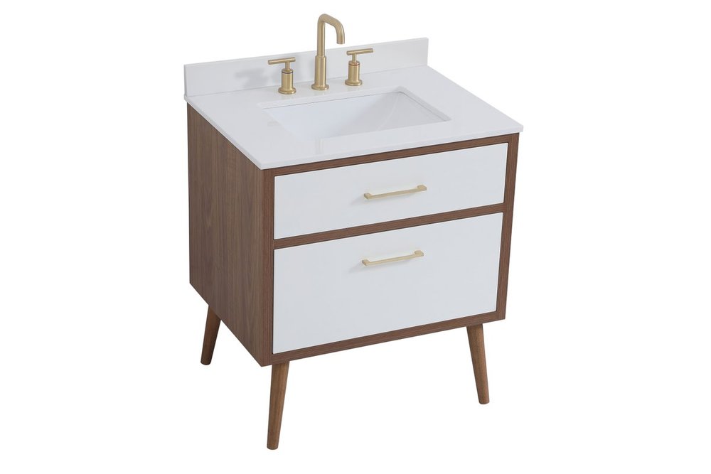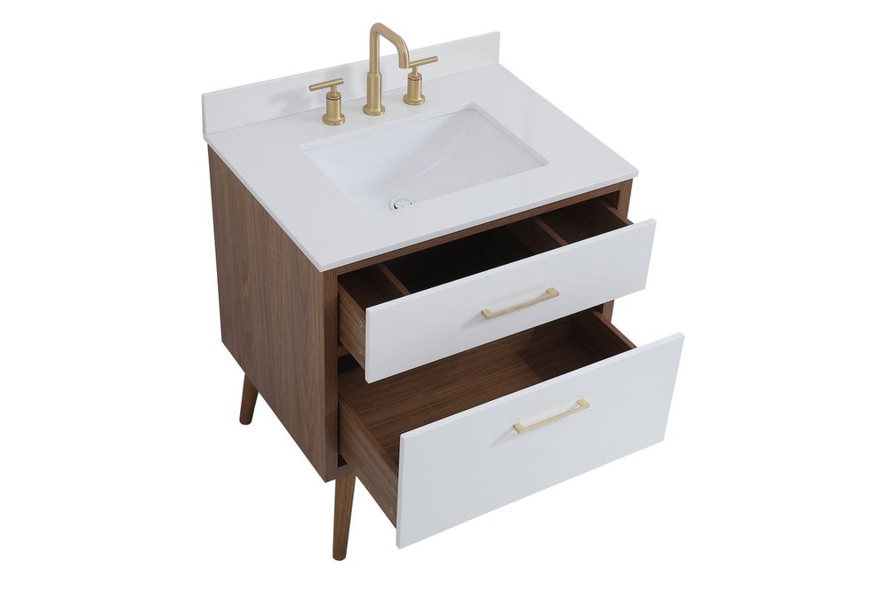 Delve into a world of minimalistic fashion and contemporary styling with this midcentury modern 30" vanity. The clean lines anchors the design, while the oblique tapered cylinder legs add subtle interest. However, the artful juxtaposition between the walnut brown and matte white creates a blend of bright modernity and classical traditions. A gold handle adorns the top fake drawer hiding the base of the undermount porcelain sink while another one allows you to pull the bottom drawer out, letting you store your bathroom necessities and toiletries. The compact size makes it the perfect vanity for any bathroom or powder room, regardless of size. Comes with a matching backsplash to complete the look and protects your wall.