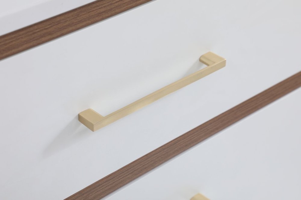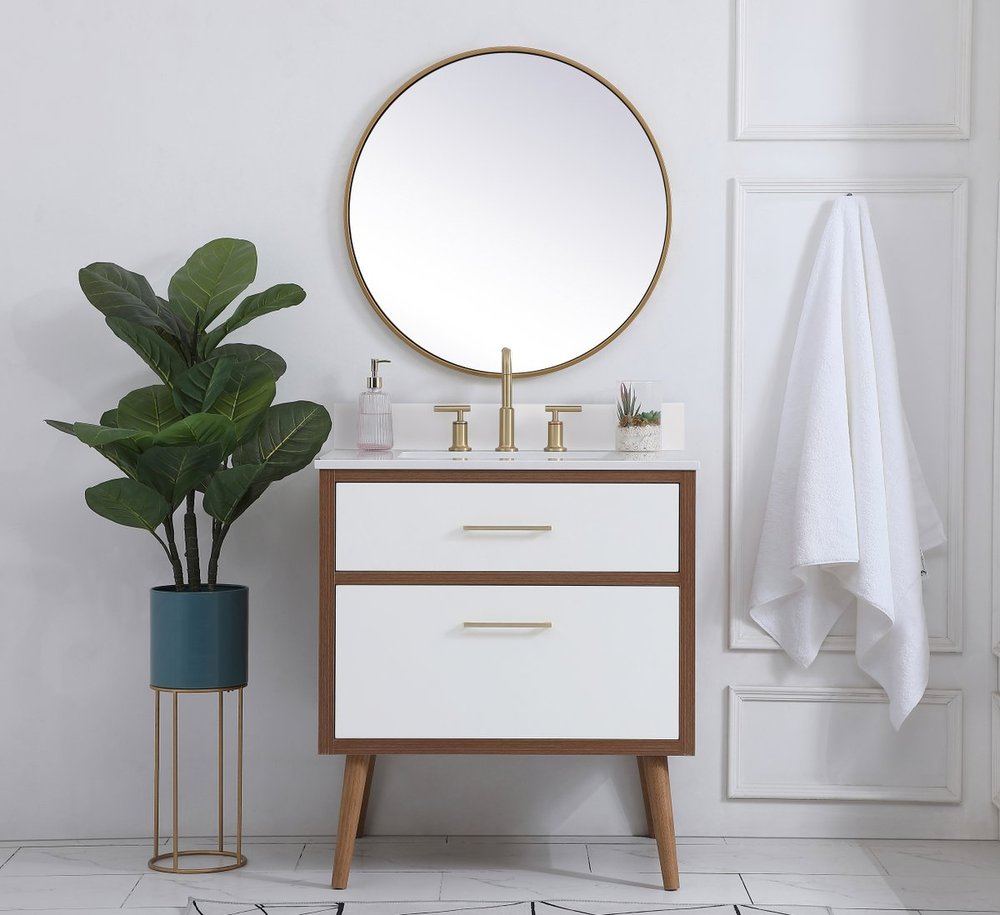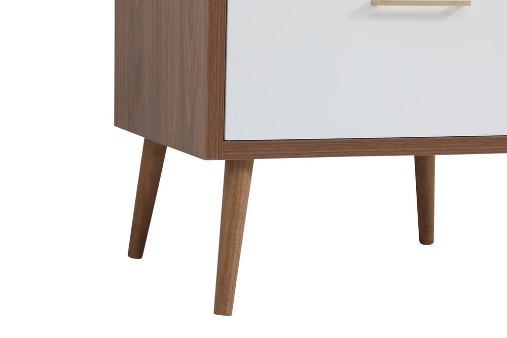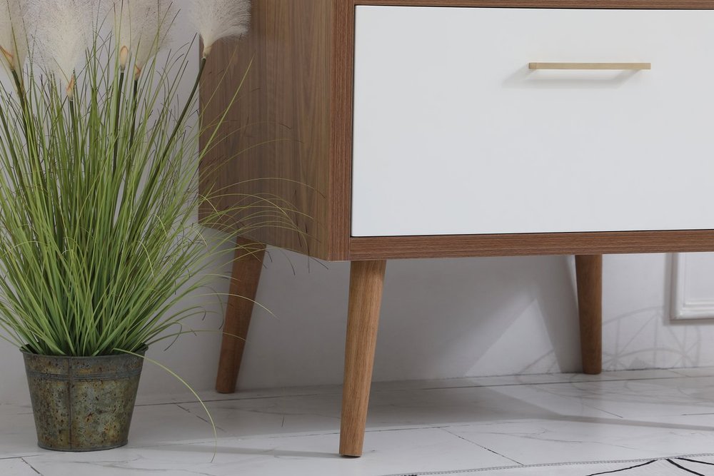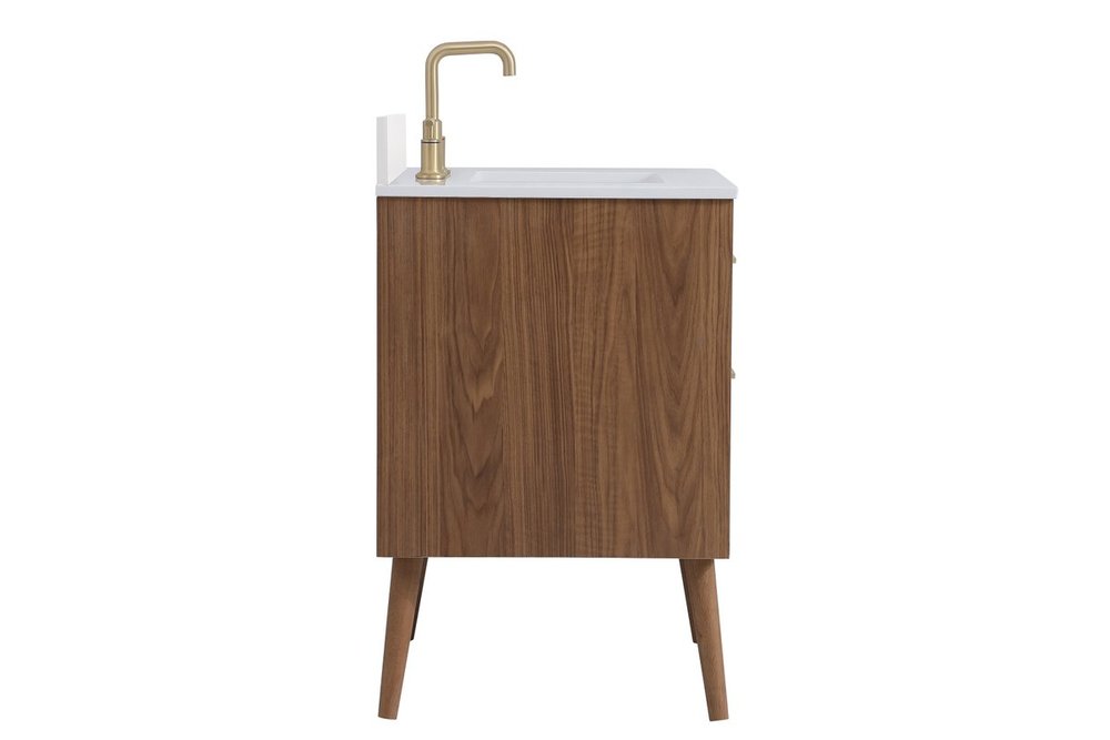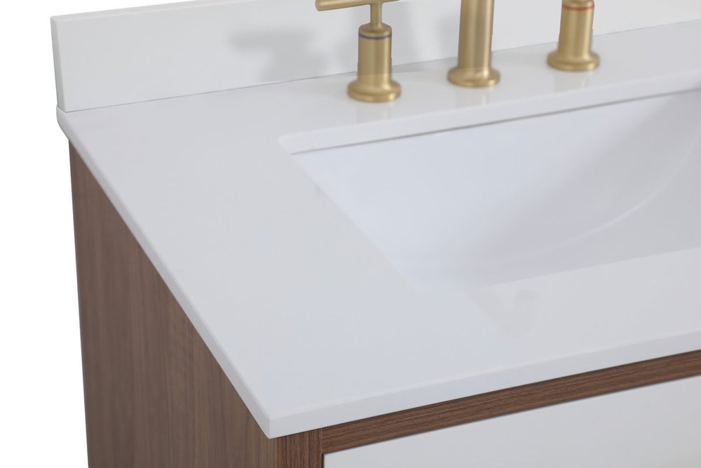 Delve into a world of minimalistic fashion and contemporary styling with this midcentury modern 30" vanity. The clean lines anchors the design, while the oblique tapered cylinder legs add subtle interest. However, the artful juxtaposition between the walnut brown and matte white creates a blend of bright modernity and classical traditions. A gold handle adorns the top fake drawer hiding the base of the undermount porcelain sink while another one allows you to pull the bottom drawer out, letting you store your bathroom necessities and toiletries. The compact size makes it the perfect vanity for any bathroom or powder room, regardless of size. Comes with a matching backsplash to complete the look and protects your wall.