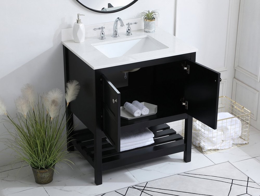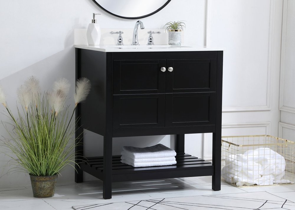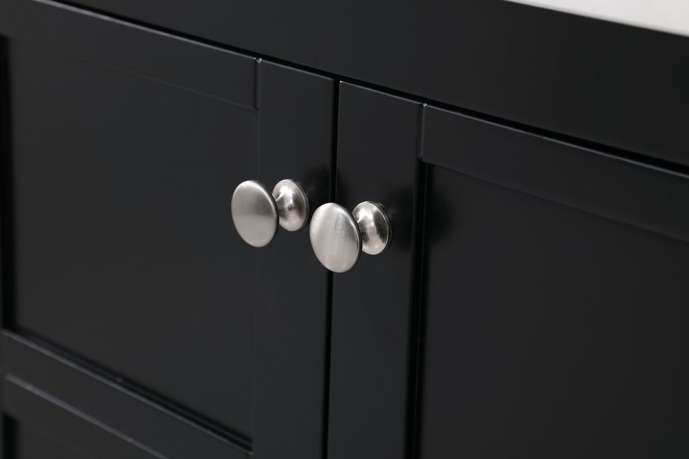The subtle beauty of the Theo collection 30" vanity in a black finish exudes comfortable luxury. Its modern, yet traditional beauty will surely dress up your bathroom or powder room without any fuss. The white stone countertop and porcelain undermount sink shows quiet opulence, and the legs support upright without fail. Brushed Nickel hardware complements the trendy black finish, with pulls adorning the two cabinet doors, showcasing ample storage space within. Slated shelf allows for additional space to organize your towels. Whether this vanity is in your bathroom or for guests, its presence will surely elevate the aesthetics of your room. Comes with a matching backsplash to complete the look and protects your wall.