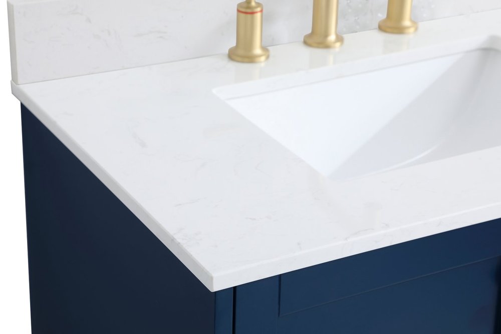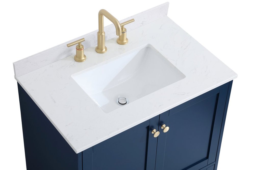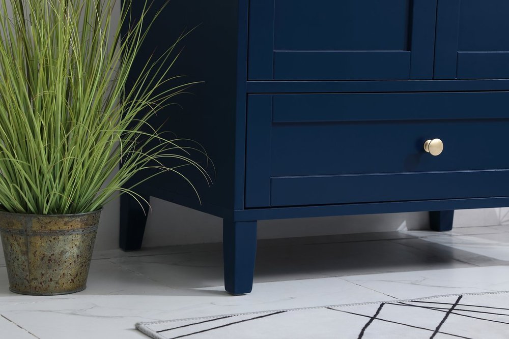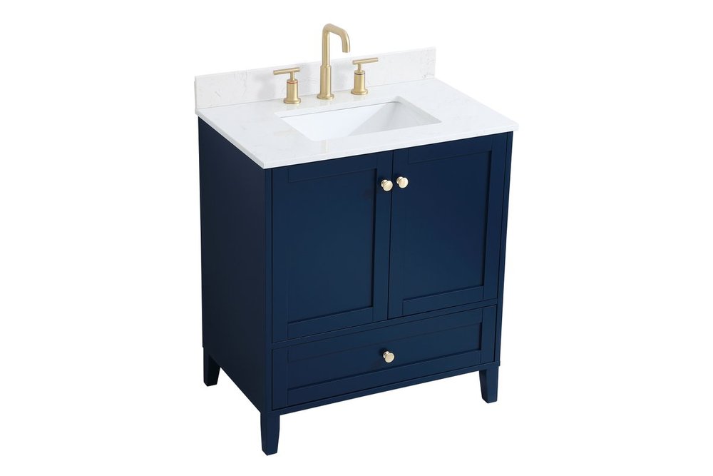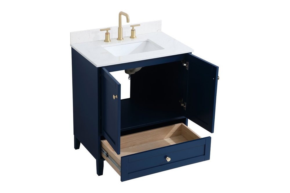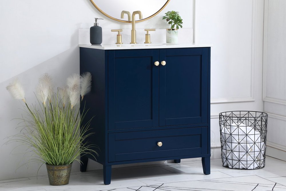 While unassuming, this 30" vanity in a Blue finish sure knows how to redefine luxury. The sleek gold knobs adorn the two cabinet doors and base drawer which allows you to store your bathroom toiletries and necessities. Standing strong on oblique legs and dressed with a calacatta engineered marble countertop, this vanity will surely create beauty and casual elegance in your bathroom or powder room. Comes with a matching backsplash to complete the look and protects your wall.