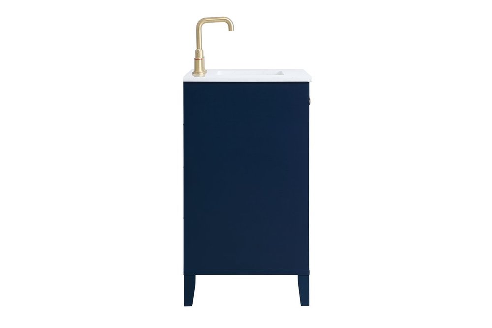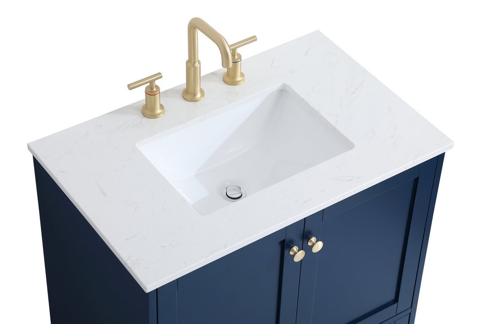 While unassuming, this 30" vanity in a Blue finish sure knows how to redefine luxury. The sleek gold knobs adorn the two cabinet doors and base drawer which allows you to store your bathroom toiletries and necessities. Standing strong on oblique legs and dressed with a calacatta engineered marble countertop, this vanity will surely create beauty and casual elegance in your bathroom or powder room.