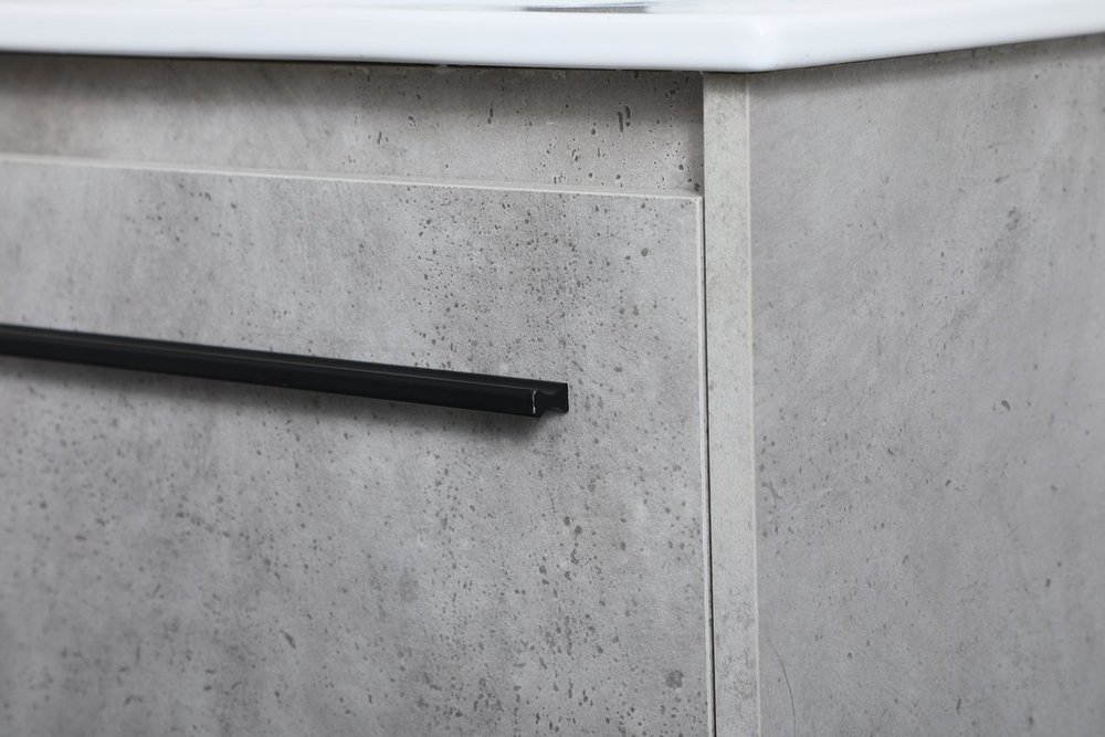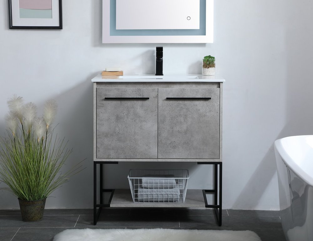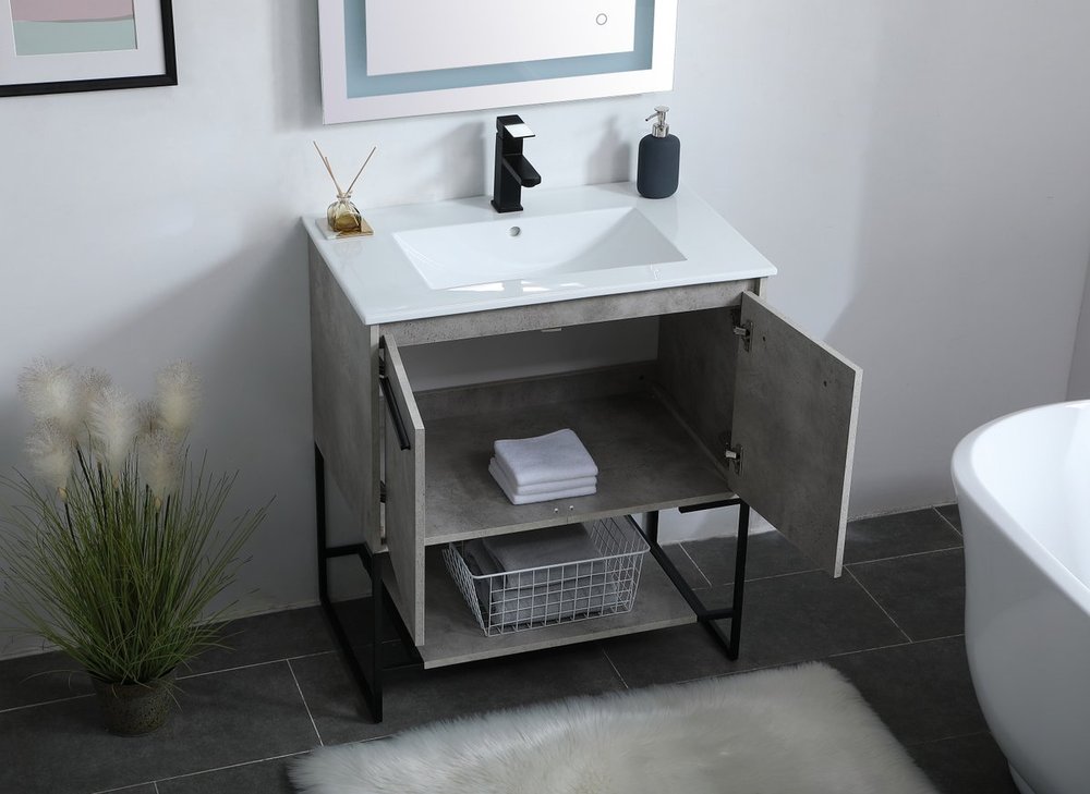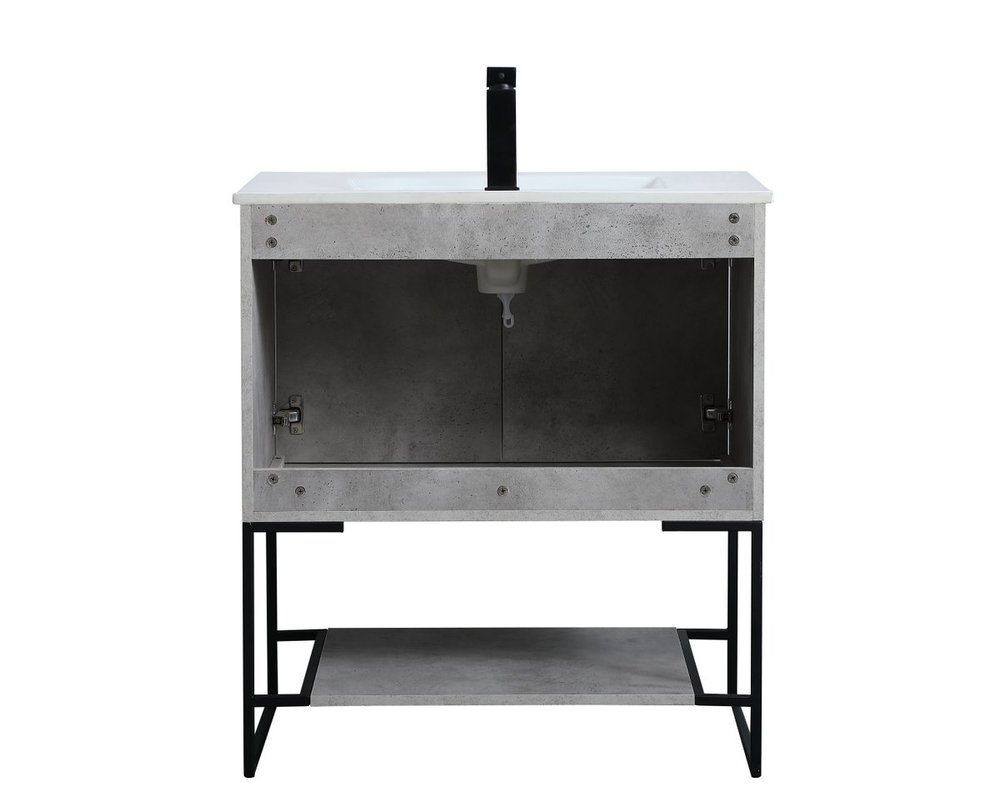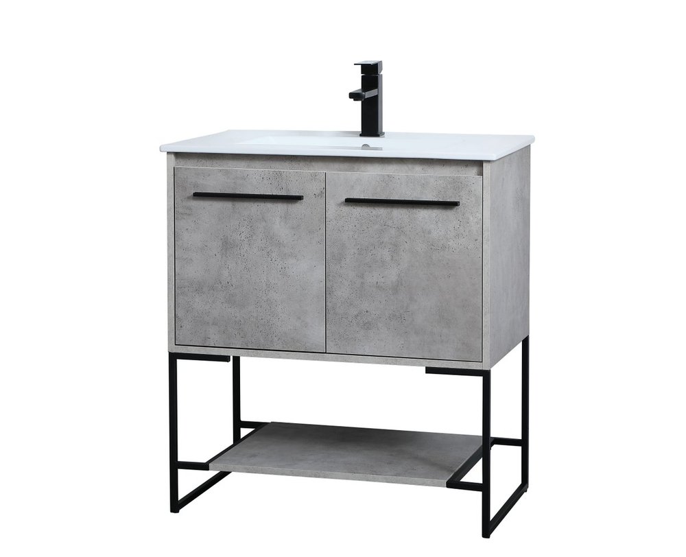 Live in modern comfort with this 30" concrete grey finish vanity. Dressed in a concrete grey and sleek black metal hardware, its contemporary style will have your bathroom or powder room elevated in industrial sophistication. The open shelf at the base and two doors reveal ample storage space for your bathroom essentials and miscellany. Clean lines create its own visual interest, adding trendy looks to your already chic room.