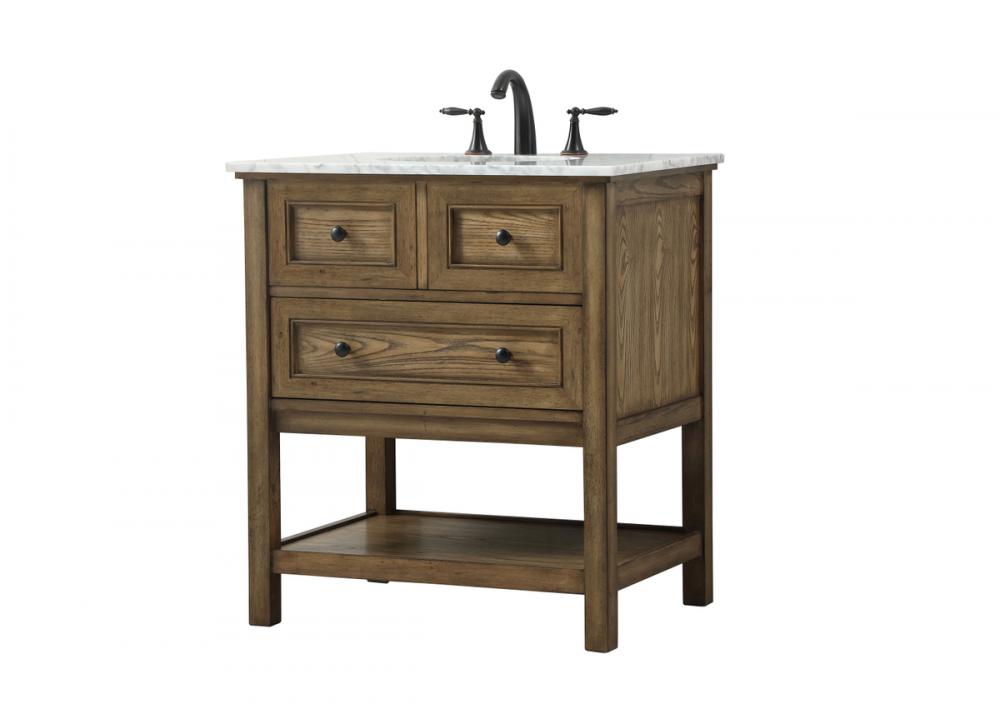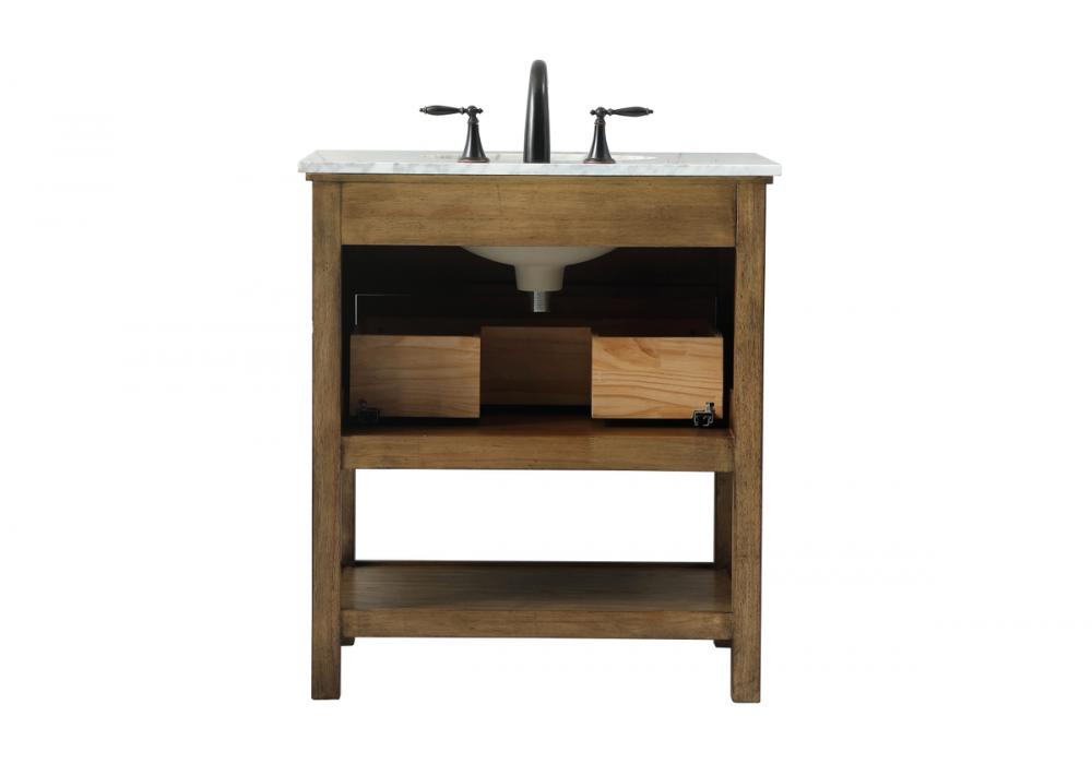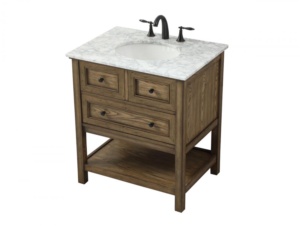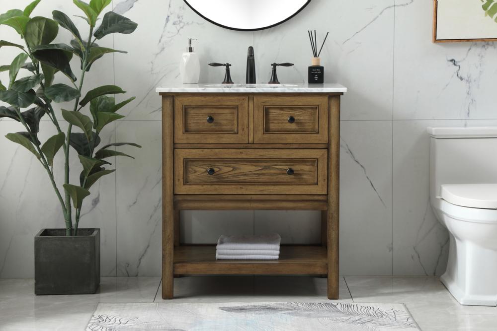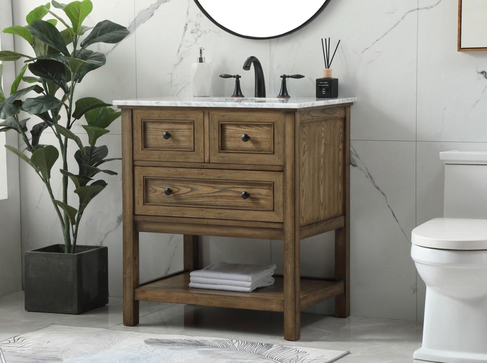 Clean lines and classic form can truly add a fresh look to your bathroom or powder room. This vanity, complemented by round hardware, will surely charm you with its confident style and subtle charisma. This vanity can store all of your bathroom toiletries, from extra towels to make up essentials. The vanity is crowned with carrara white marble and includes a porcelain undermount sink--adding both function and form that will truly amaze.