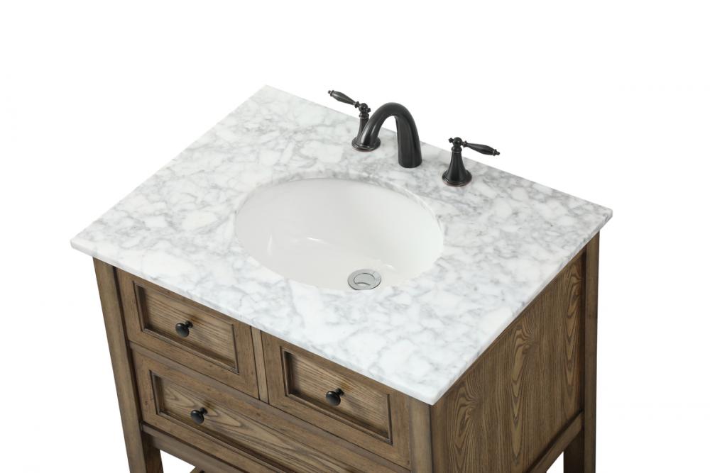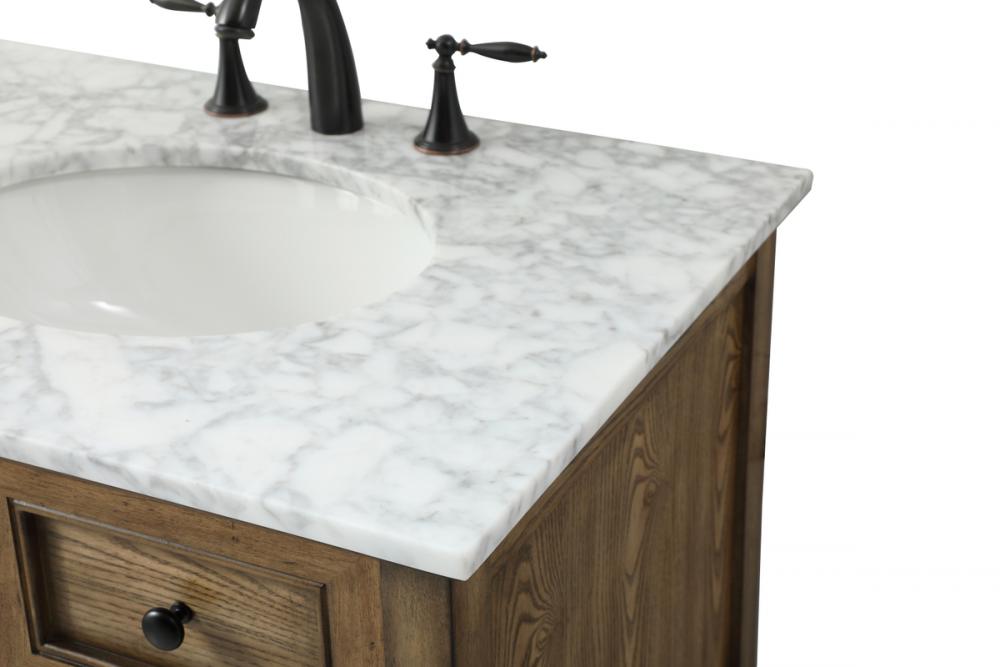 Comes with an undermount porcelain sink and a carrara white marble countertop
