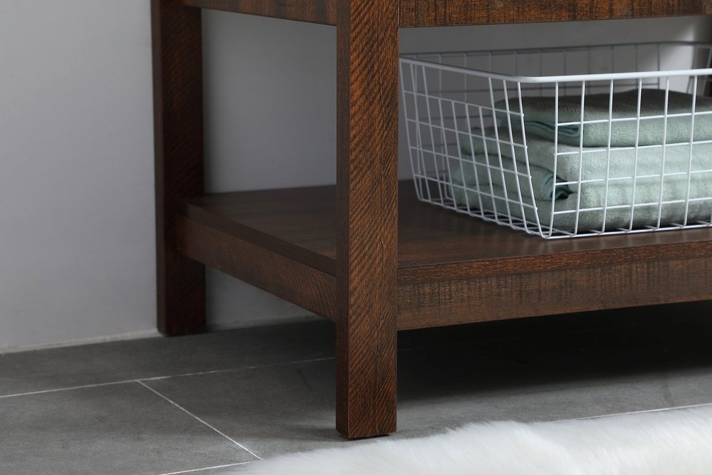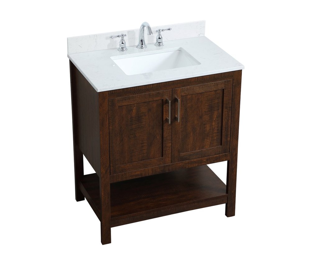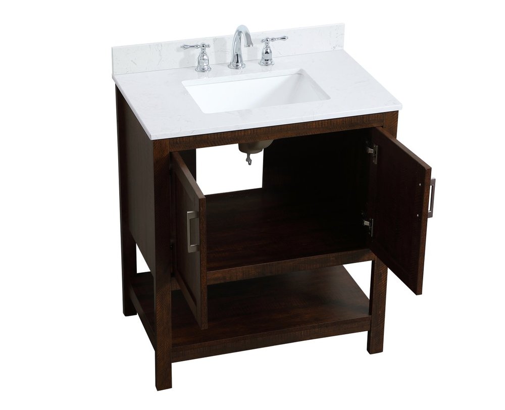 The nonchalant attitude of this 30" traditional espresso finish vanity will have you wanting more. The slender brushed nickel handle bars open the two cabinet doors to reveal ample storage space to put away and store bathroom essentials, and the open space below allows for you to place clean towels on the rack. Topped with a Calacatta engineered marble countertop, you and your guests will enjoy this easy going vanity. Comes with a matching backsplash to complete the look and protects your wall.