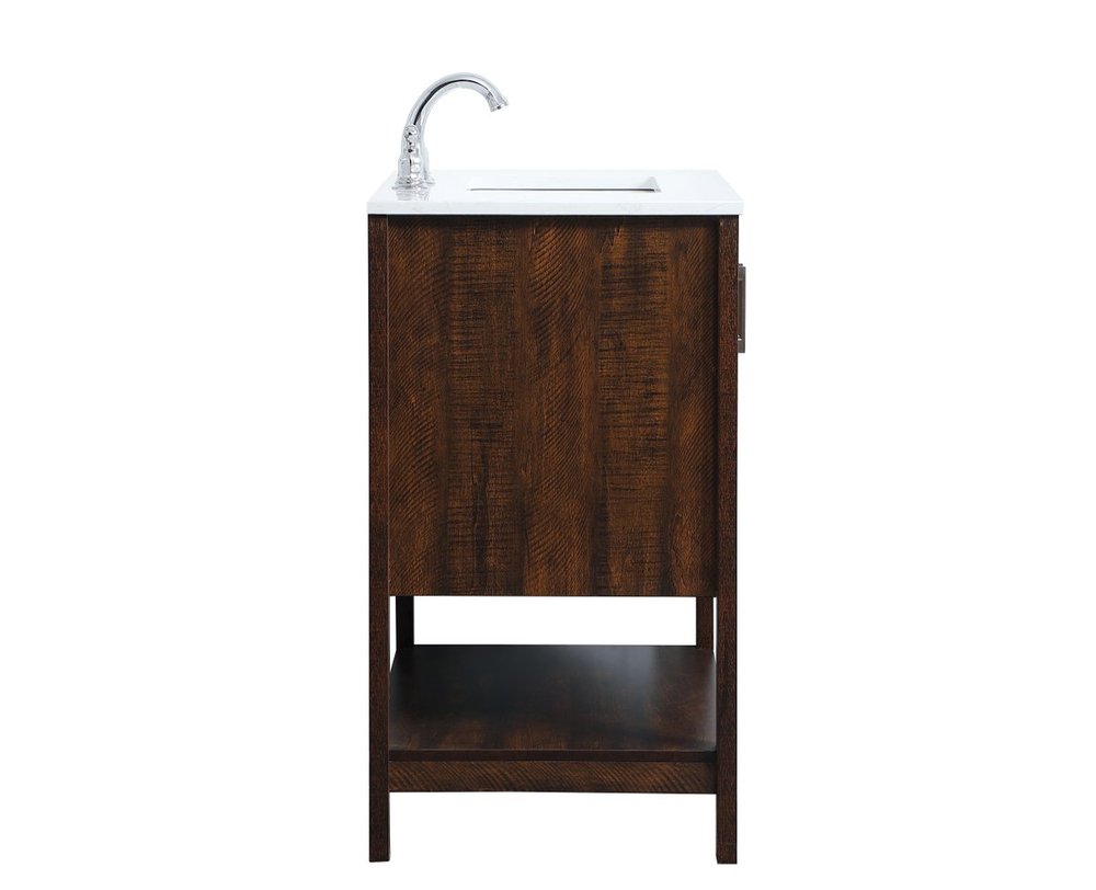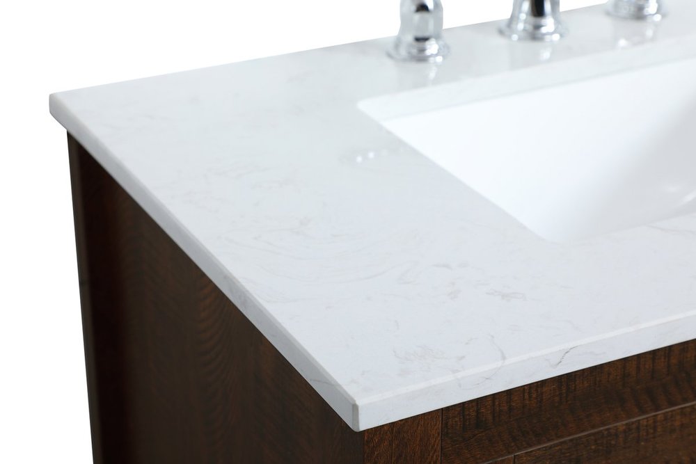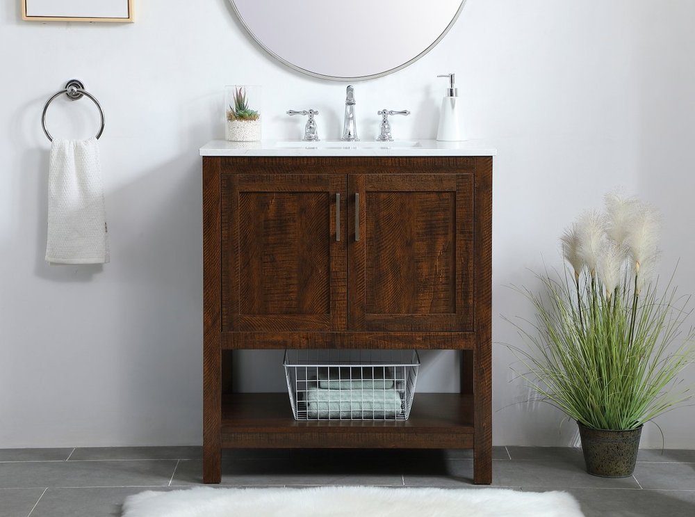 The nonchalant attitude of this 30" traditional espresso finish vanity will have you wanting more. The slender brushed nickel handle bars open the two cabinet doors to reveal ample storage space to put away and store bathroom essentials, and the open space below allows for you to place clean towels on the rack. Topped with a Calacatta engineered marble countertop, you and your guests will enjoy this easy going vanity.
