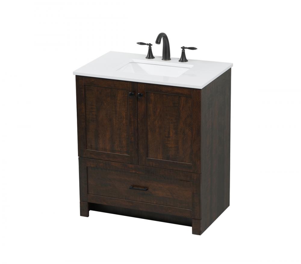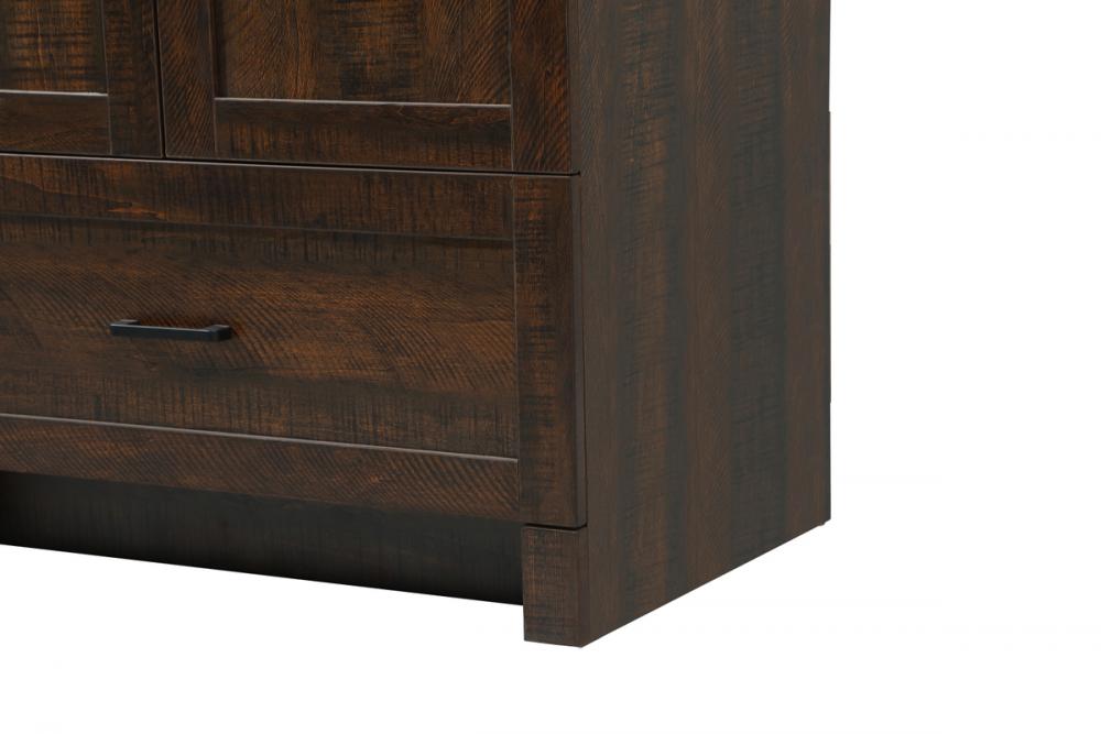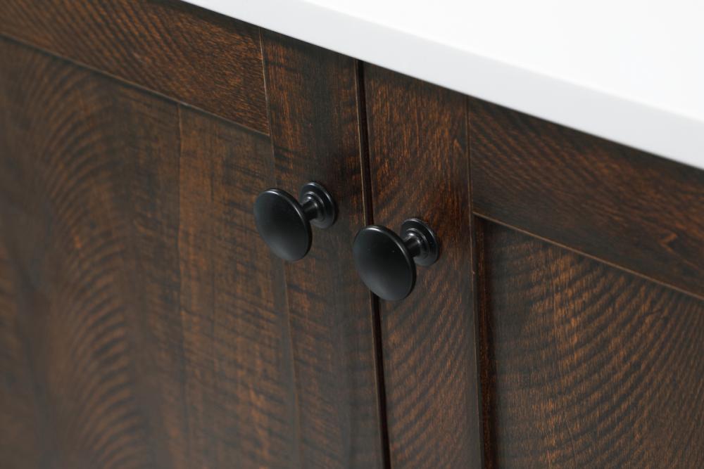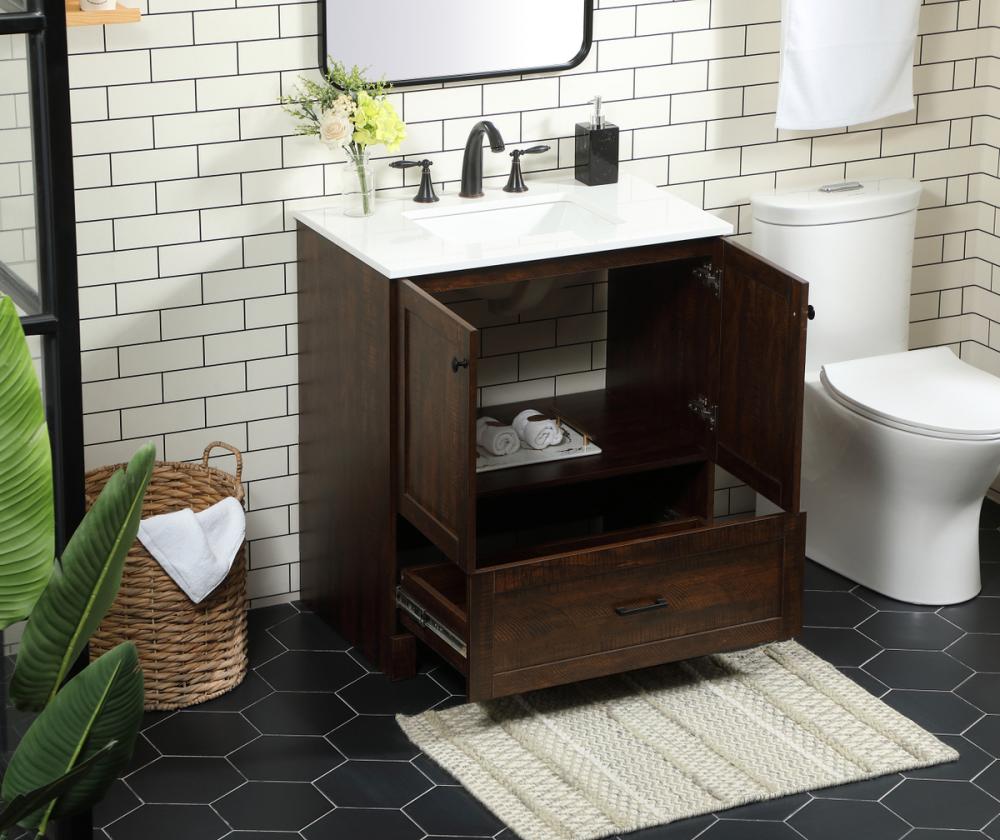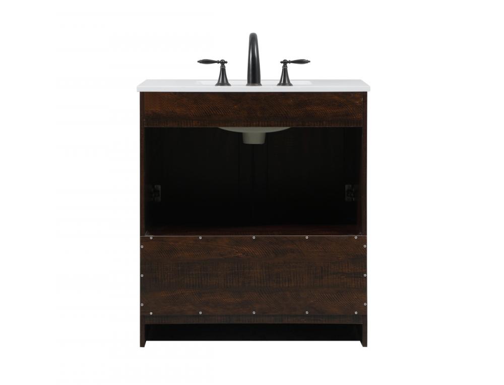 Delve into a world of minimalistic fashion and contemporary styling with this farmhouse 30" vanity. The clean faux lines anchors the weathered design. Black handle adorns the two doors hiding the base of the integrated porcelain sink while the bottom drawer allows you to store your bathroom necessities and toiletries. The compact size makes it the perfect vanity for any bathroom or powder room, regardless of size.