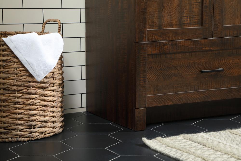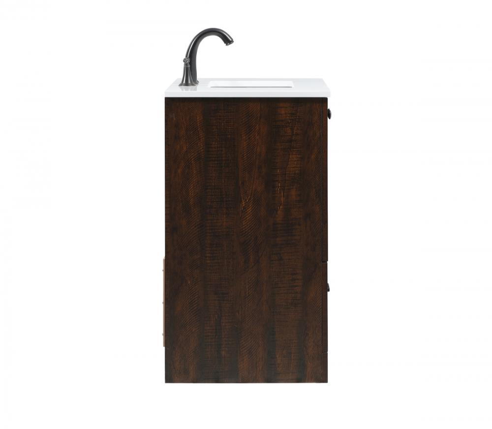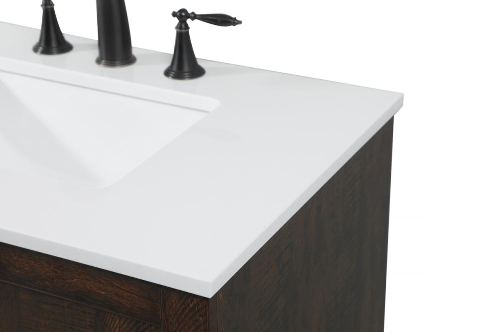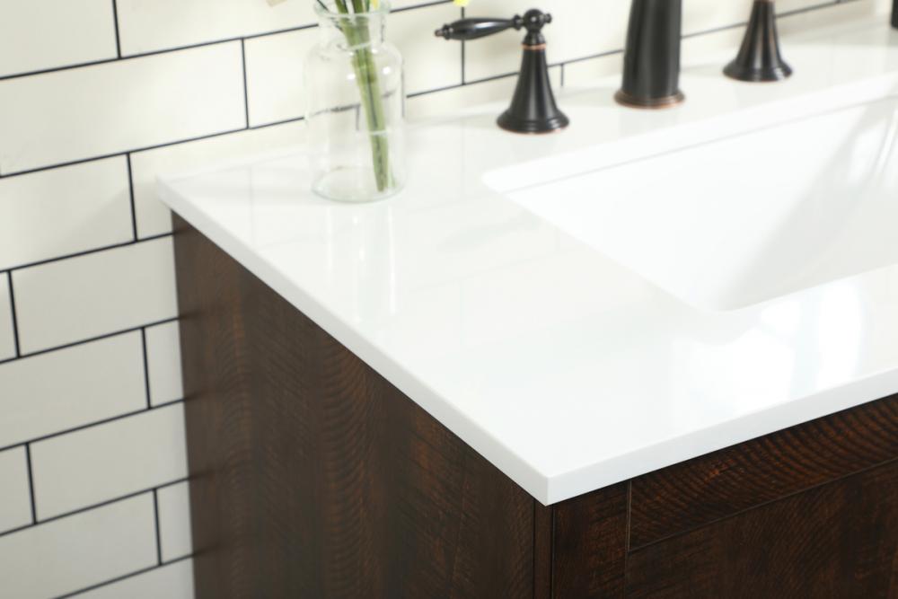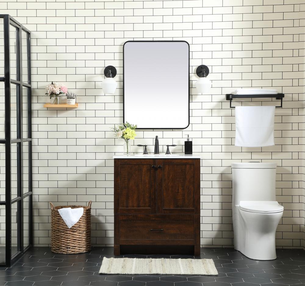Delve into a world of minimalistic fashion and contemporary styling with this farmhouse 30" vanity. The clean faux lines anchors the weathered design. Black handle adorns the two doors hiding the base of the integrated porcelain sink while the bottom drawer allows you to store your bathroom necessities and toiletries. The compact size makes it the perfect vanity for any bathroom or powder room, regardless of size.