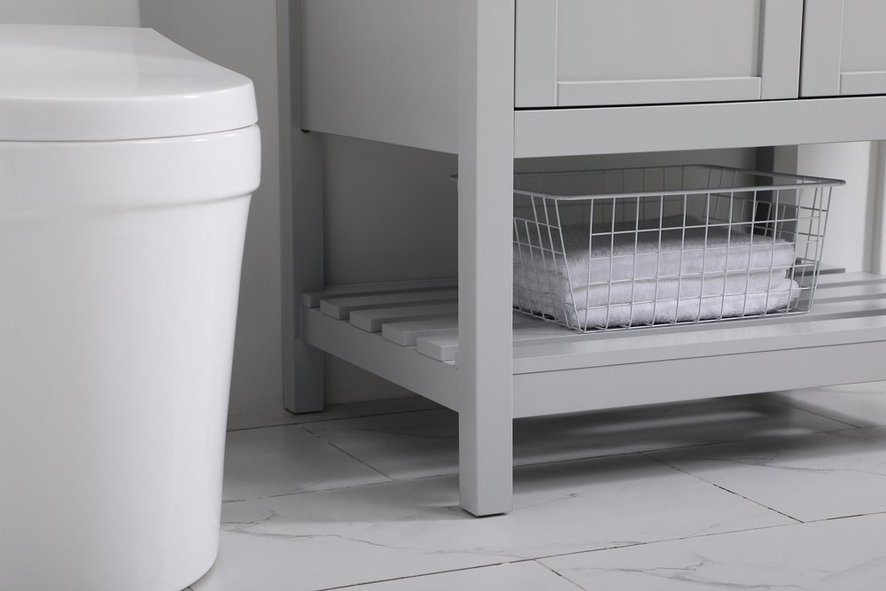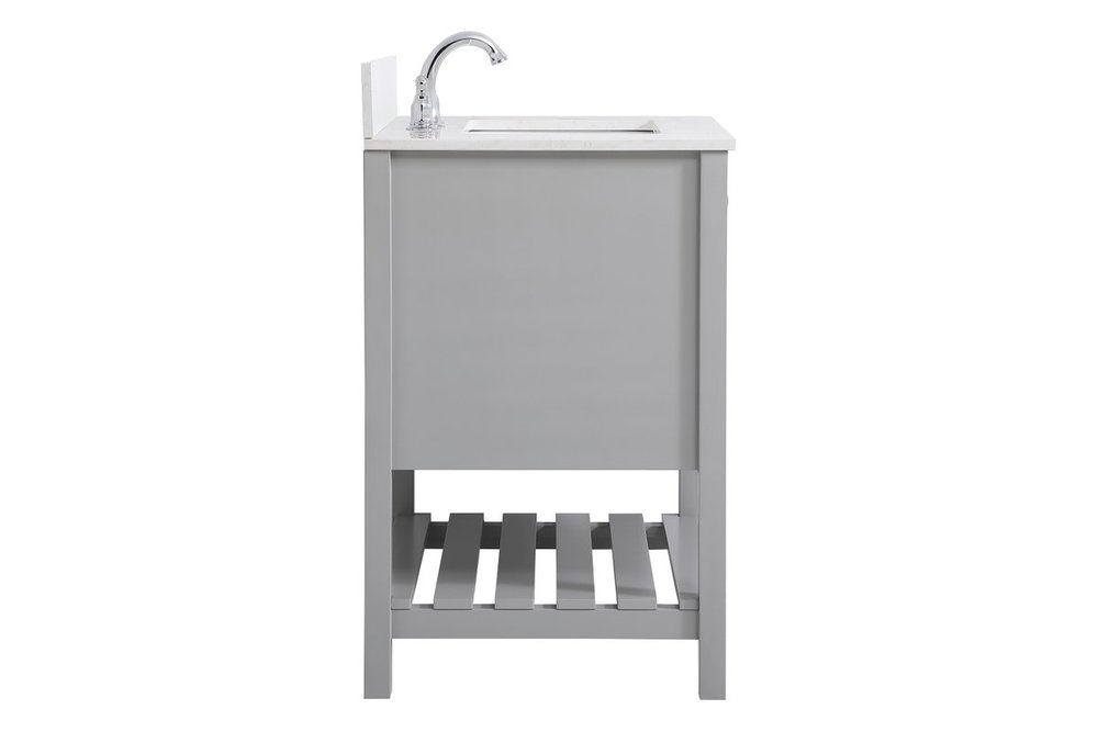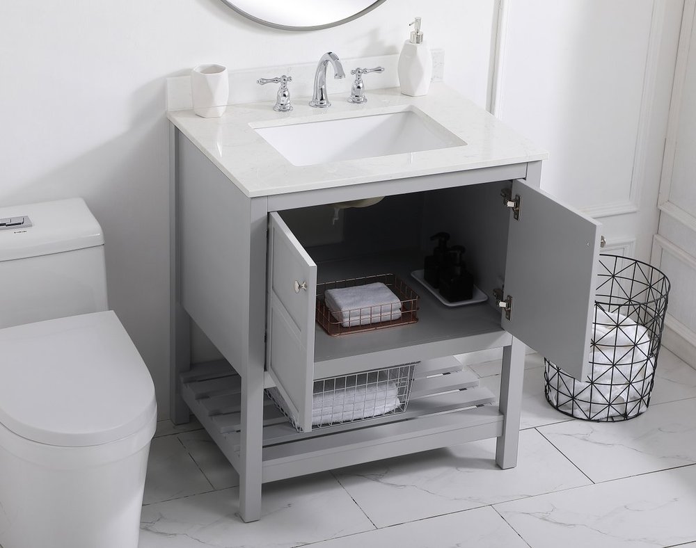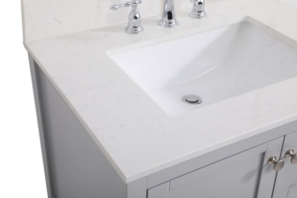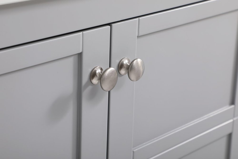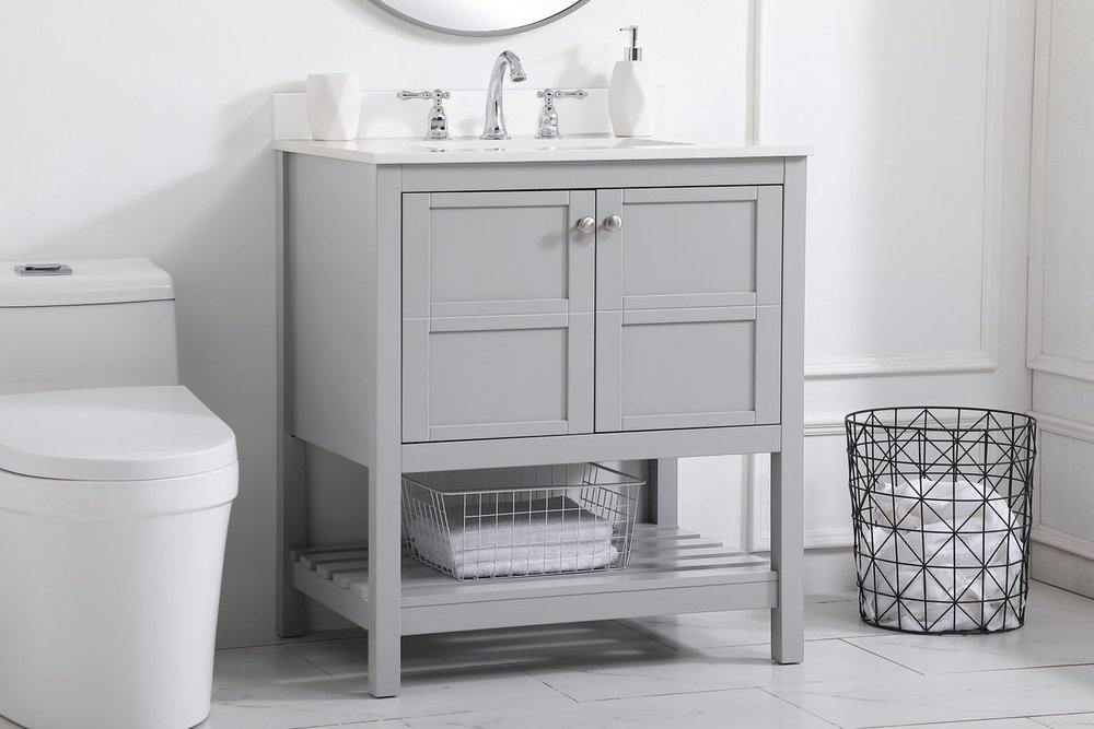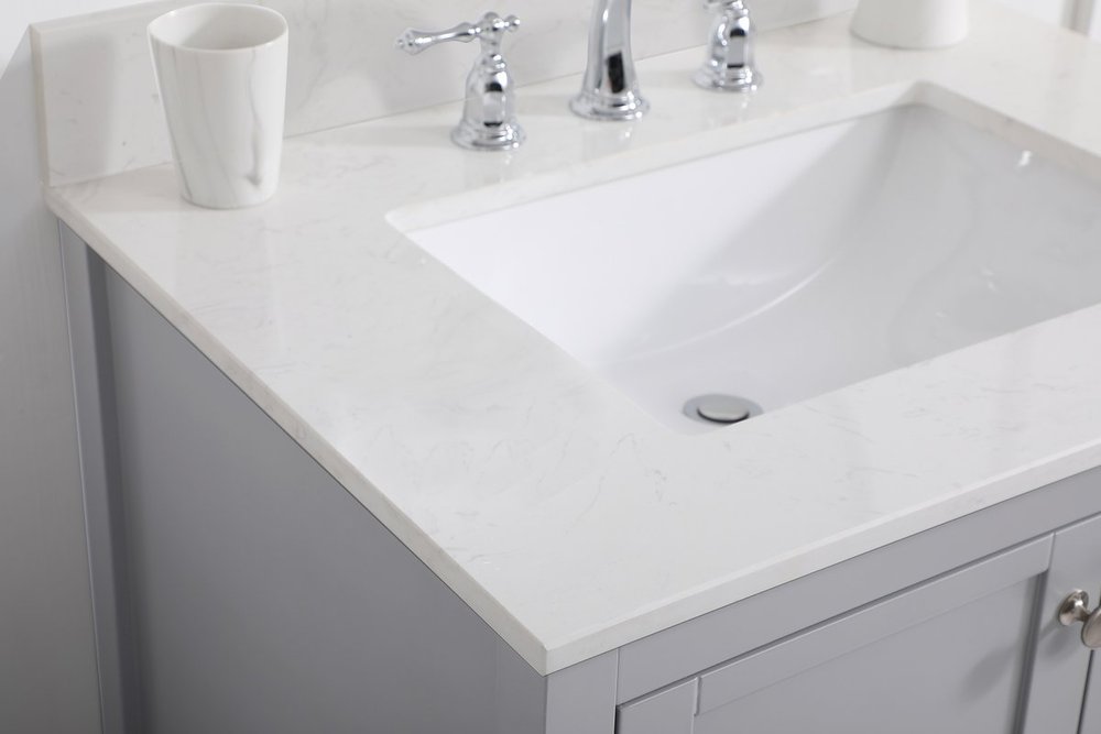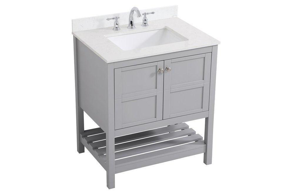 The subtle beauty of the Theo collection 30" vanity in a gray finish exudes comfortable luxury. Its modern, yet traditional beauty will surely dress up your bathroom or powder room without any fuss. The white stone countertop and porcelain undermount sink shows quiet opulence, and the legs support upright without fail. Brushed Nickel hardware complements the trendy gray finish, with pulls adorning the two cabinet doors, showcasing ample storage space within. Slated shelf allows for additional space to organize your towels. Whether this vanity is in your bathroom or for guests, its presence will surely elevate the aesthetics of your room. Comes with a matching backsplash to complete the look and protects your wall.
