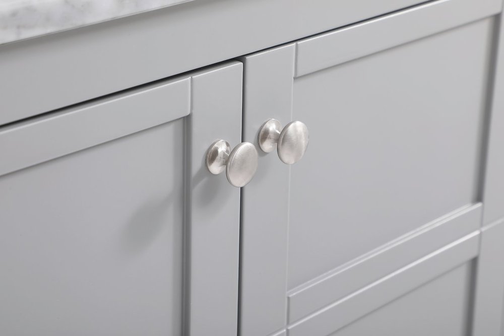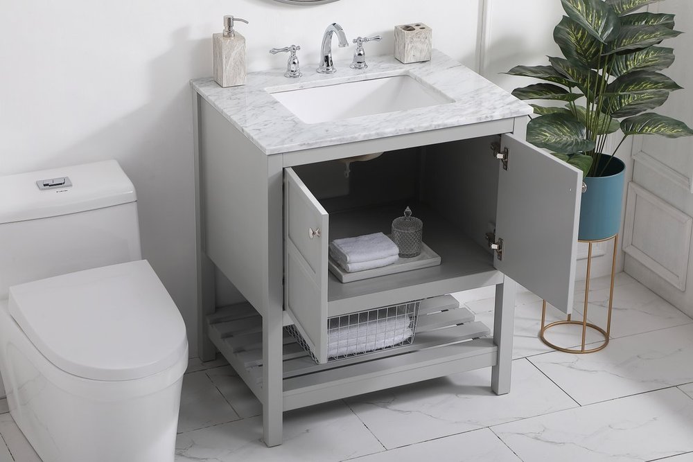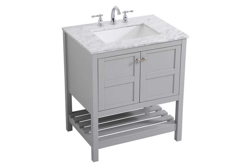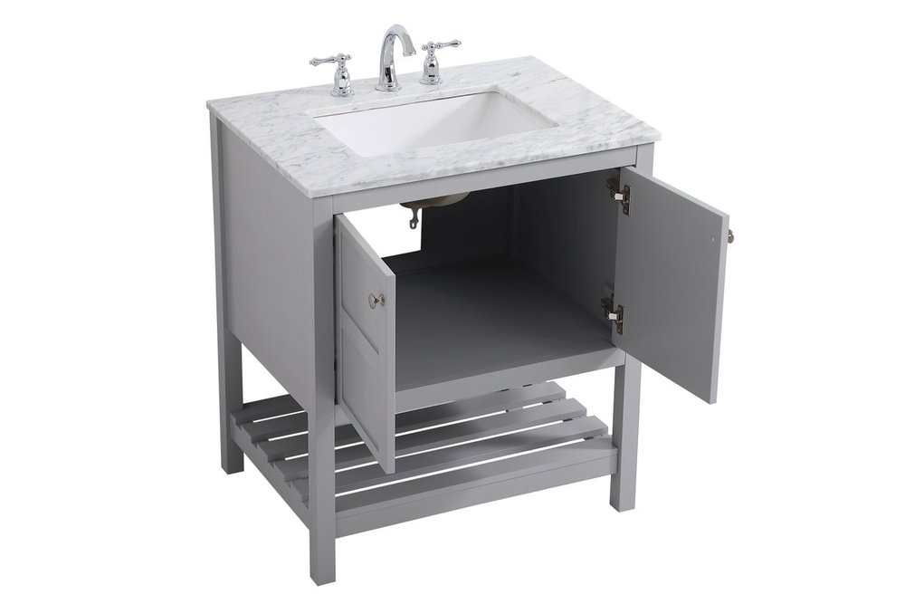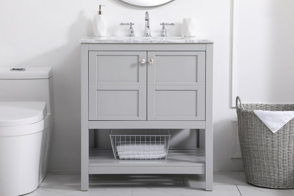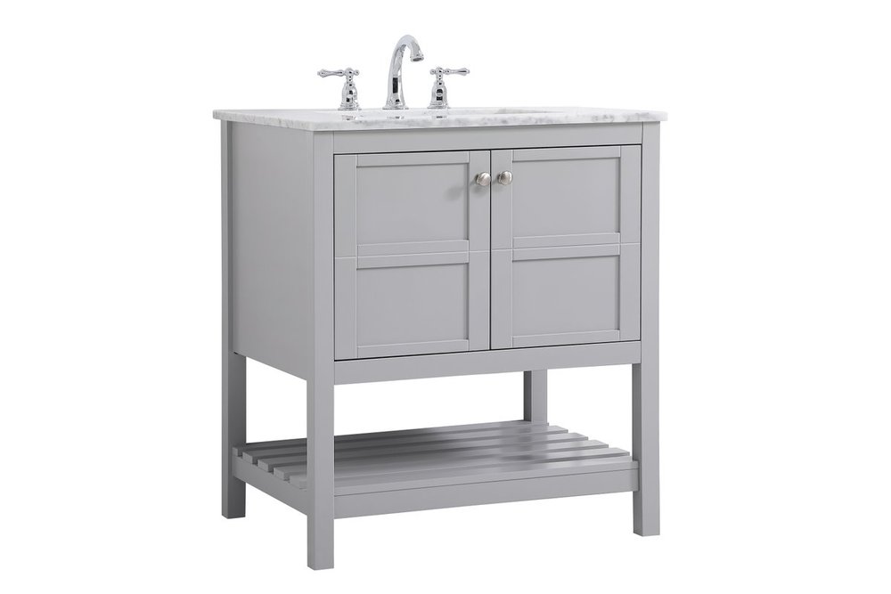 The subtle beauty of the Thalen collection 30" vanity in a gray finish exudes comfortable luxury. Its modern, yet traditional beauty will surely dress up your bathroom or powder room without any fuss. The white stone countertop and porcelain undermount sink shows quiet opulence, and the legs support upright without fail. Brushed Nickel hardware complements the trendy gray finish, with pulls adorning the two cabinet doors, showcasing ample storage space within. Slated shelf allows for additional space to organize your towels. Whether this vanity is in your bathroom or for guests, its presence will surely elevate the aesthetics of your room.