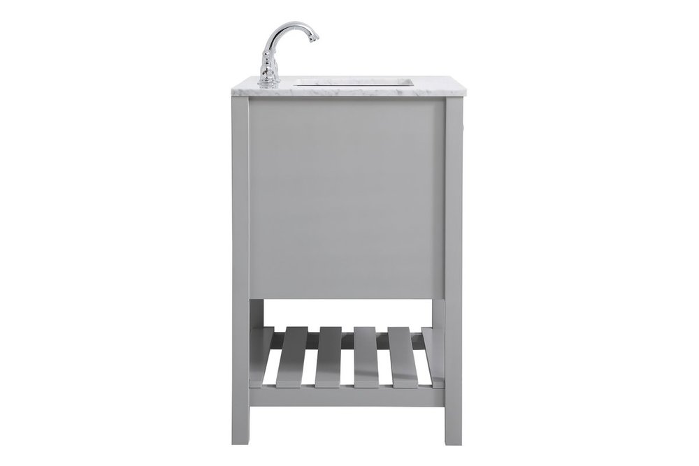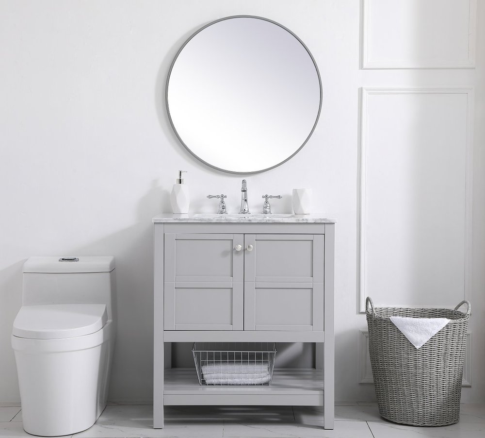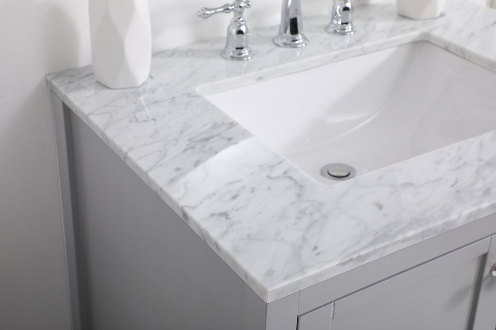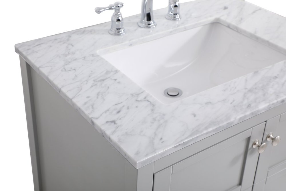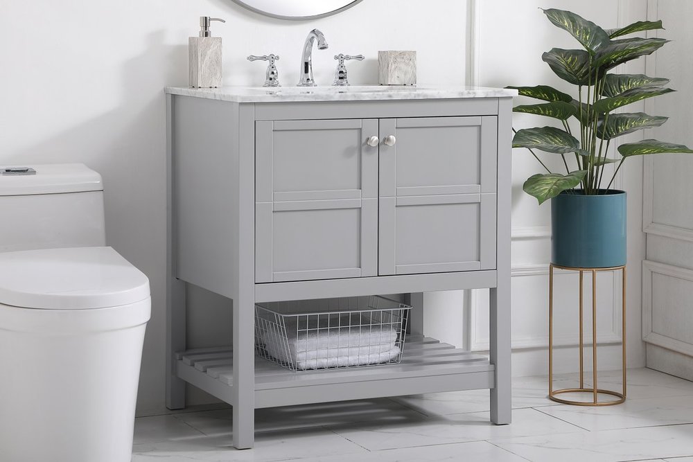 The subtle beauty of the Thalen collection 30" vanity in a gray finish exudes comfortable luxury. Its modern, yet traditional beauty will surely dress up your bathroom or powder room without any fuss. The white stone countertop and porcelain undermount sink shows quiet opulence, and the legs support upright without fail. Brushed Nickel hardware complements the trendy gray finish, with pulls adorning the two cabinet doors, showcasing ample storage space within. Slated shelf allows for additional space to organize your towels. Whether this vanity is in your bathroom or for guests, its presence will surely elevate the aesthetics of your room.
