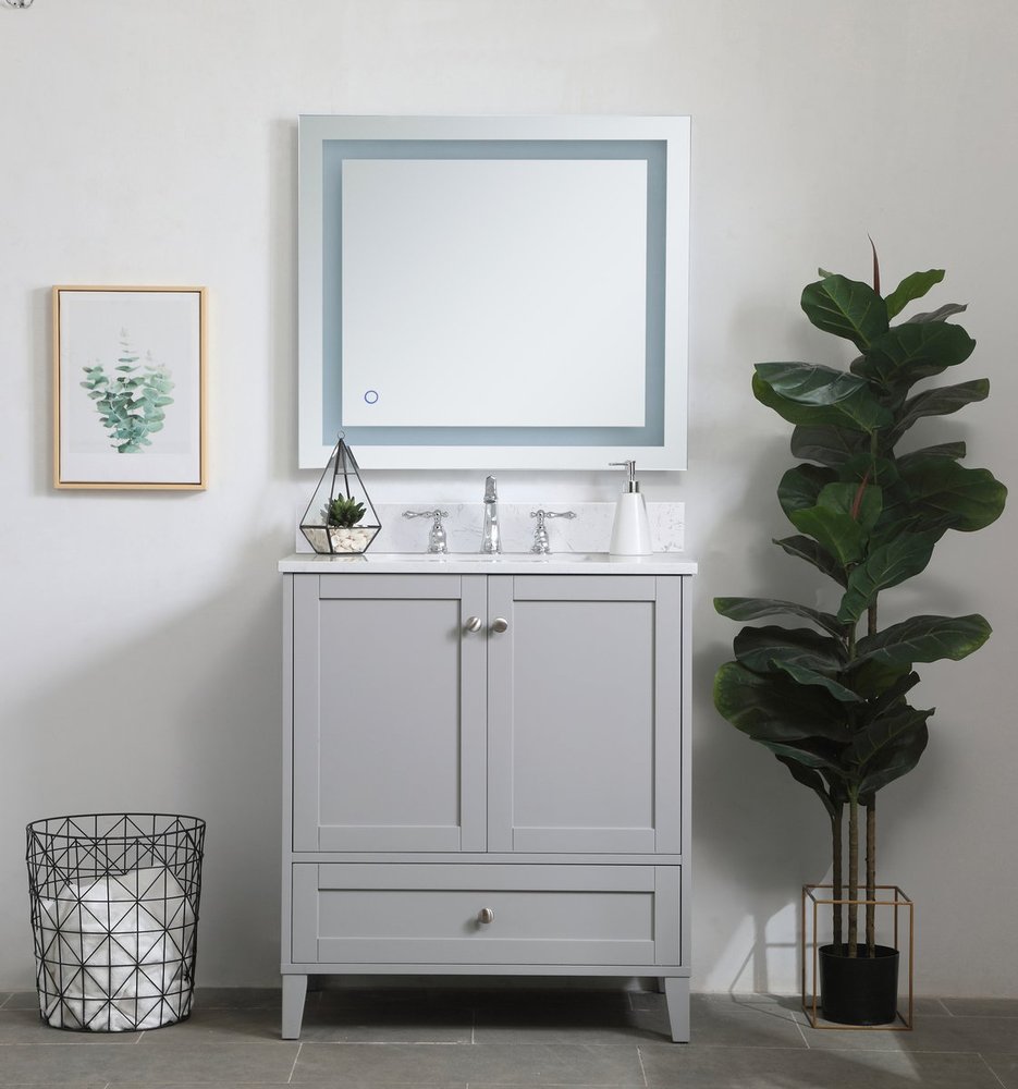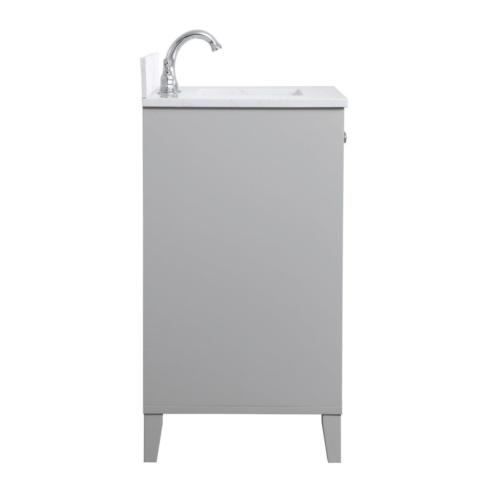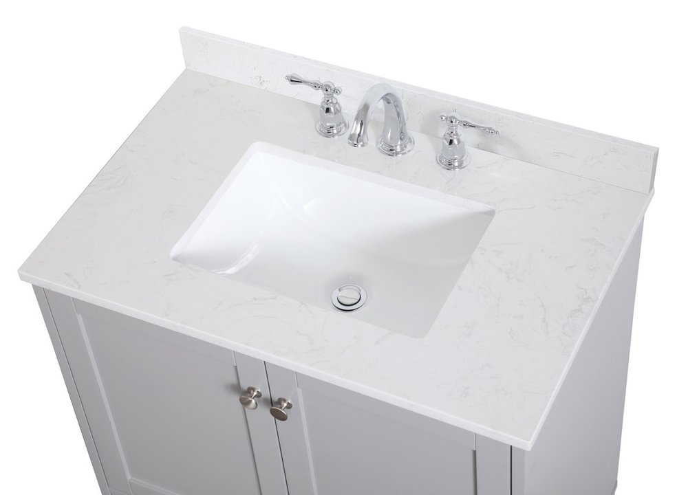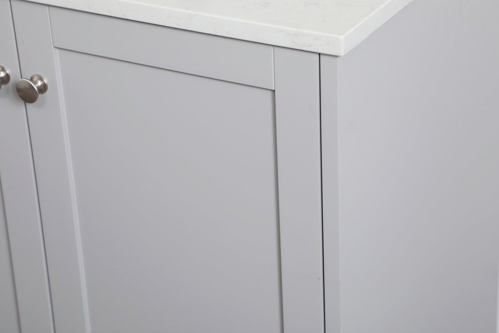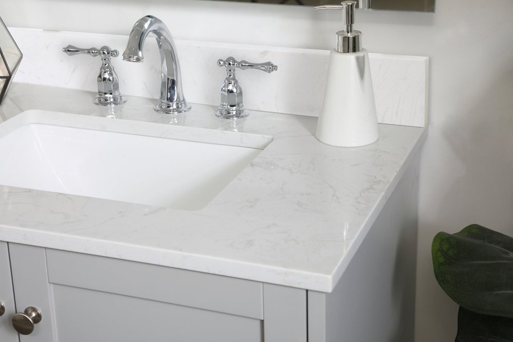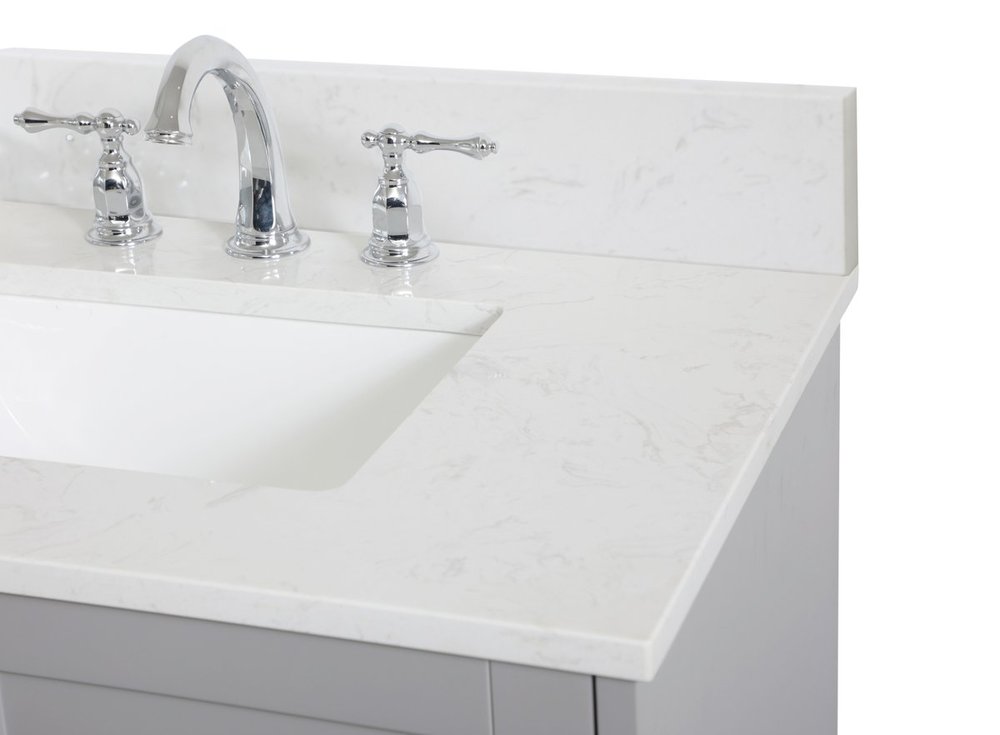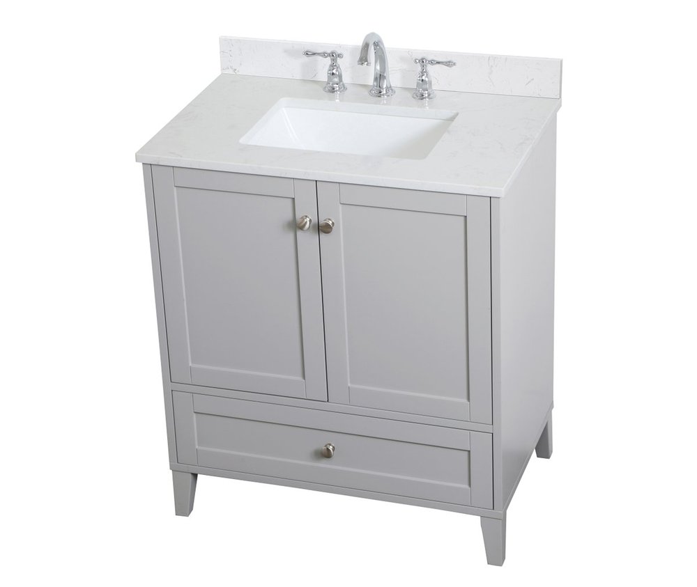 While unassuming, this 30" vanity in a grey finish sure knows how to redefine luxury. The sleek brushed nickel knobs adorn the two cabinet doors and base drawer which allows you to store your bathroom toiletries and necessities. Standing strong on oblique legs and dressed with a calacatta engineered marble countertop, this vanity will surely create beauty and casual elegance in your bathroom or powder room. Comes with a matching backsplash to complete the look and protects your wall.