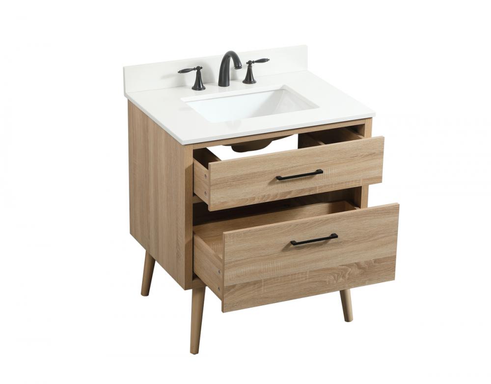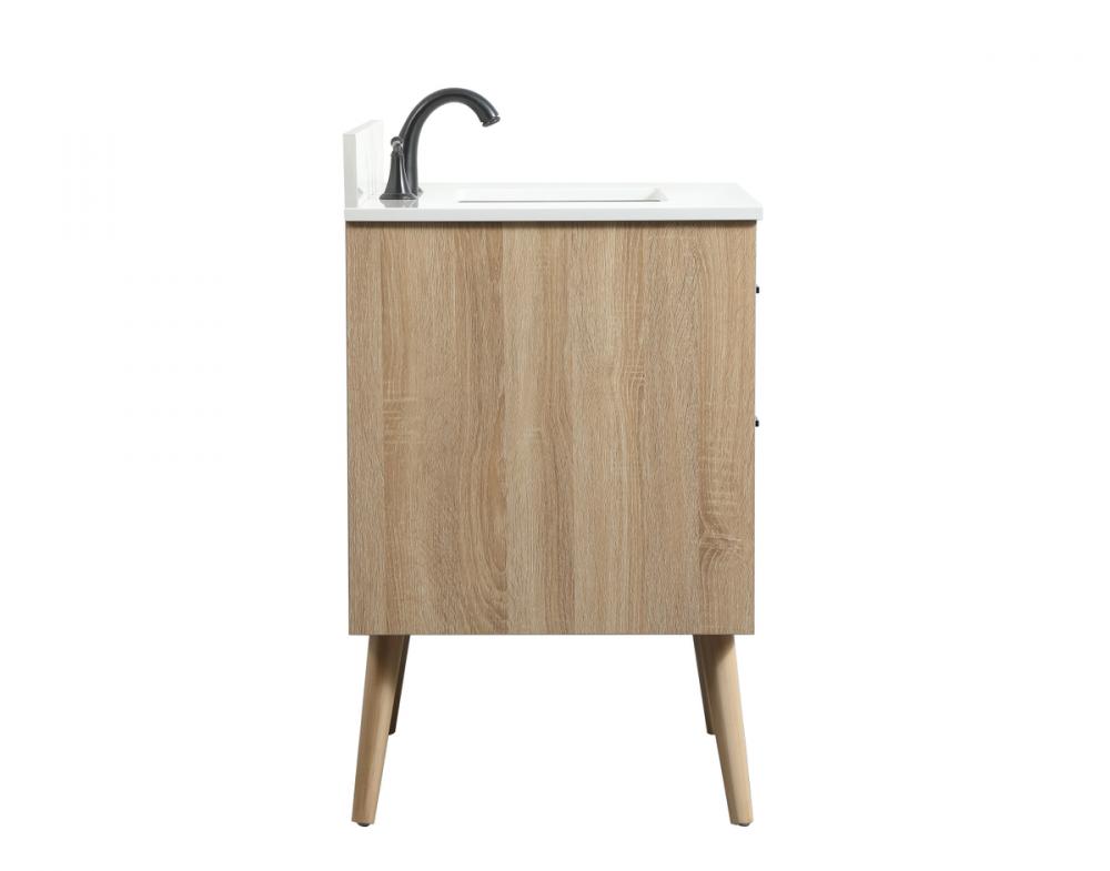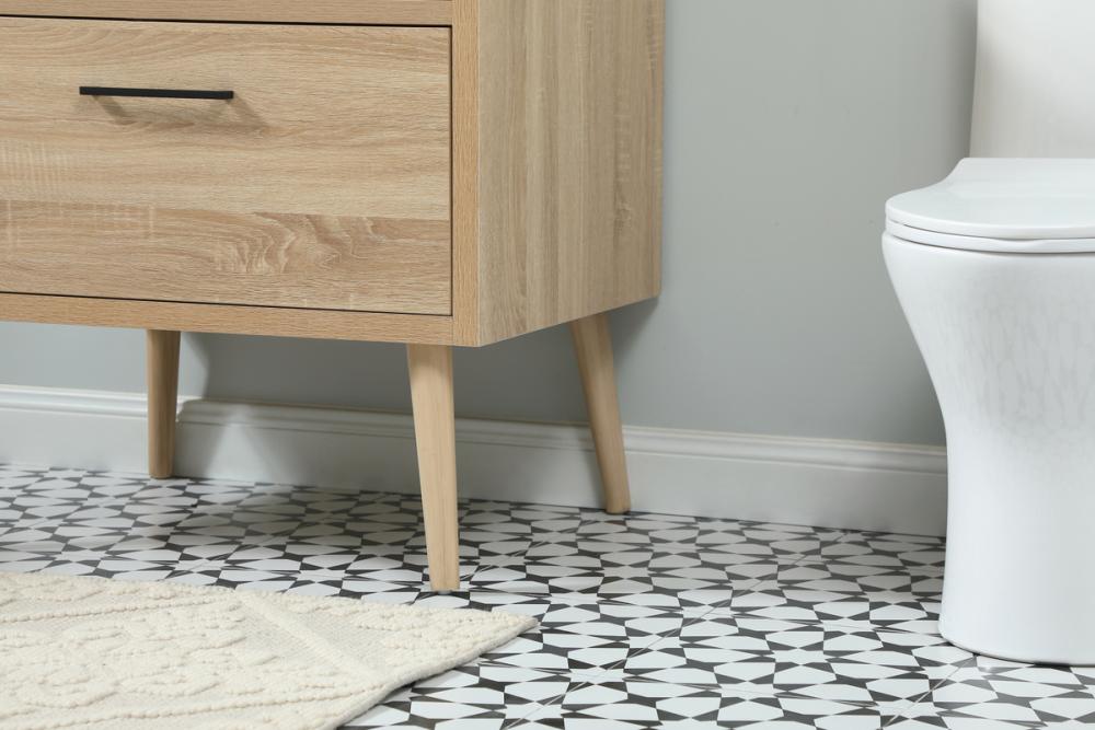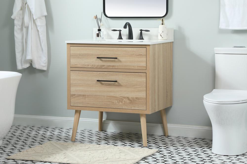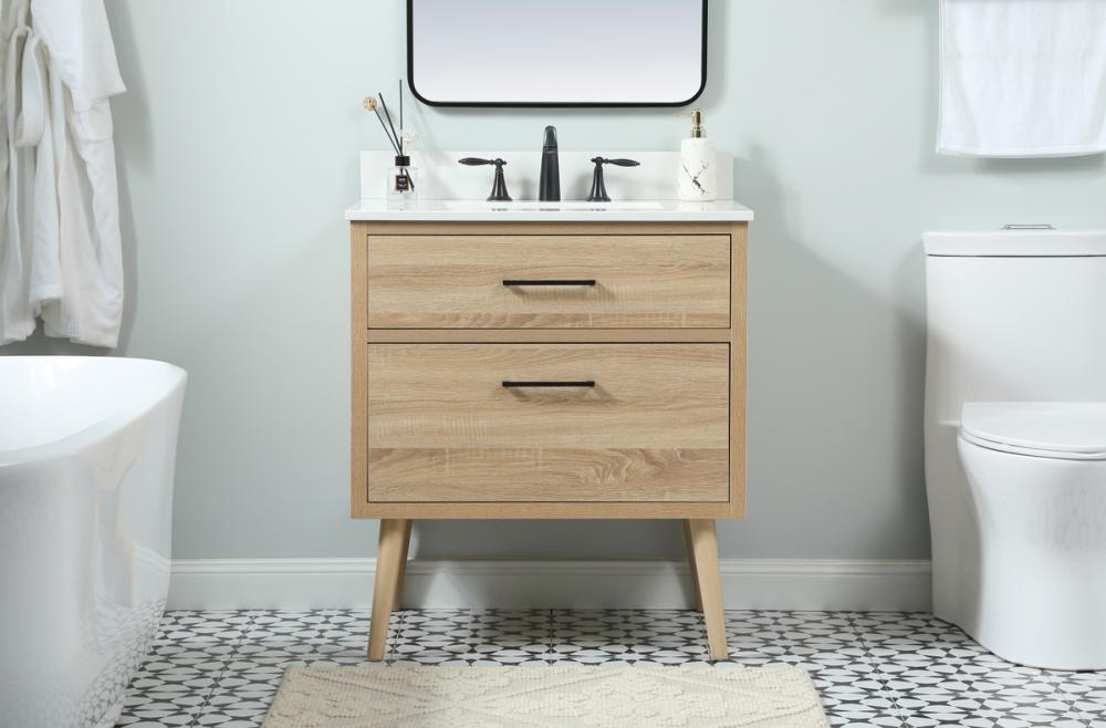 This bathroom vanity is a perfect way to outfit your home in authetic midcentury modern style. The clean lines anchors the design, while the oblique tapered cylinder legs add subtle interest. A black handle adorns the top drawer hiding the base of the undermount porcelain sink while another one allows you to pull the bottom drawer out, letting you store your bathroom necessities and toiletries. The storage drawers provide much needed function and can be used for stowing items like extra toothbrushes, hairbrushes, and other bathroom essentials to help you get ready to face the day. This vanity is a quick update for your bathroom with trendy style. Comes with a matching backsplash to complete the look and protects your wall.