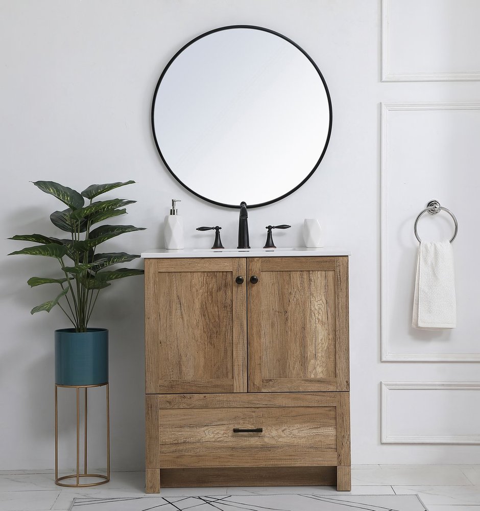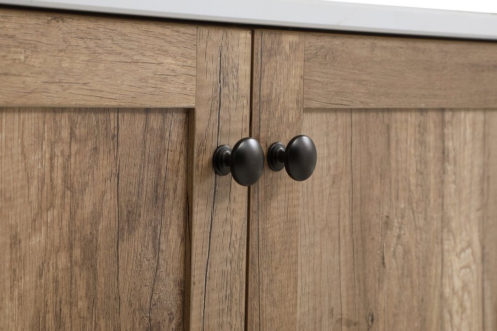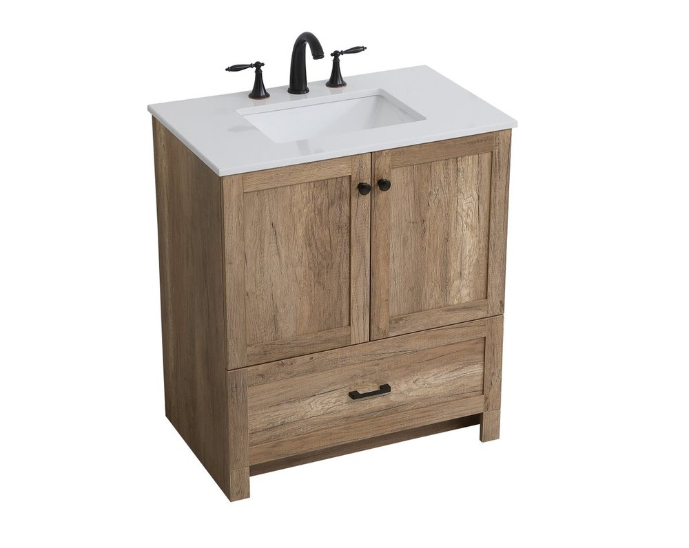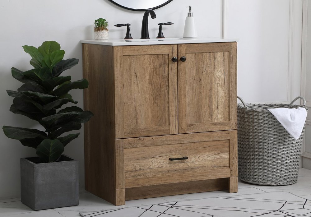 Delve into a world of minimalistic fashion and contemporary styling with this farmhouse 30" vanity. The clean faux lines anchors the weathered design. Black handle adorns the two doors hiding the base of the integrated porcelain sink while the bottom drawer allows you to store your bathroom necessities and toiletries. The compact size makes it the perfect vanity for any bathroom or powder room, regardless of size.