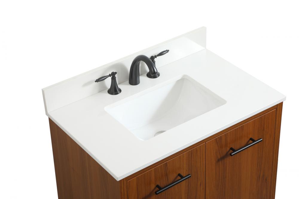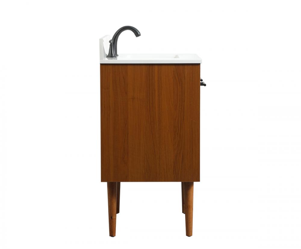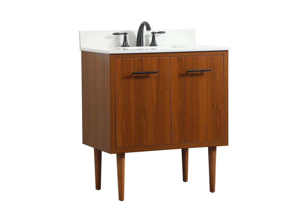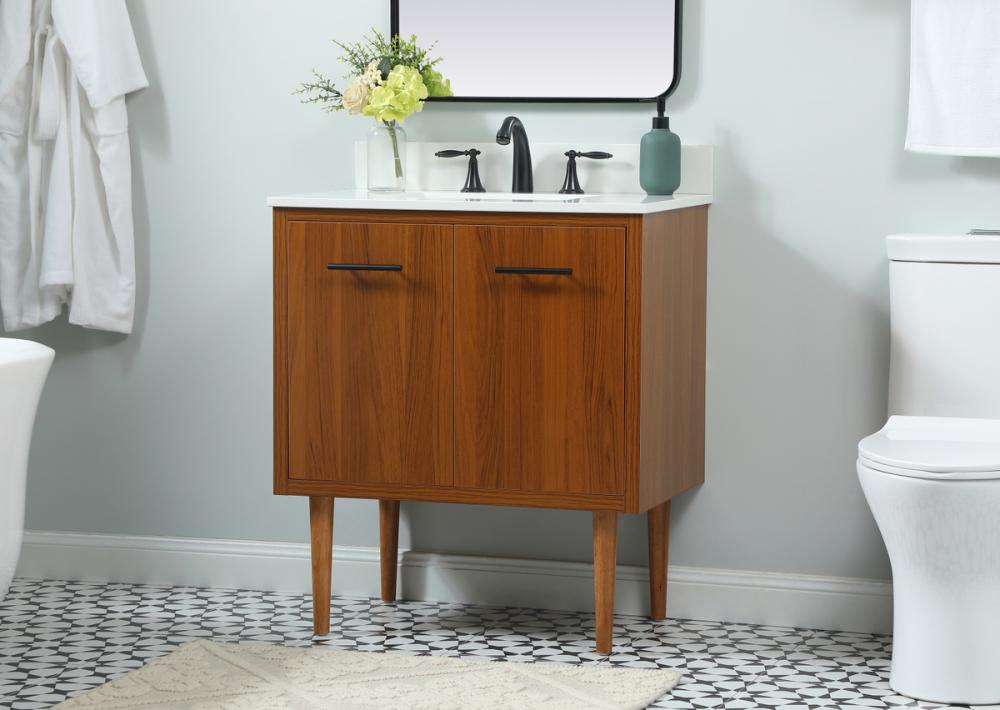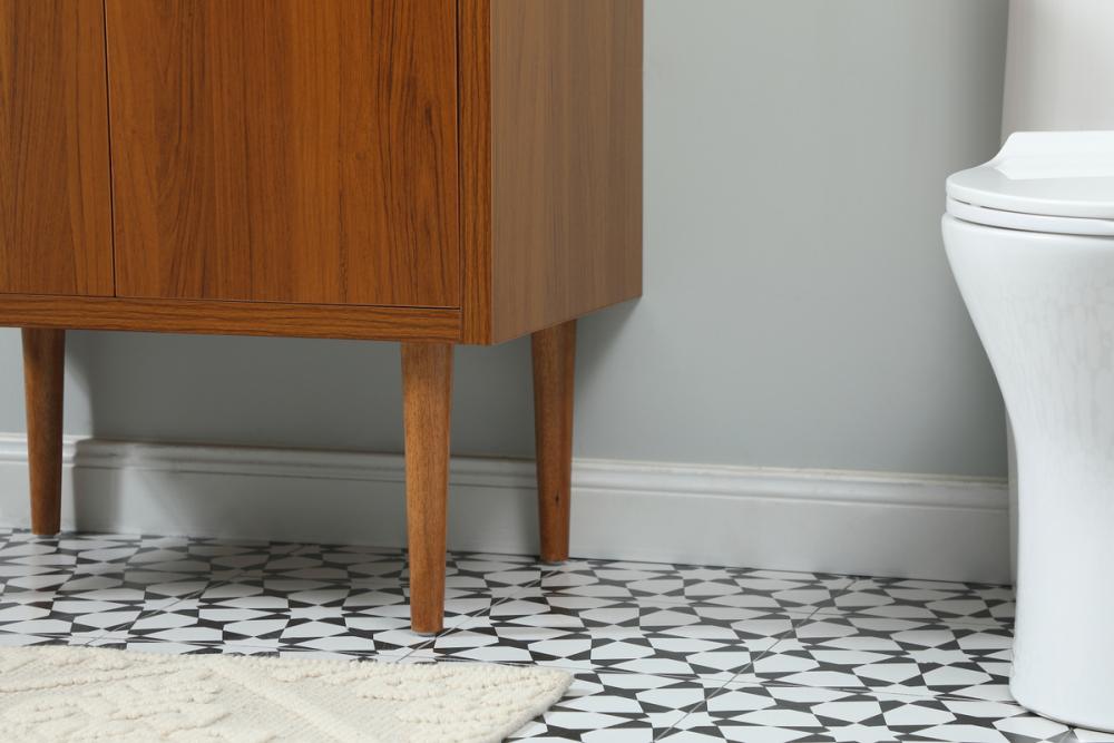 Delve into a world of minimalistic fashion and contemporary styling with this midcentury modern vanity. The clean lines anchors the design, while the straight tapered cylinder legs add subtle interest. Bar pull handle adorns the soft closing door hiding the base of the rectangular porcelain sink and letting you store your bathroom necessities and toiletries. Whether you want to use this as a floating vanity or a freestanding vanity, the choice is yours. The durable ivory white engineered marble countertop complements the manufactured wood base vanity and is built to last. Comes with a matching backsplash to complete the look and protects your wall.