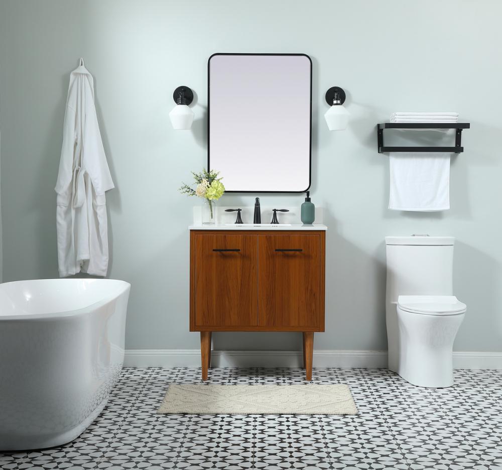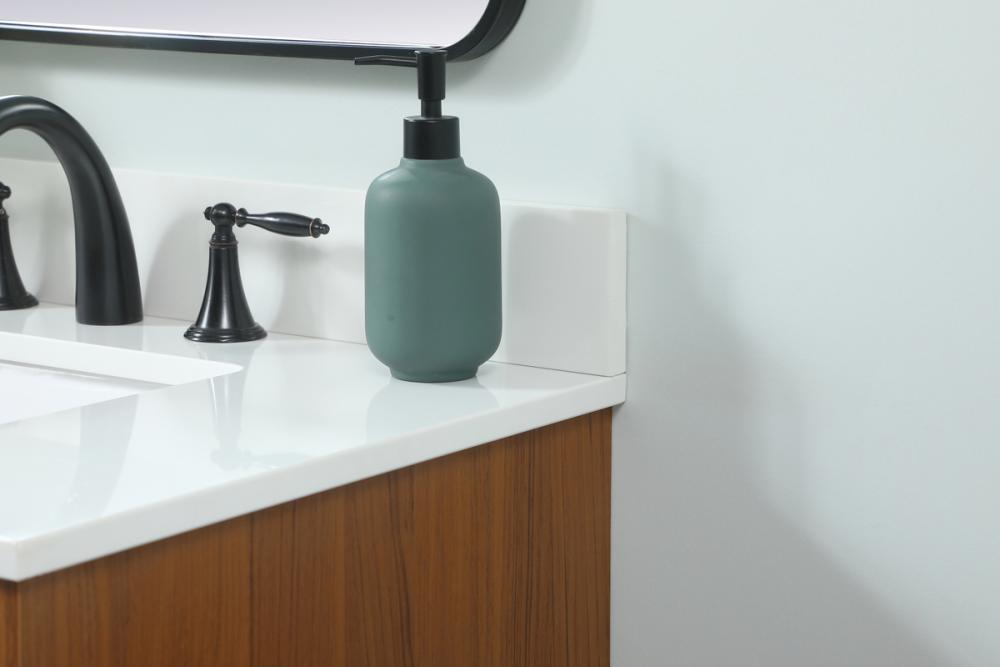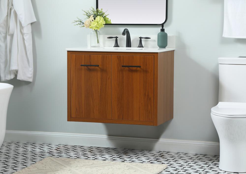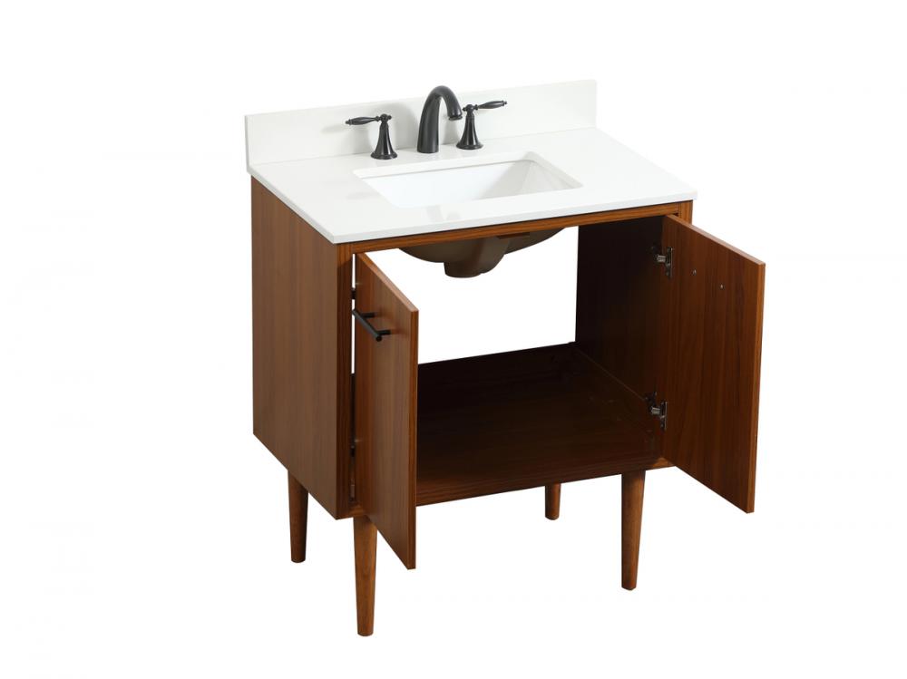 Delve into a world of minimalistic fashion and contemporary styling with this midcentury modern vanity. The clean lines anchors the design, while the straight tapered cylinder legs add subtle interest. Bar pull handle adorns the soft closing door hiding the base of the rectangular porcelain sink and letting you store your bathroom necessities and toiletries. Whether you want to use this as a floating vanity or a freestanding vanity, the choice is yours. The durable ivory white engineered marble countertop complements the manufactured wood base vanity and is built to last. Comes with a matching backsplash to complete the look and protects your wall.