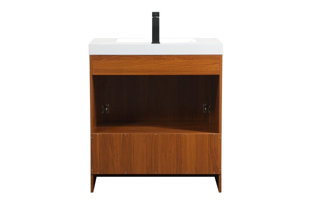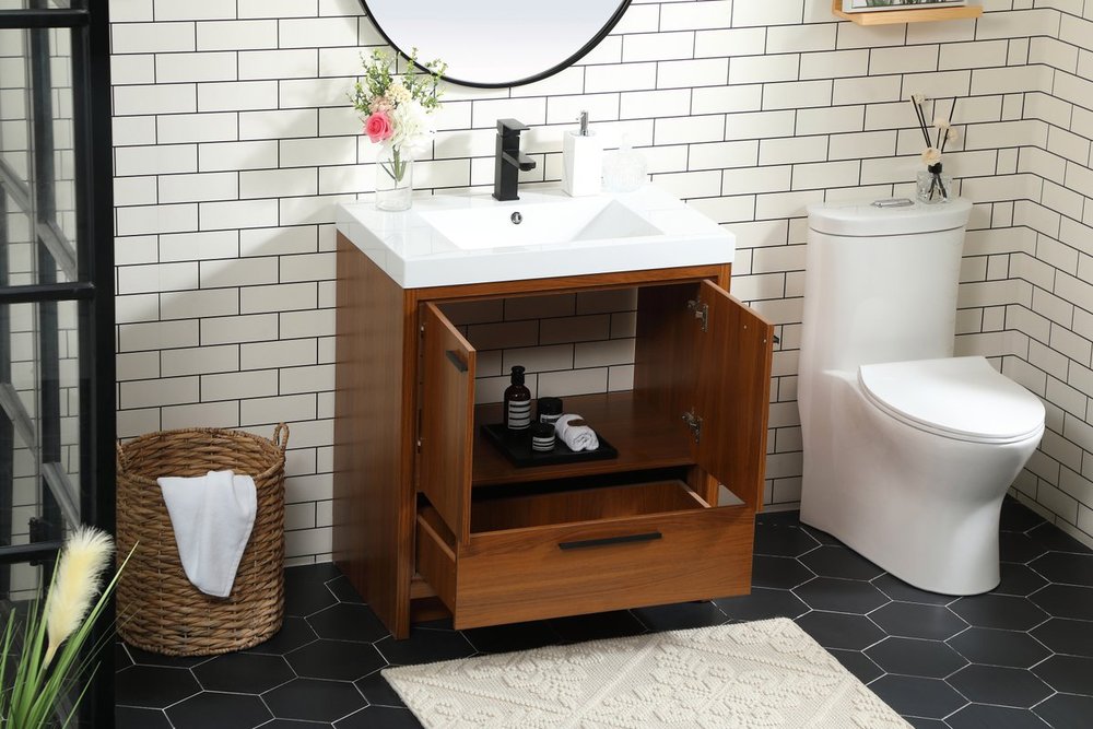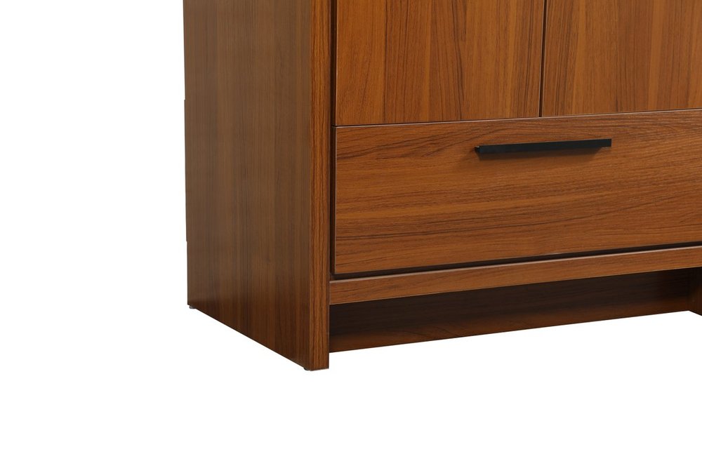 Modern sophistication is defined within the teak finish and black barpulls of this vanity. Its length makes it the perfect addition to any sized home, and saves space with its storage area hidden behind the double cabinet doors and one bottom drawers. Topped with a highly durable resin white counter top and an integrated sink, this modern design will add everlasting class to your bathroom and powder room.