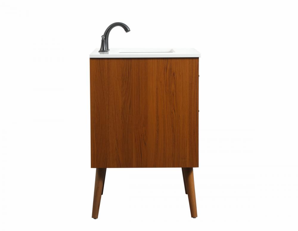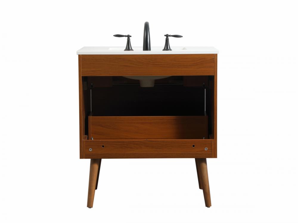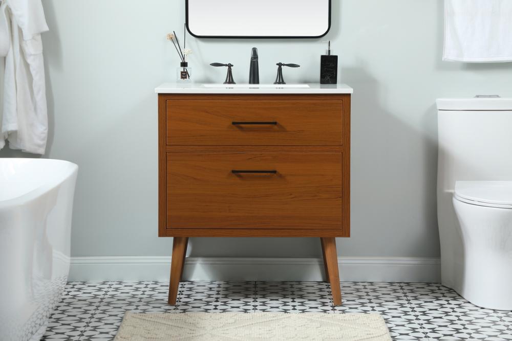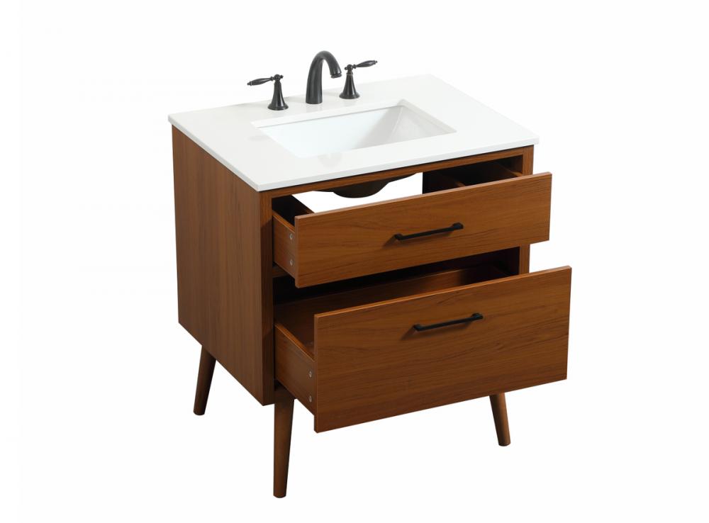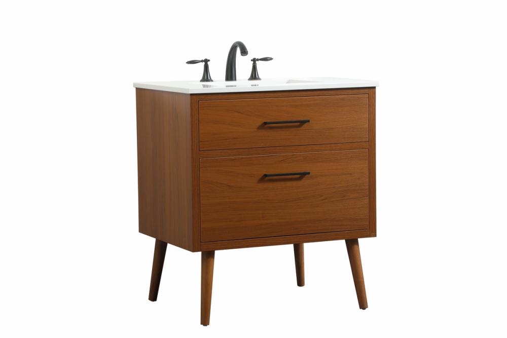 This bathroom vanity is a perfect way to outfit your home in authetic midcentury modern style. The clean lines anchors the design, while the oblique tapered cylinder legs add subtle interest. A black handle adorns the top drawer hiding the base of the undermount porcelain sink while another one allows you to pull the bottom drawer out, letting you store your bathroom necessities and toiletries. The storage drawers provide much needed function and can be used for stowing items like extra toothbrushes, hairbrushes, and other bathroom essentials to help you get ready to face the day. This vanity is a quick update for your bathroom with trendy style.
