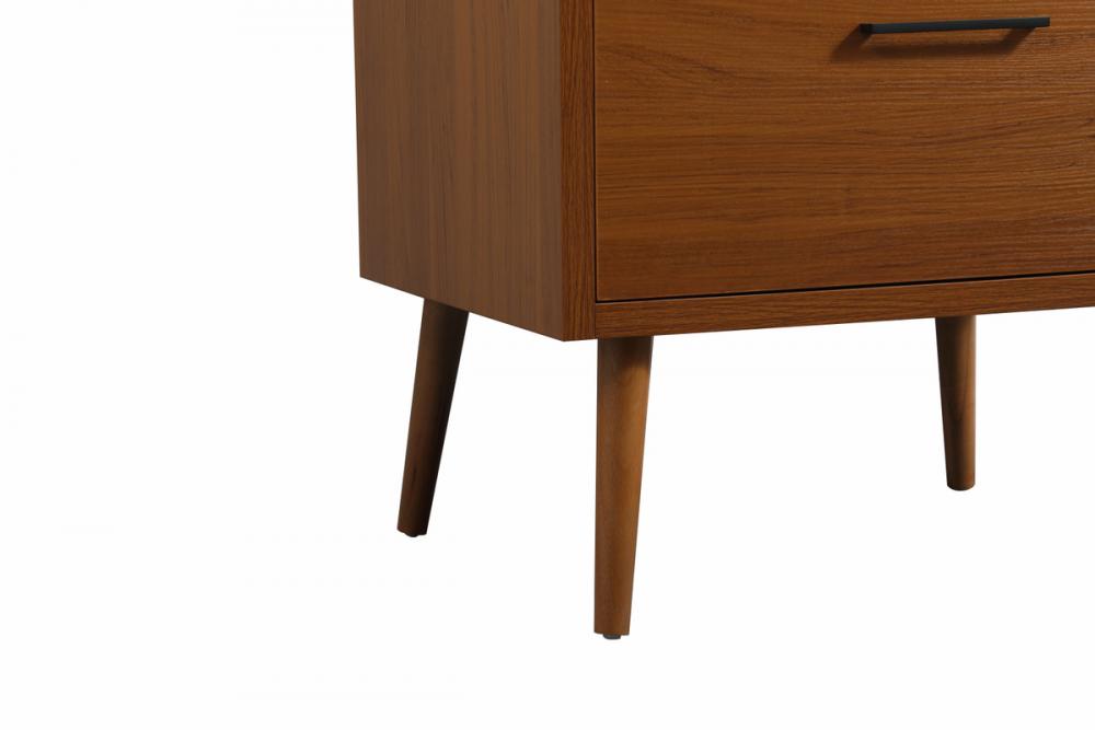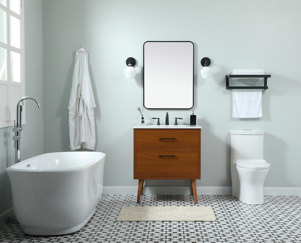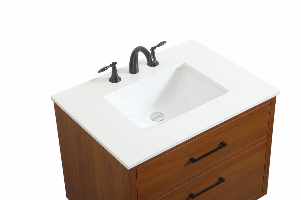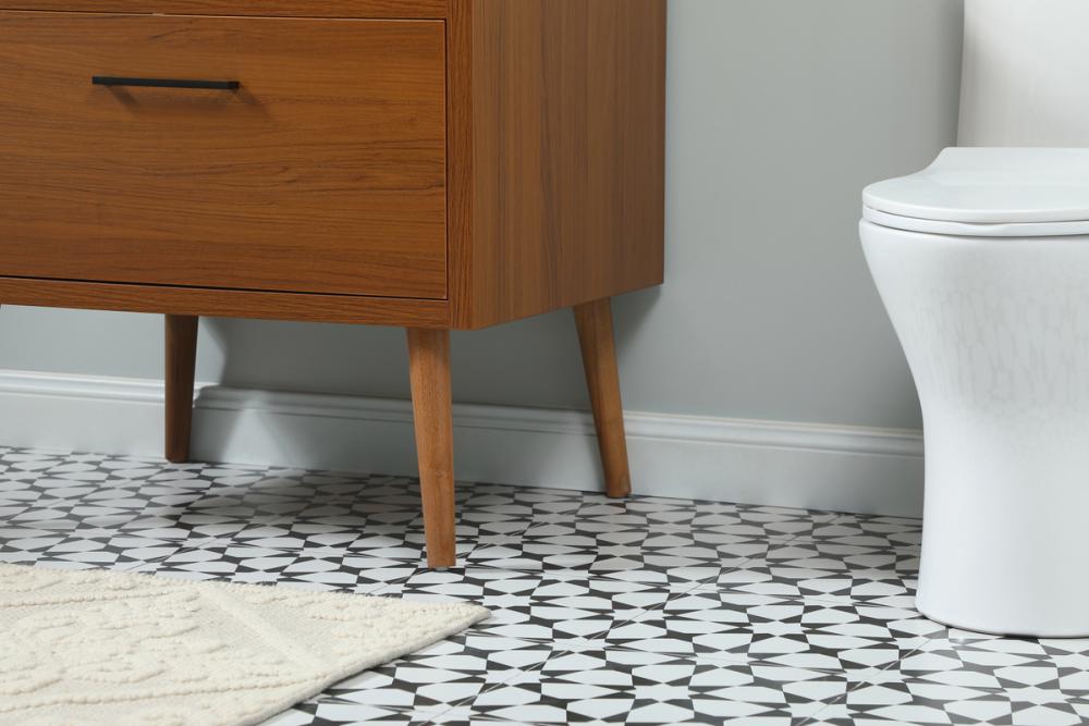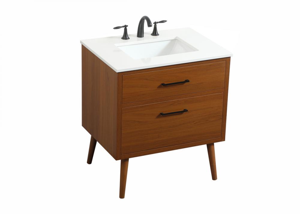 This bathroom vanity is a perfect way to outfit your home in authetic midcentury modern style. The clean lines anchors the design, while the oblique tapered cylinder legs add subtle interest. A black handle adorns the top drawer hiding the base of the undermount porcelain sink while another one allows you to pull the bottom drawer out, letting you store your bathroom necessities and toiletries. The storage drawers provide much needed function and can be used for stowing items like extra toothbrushes, hairbrushes, and other bathroom essentials to help you get ready to face the day. This vanity is a quick update for your bathroom with trendy style.