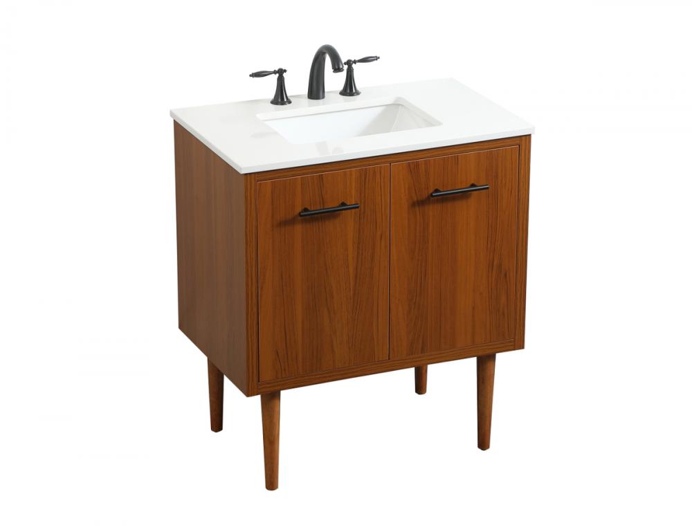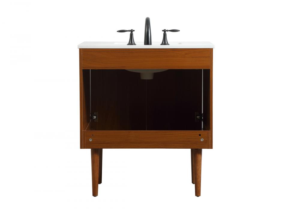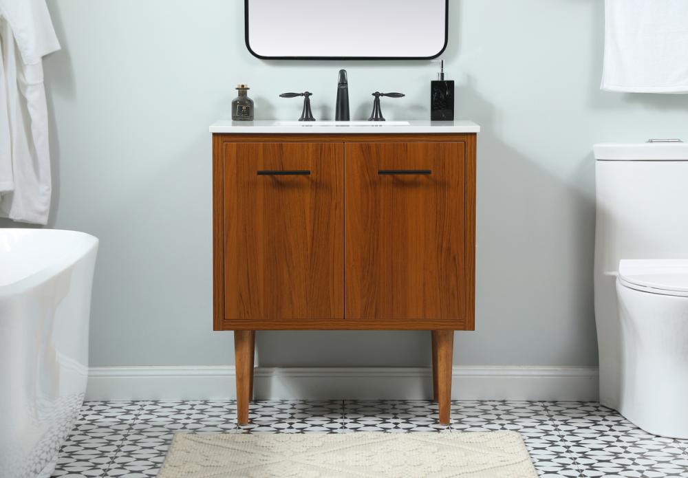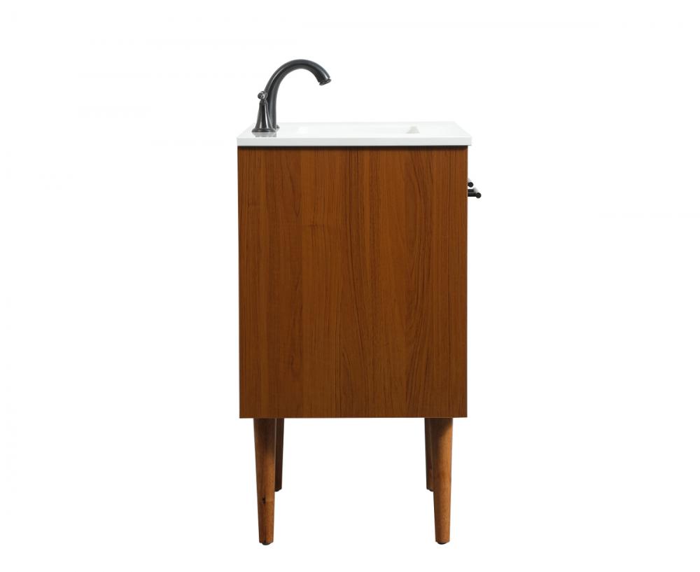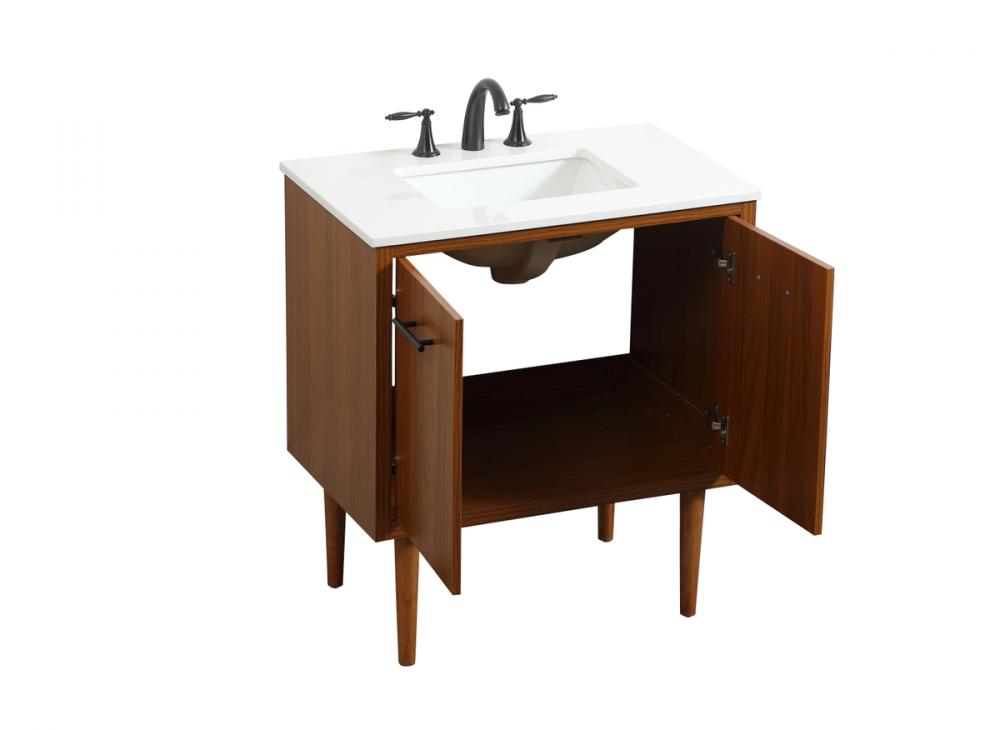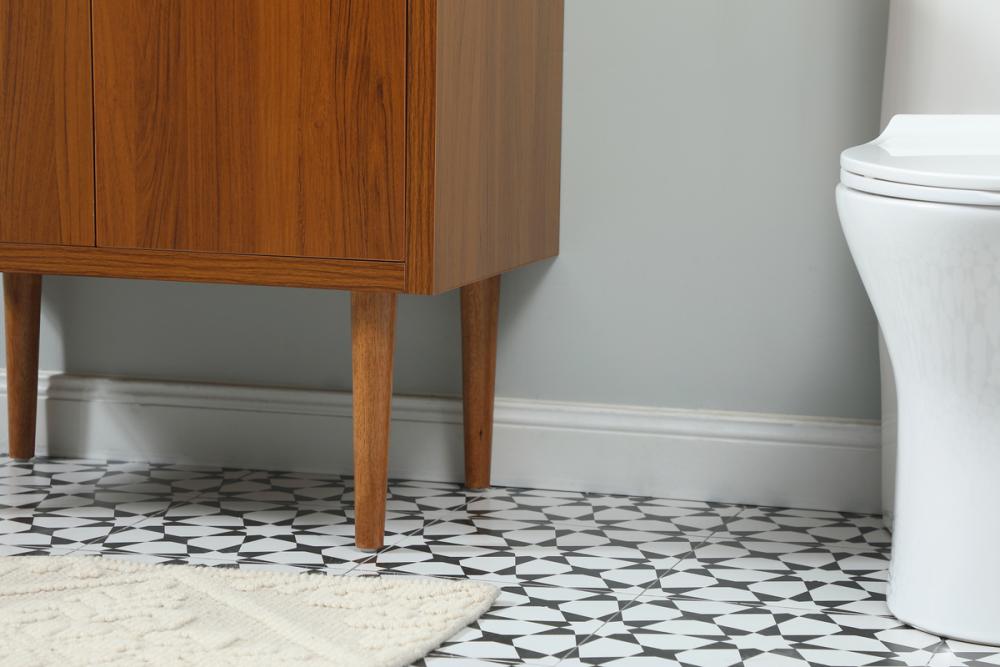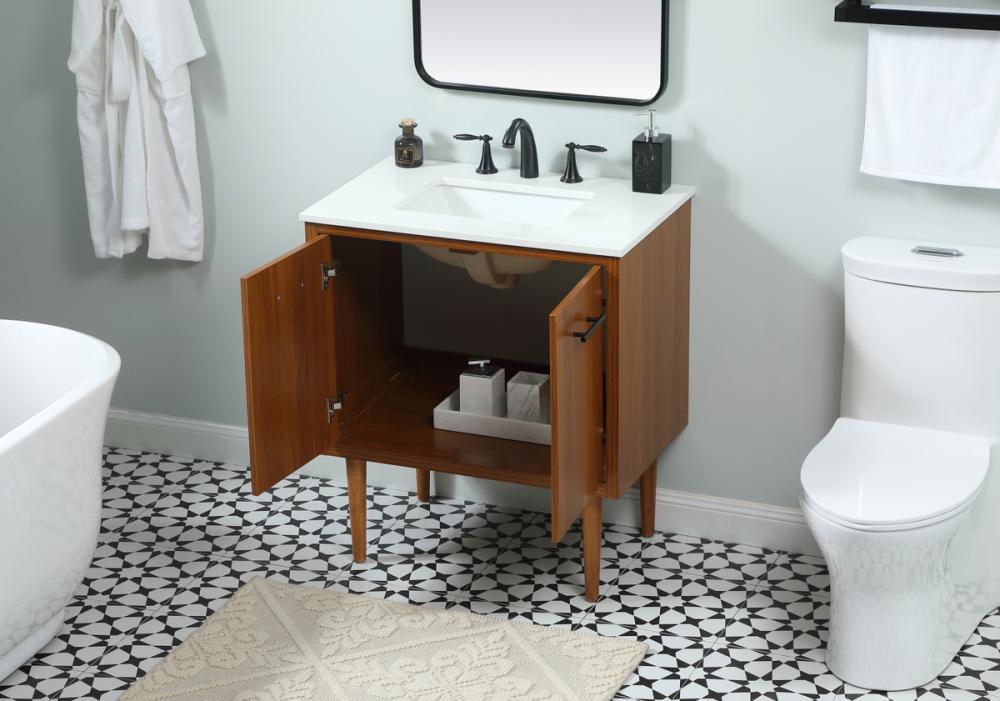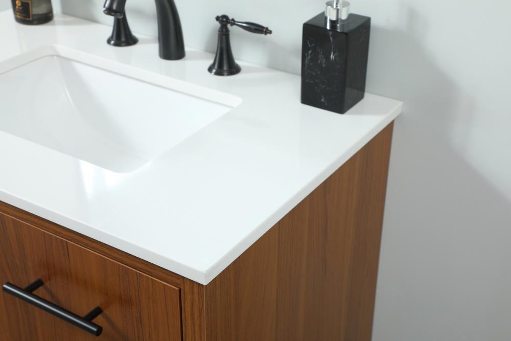 Delve into a world of minimalistic fashion and contemporary styling with this midcentury modern vanity. The clean lines anchors the design, while the straight tapered cylinder legs add subtle interest. Bar pull handle adorns the soft closing door hiding the base of the rectangular porcelain sink and letting you store your bathroom necessities and toiletries. Whether you want to use this as a floating vanity or a freestanding vanity, the choice is yours. The durable ivory white engineered marble countertop complements the manufactured wood base vanity and is built to last.