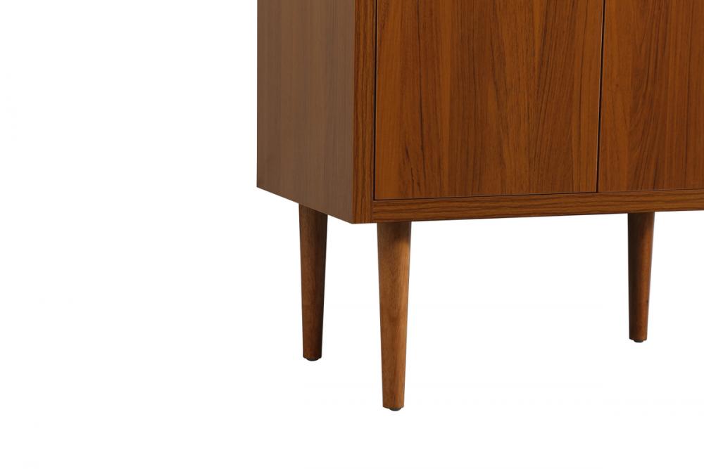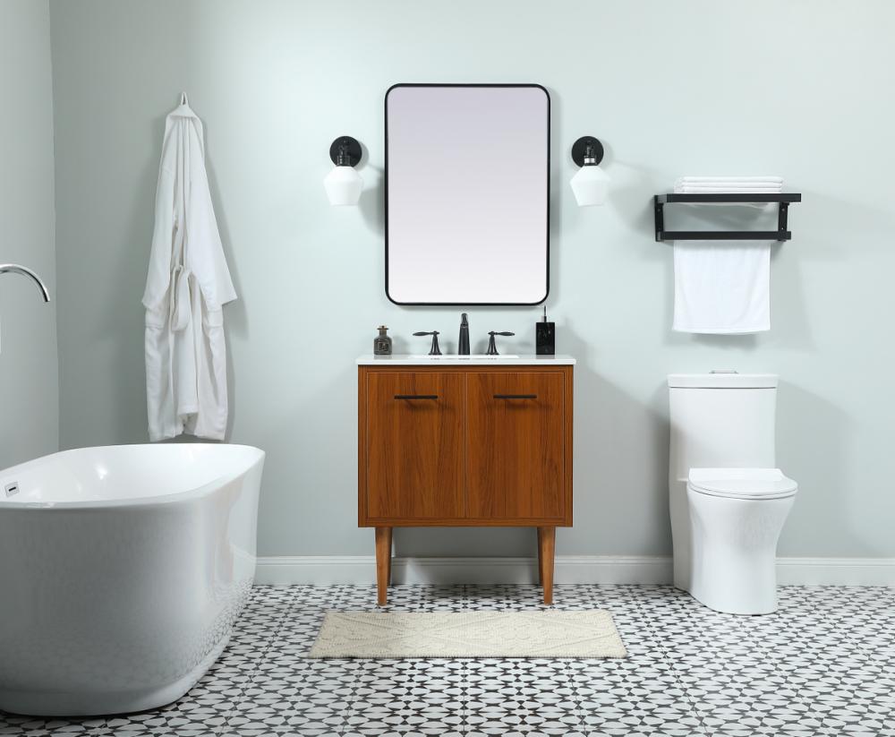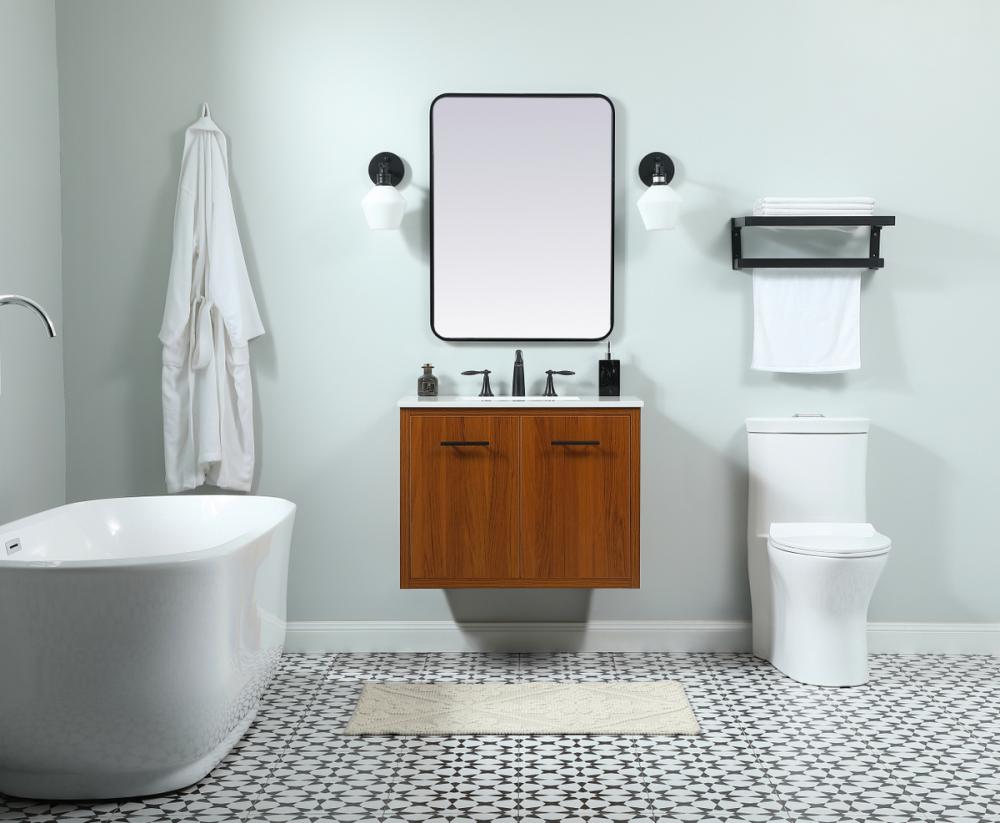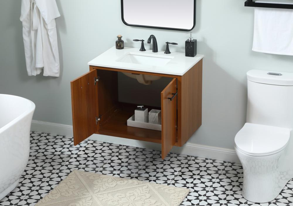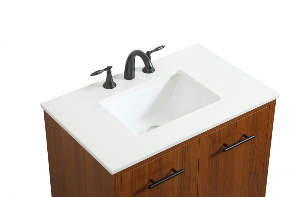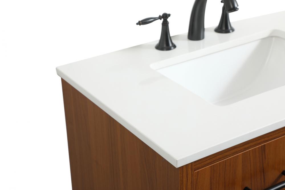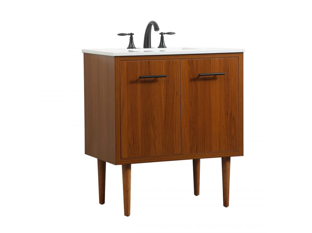Delve into a world of minimalistic fashion and contemporary styling with this midcentury modern vanity. The clean lines anchors the design, while the straight tapered cylinder legs add subtle interest. Bar pull handle adorns the soft closing door hiding the base of the rectangular porcelain sink and letting you store your bathroom necessities and toiletries. Whether you want to use this as a floating vanity or a freestanding vanity, the choice is yours. The durable ivory white engineered marble countertop complements the manufactured wood base vanity and is built to last.