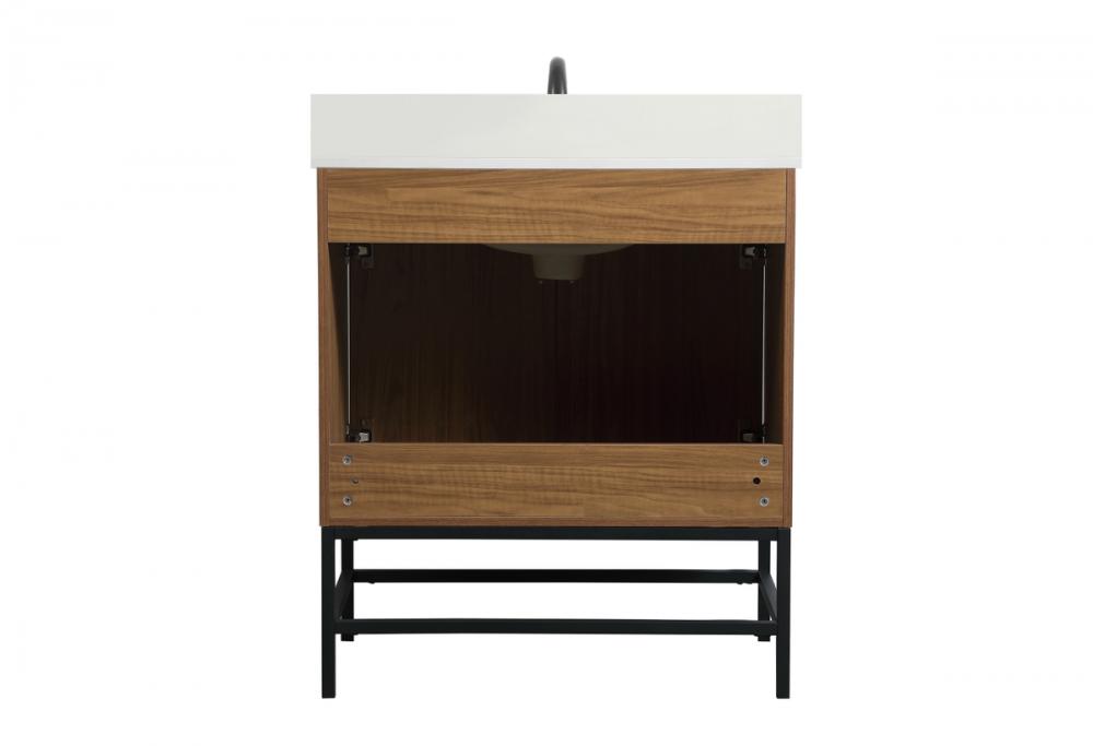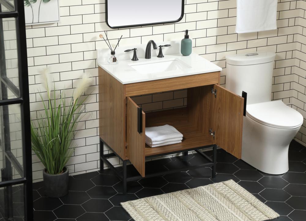 This vanity is a sleek-looking piece of bathroom furniture that is easy to incorporate into your design scheme. The cabinet features a smooth door panel with an oversized steel handle and soft close hinges provide ample room for accessories. Constructed of engineered wood, the powder-coated metal rod legs are an urban industrial look that we love. Minor assembly of the metal legs needed to get this vanity up and running. Comes with a matching backsplash to complete the look and protects your wall.