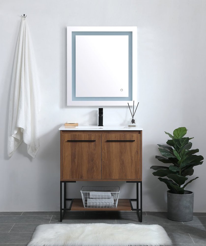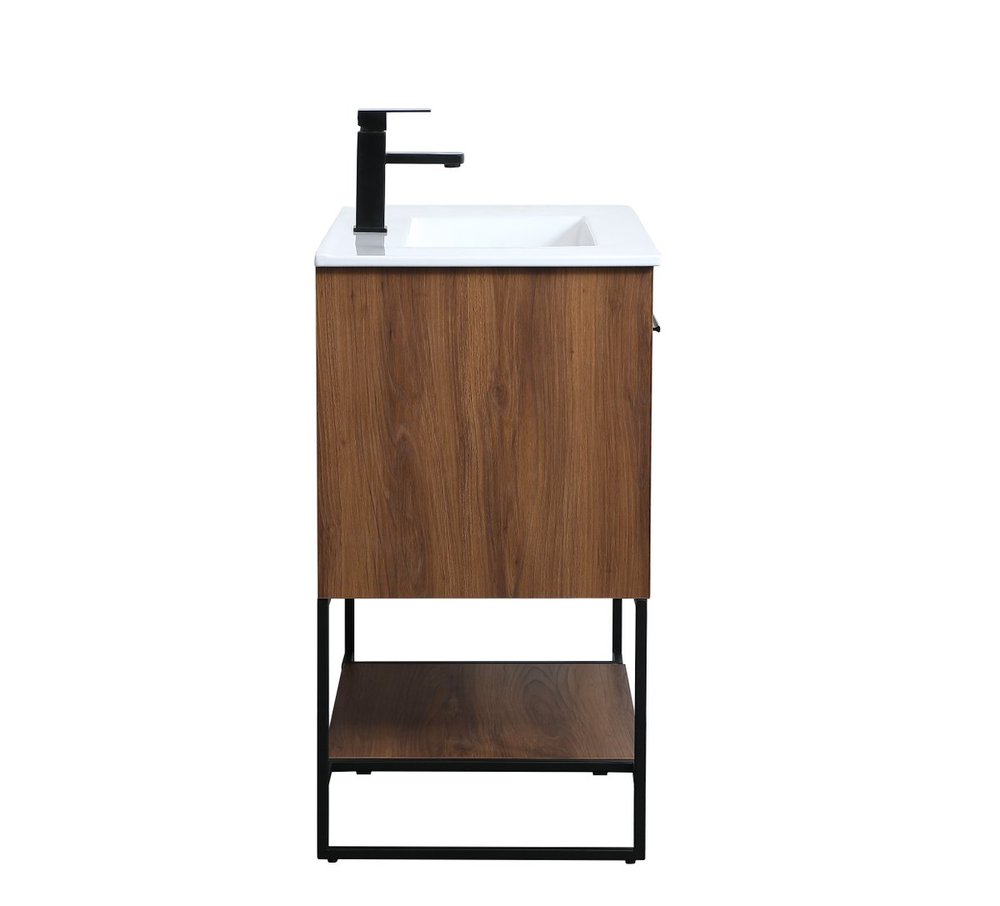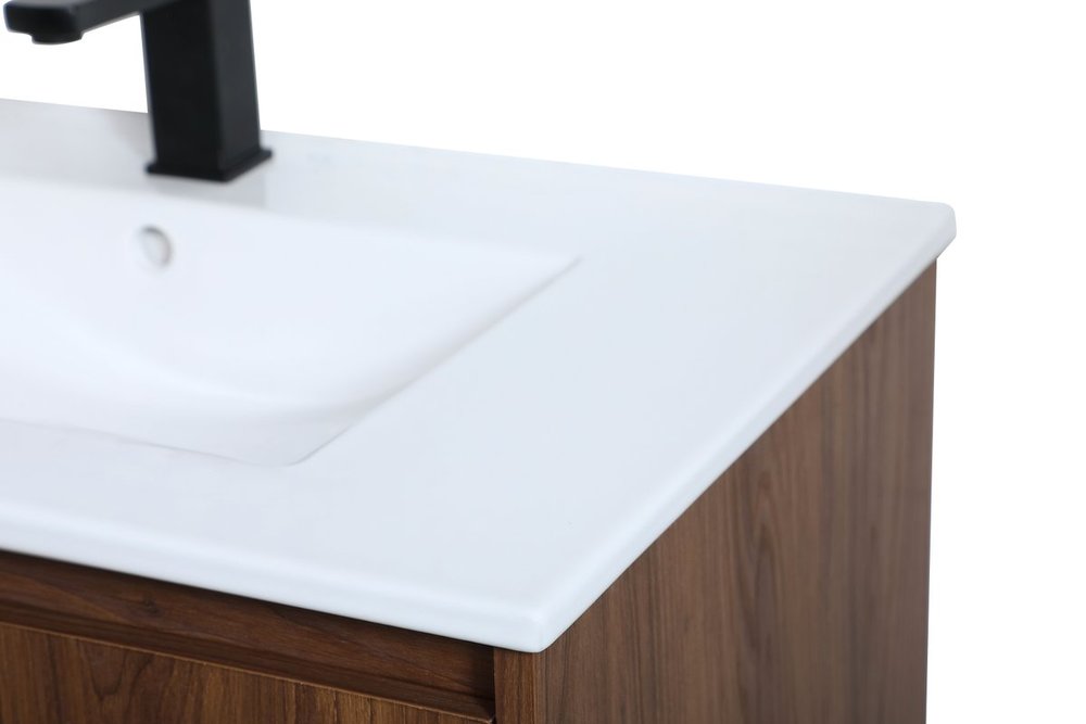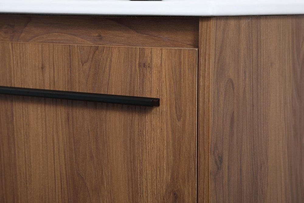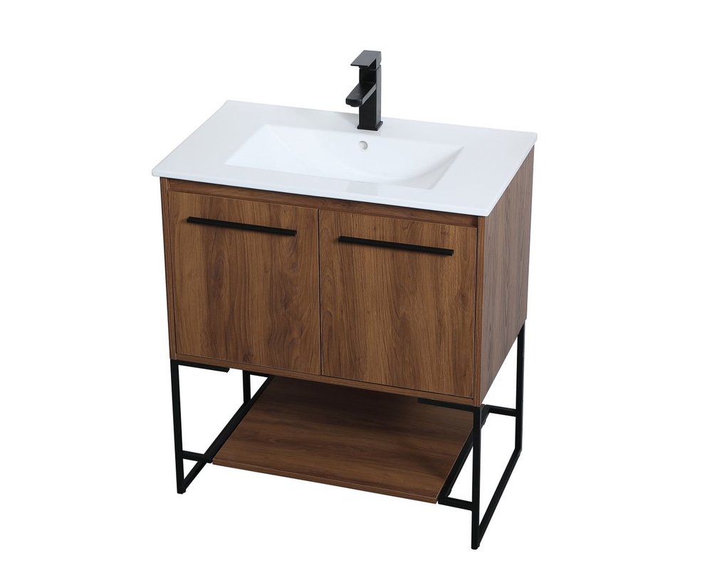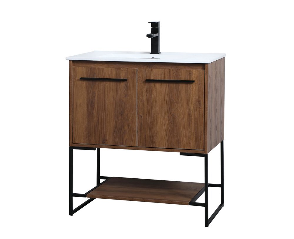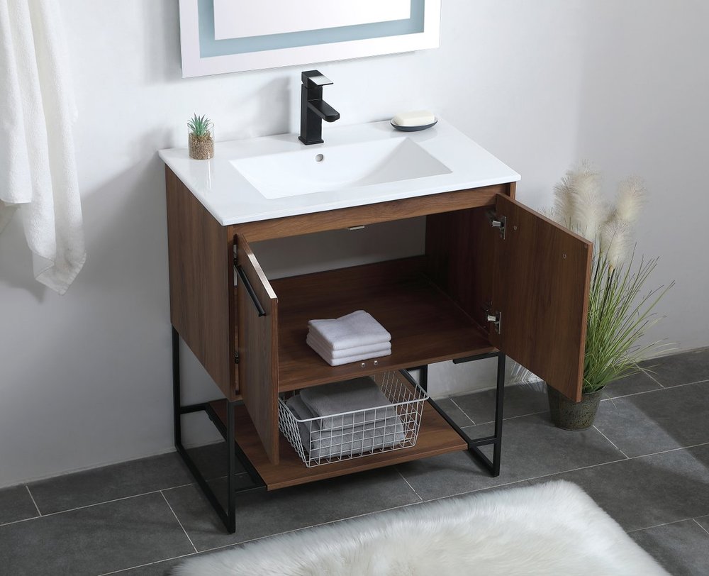 Live in modern comfort with this 30" walnut brown finish vanity. Dressed in a concrete grey and sleek black metal hardware, its contemporary style will have your bathroom or powder room elevated in industrial sophistication. The open shelf at the base and two doors reveal ample storage space for your bathroom essentials and miscellany. Clean lines create its own visual interest, adding trendy looks to your already chic room.