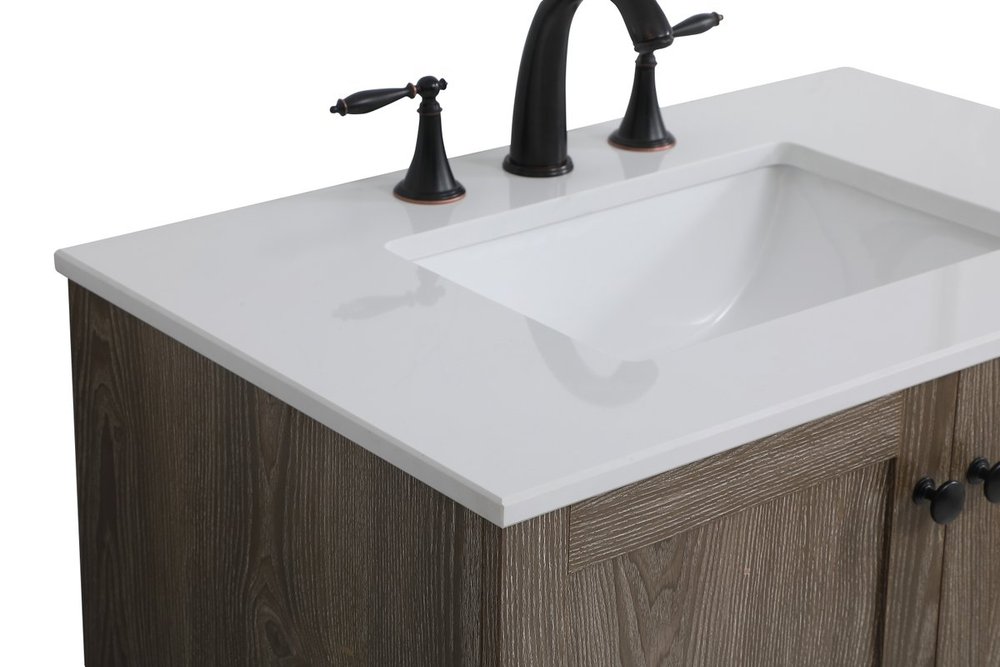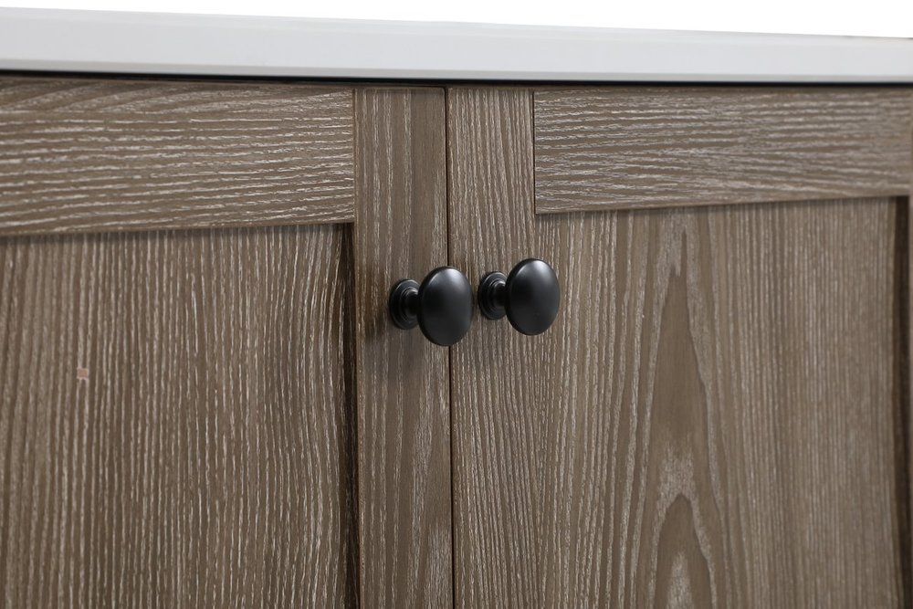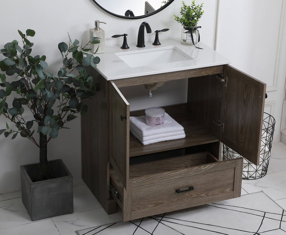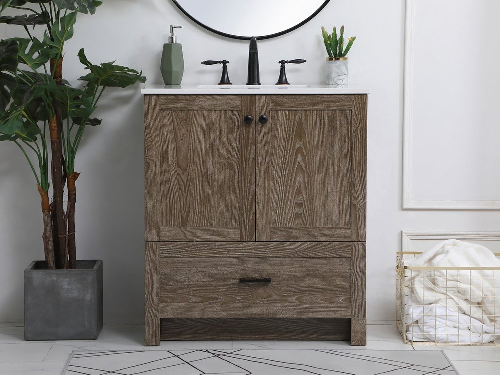Delve into a world of minimalistic fashion and contemporary styling with this farmhouse 30" vanity. The clean faux lines anchors the weathered design. Black handle adorns the two doors hiding the base of the integrated porcelain sink while the bottom drawer allows you to store your bathroom necessities and toiletries. The compact size makes it the perfect vanity for any bathroom or powder room, regardless of size.