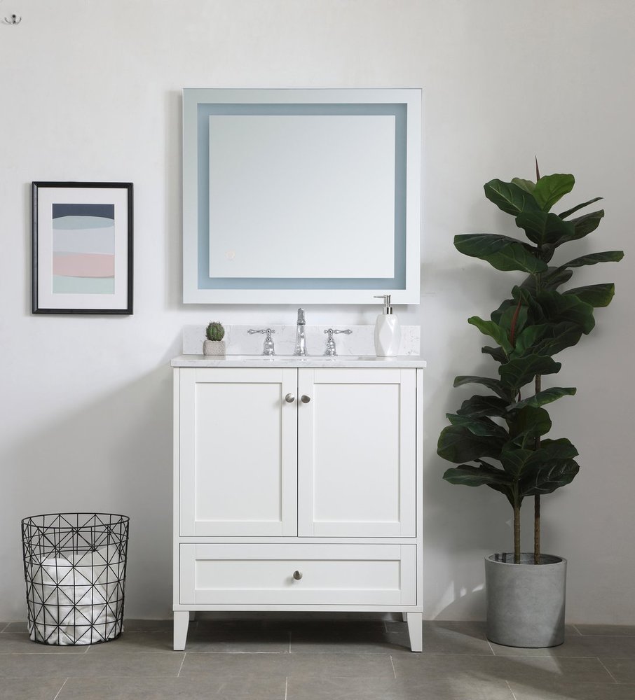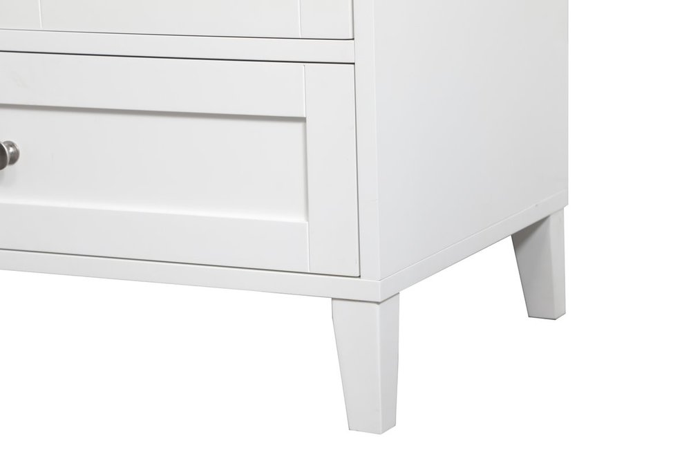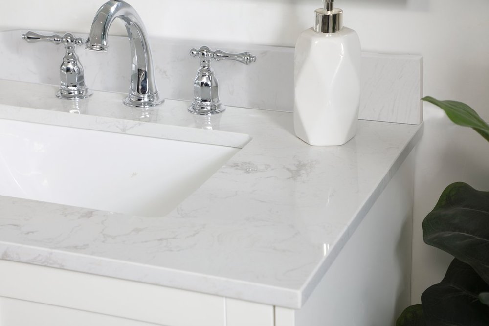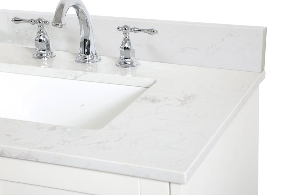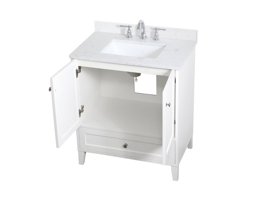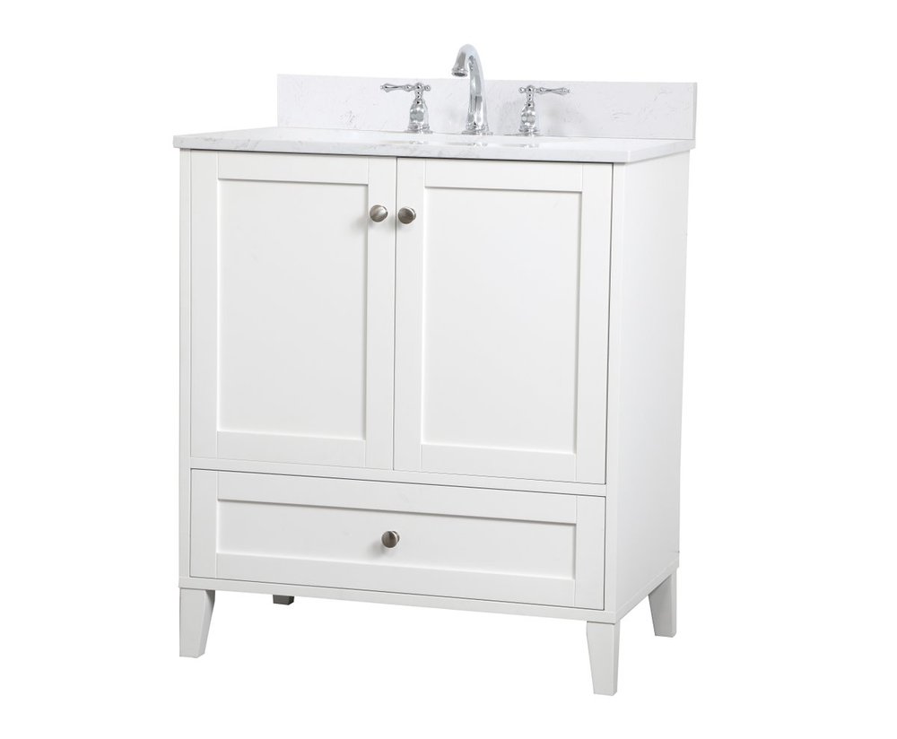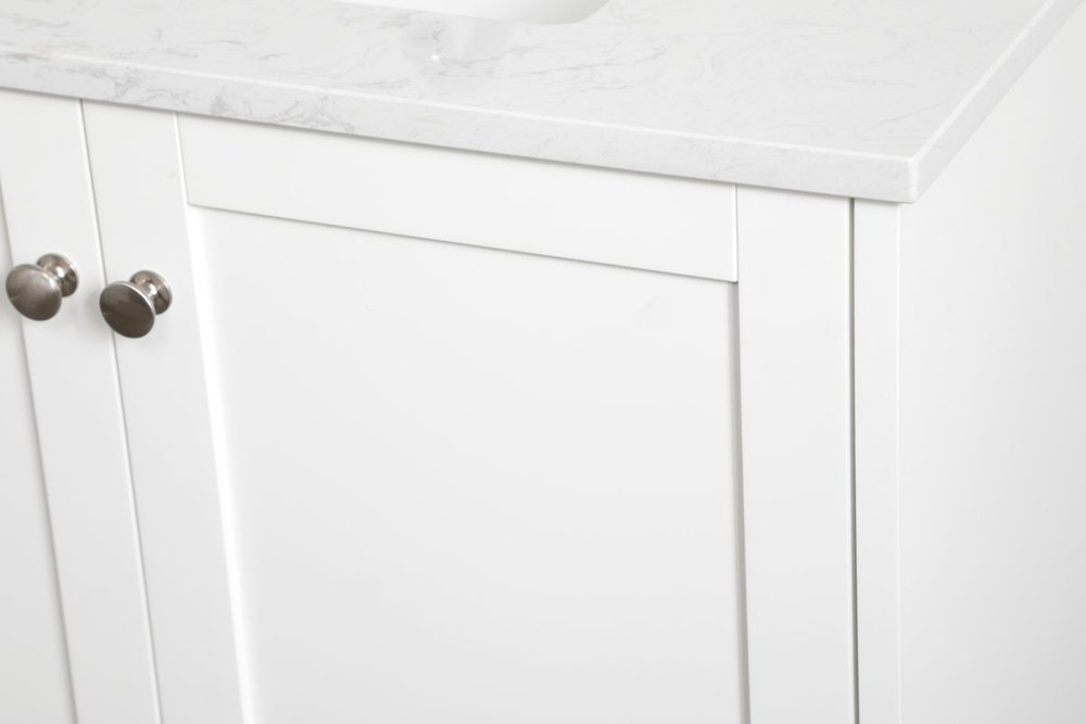 While unassuming, this 30" vanity in a white finish sure knows how to redefine luxury. The sleek brushed nickel knobs adorn the two cabinet doors and base drawer which allows you to store your bathroom toiletries and necessities. Standing strong on oblique legs and dressed with a calacatta engineered marble countertop, this vanity will surely create beauty and casual elegance in your bathroom or powder room. Comes with a matching backsplash to complete the look and protects your wall.