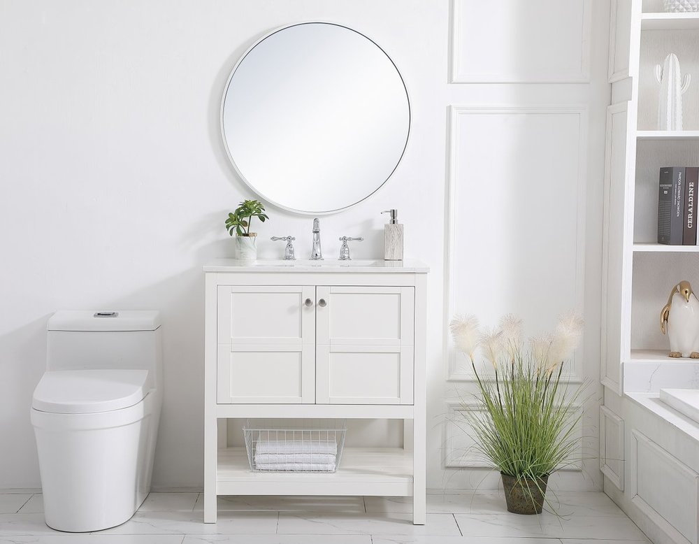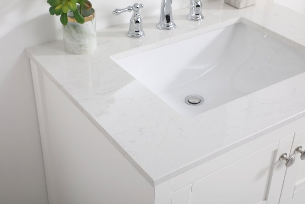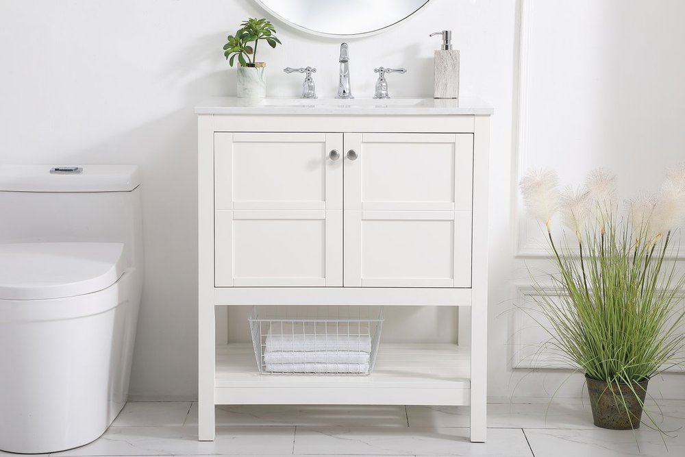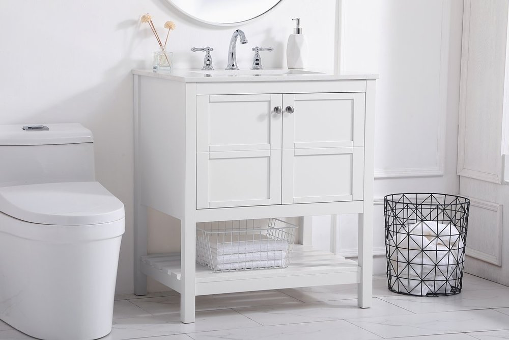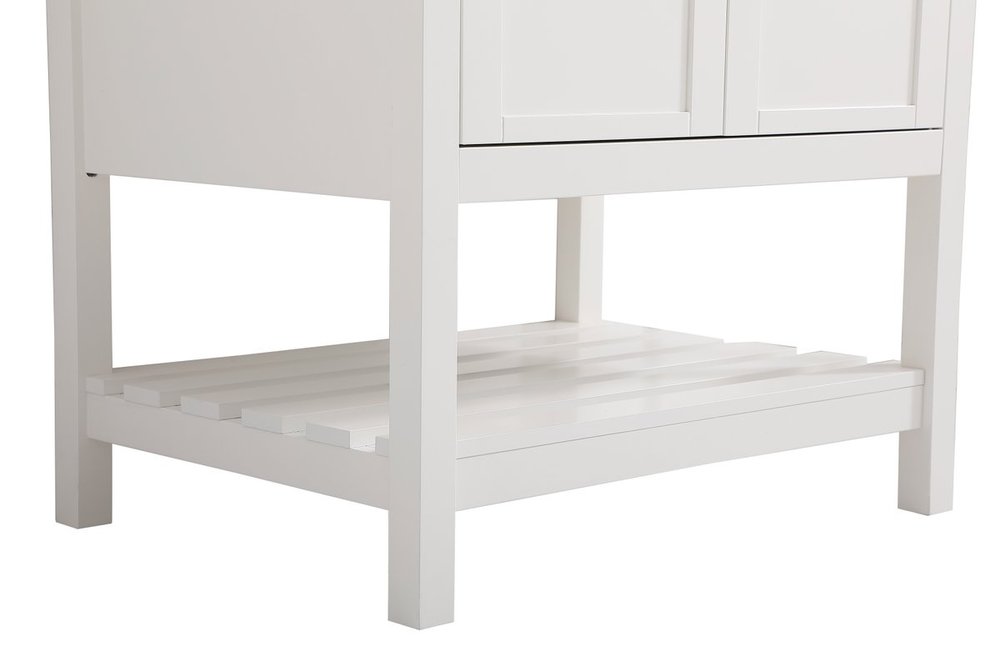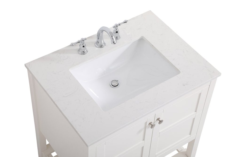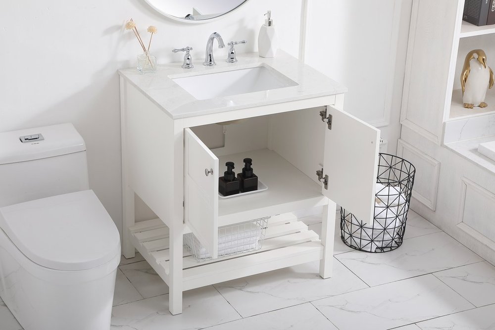 The subtle beauty of the Theo collection 30" vanity in a white finish exudes comfortable luxury. Its modern, yet traditional beauty will surely dress up your bathroom or powder room without any fuss. The white stone countertop and porcelain undermount sink shows quiet opulence, and the legs support upright without fail. Brushed Nickel hardware complements the trendy white finish, with pulls adorning the two cabinet doors, showcasing ample storage space within. Slated shelf allows for additional space to organize your towels. Whether this vanity is in your bathroom or for guests, its presence will surely elevate the aesthetics of your room.