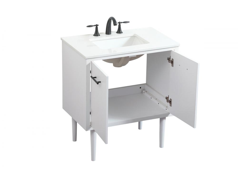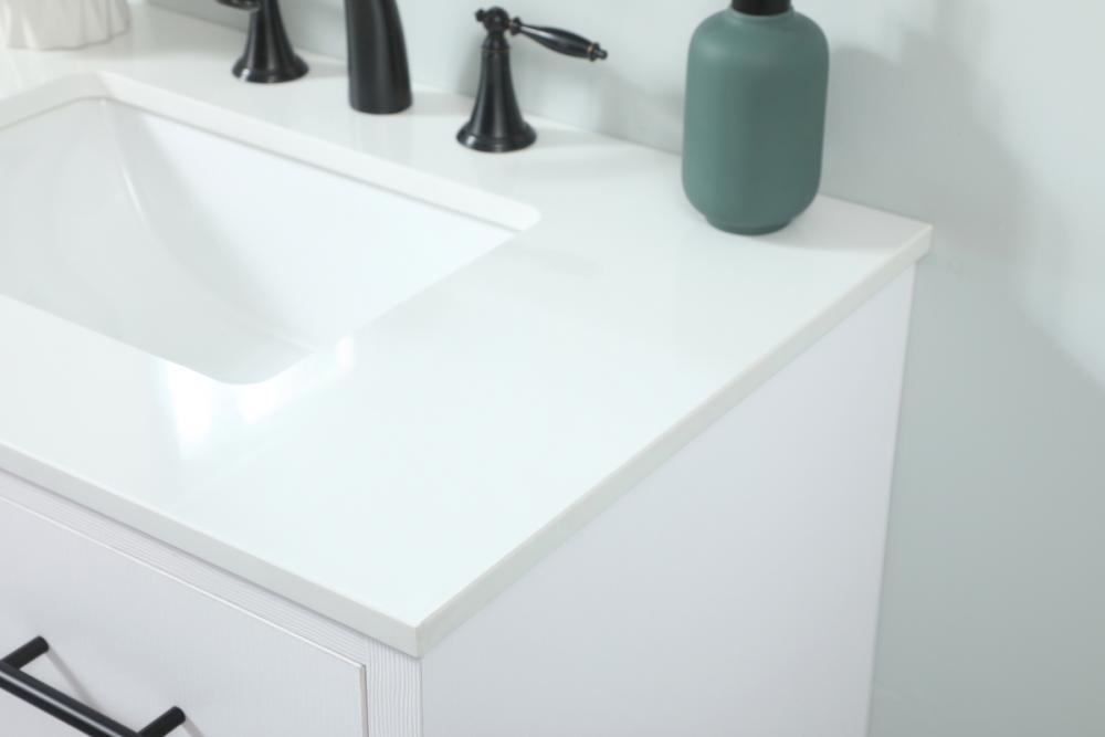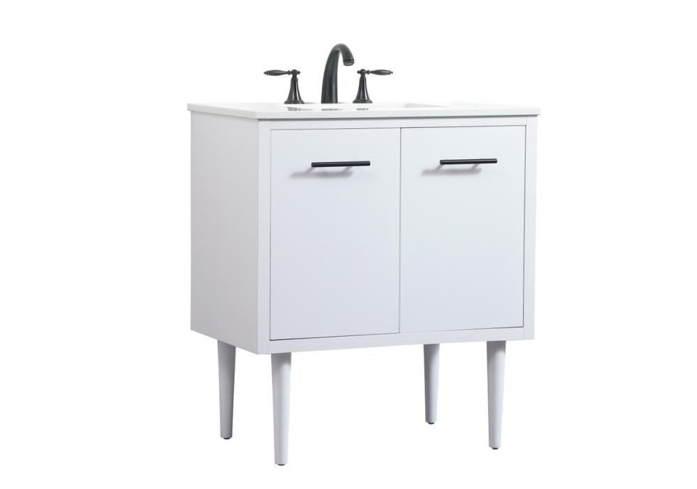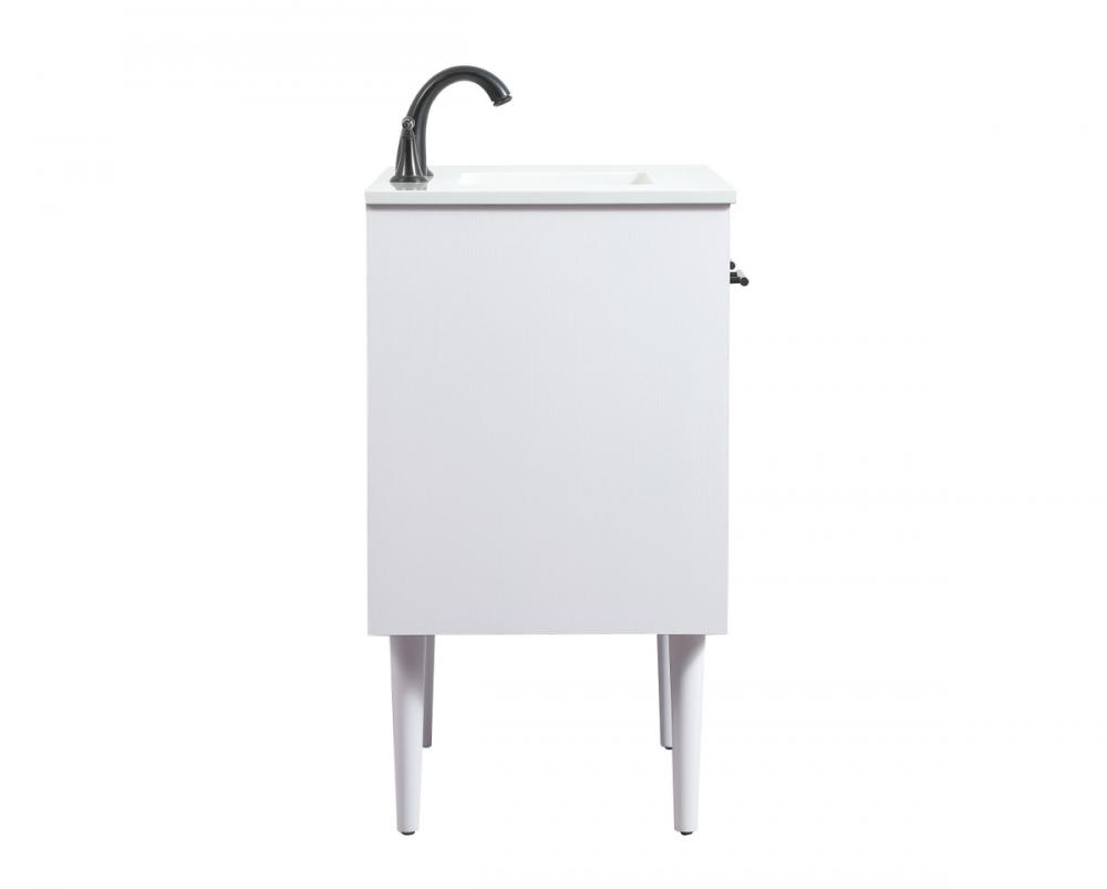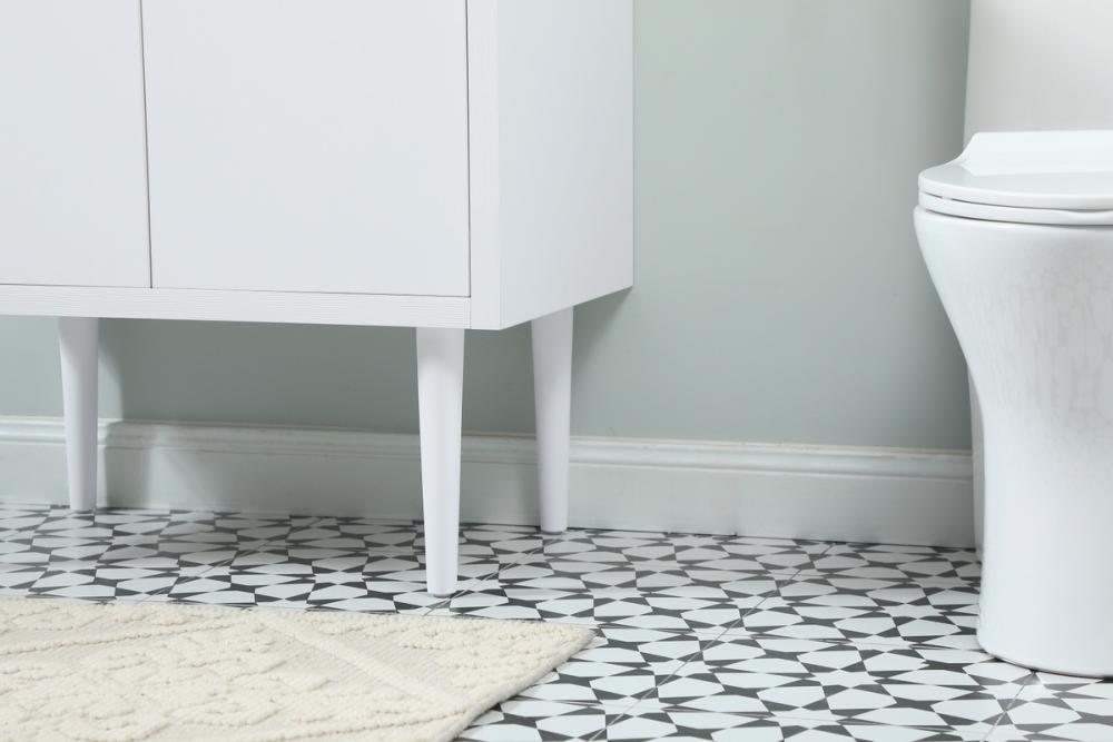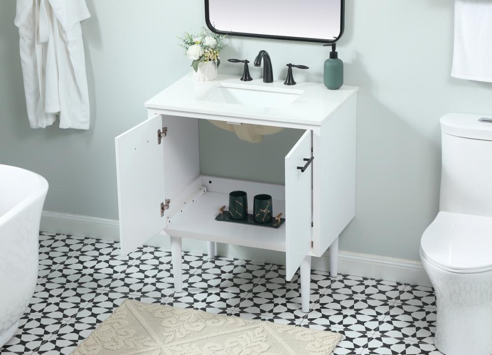 Delve into a world of minimalistic fashion and contemporary styling with this midcentury modern vanity. The clean lines anchors the design, while the straight tapered cylinder legs add subtle interest. Bar pull handle adorns the soft closing door hiding the base of the rectangular porcelain sink and letting you store your bathroom necessities and toiletries. Whether you want to use this as a floating vanity or a freestanding vanity, the choice is yours. The durable ivory white engineered marble countertop complements the manufactured wood base vanity and is built to last.