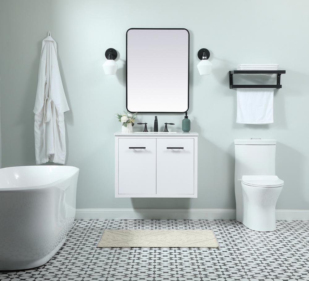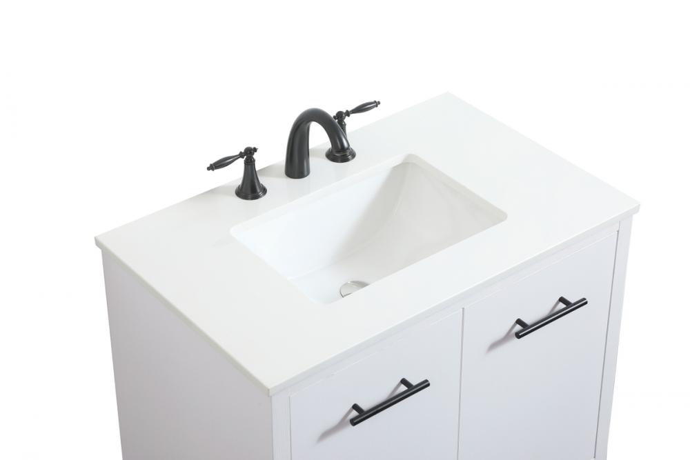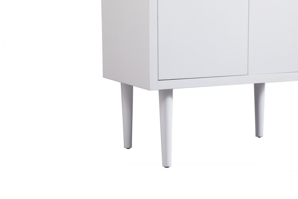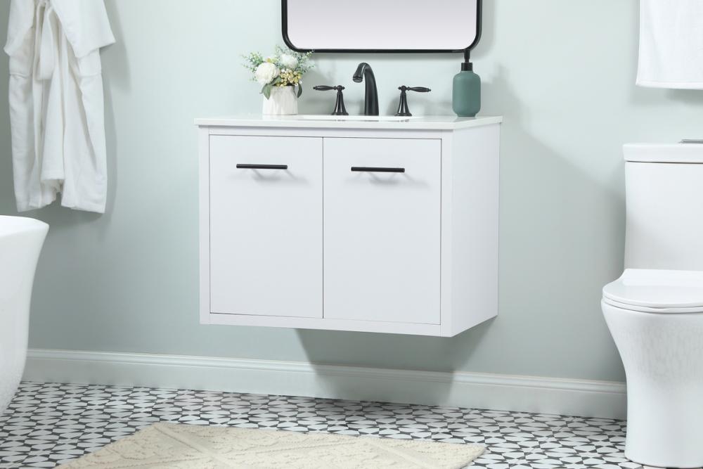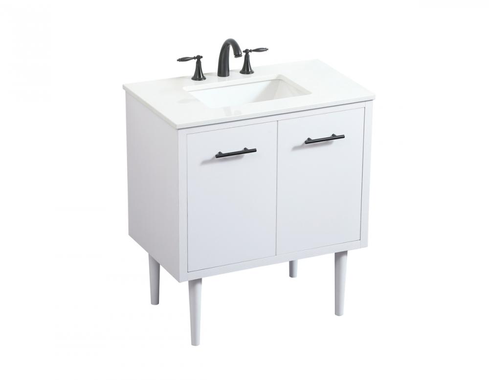Delve into a world of minimalistic fashion and contemporary styling with this midcentury modern vanity. The clean lines anchors the design, while the straight tapered cylinder legs add subtle interest. Bar pull handle adorns the soft closing door hiding the base of the rectangular porcelain sink and letting you store your bathroom necessities and toiletries. Whether you want to use this as a floating vanity or a freestanding vanity, the choice is yours. The durable ivory white engineered marble countertop complements the manufactured wood base vanity and is built to last.