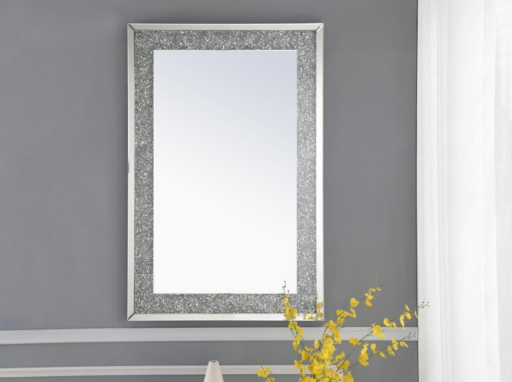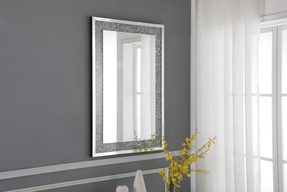 This classic contemporary rectangular mirror adds eye catching radiance and style. It features dazzling sparkling gray crystals that acts as if it doesn’t need any illumination to shine brilliantly, while the minimal clear cut beveled border anchors the design to keep it from being too ornate. A wonderful combination of minimalism and gleaming splendor, its timeless beauty can adorn any wall—whether it’s for opening up the space in the living room or foyer, to create visual interest in an office space, or to get ready for your day/night out in the bathroom or powder room.