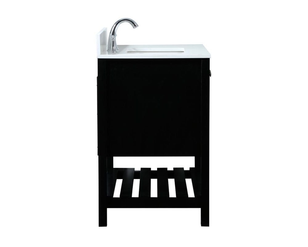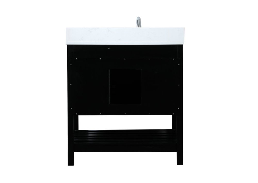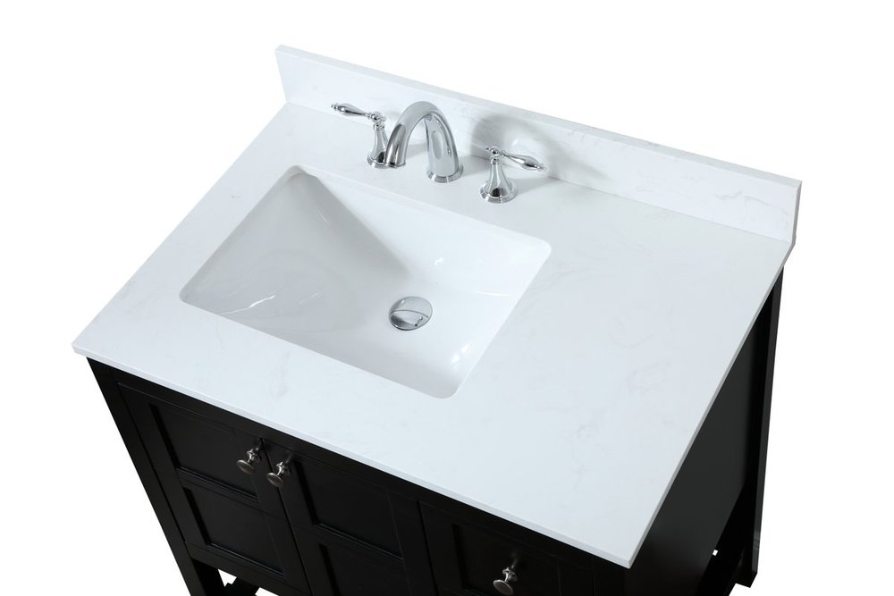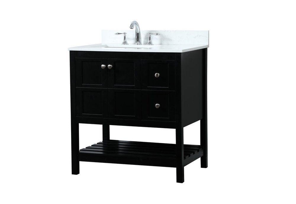 The subtle beauty of the Theo collection vanity exudes comfortable luxury. Its modern, yet traditional beauty will surely dress up your bathroom or powder room without any fuss. The calacatta engineered marble countertop and porcelain undermount sink shows quiet opulence, and the legs support upright without fail. Brushed nickel hardware complements the classic black finish, with pulls adorning the two cabinet doors, showcasing ample storage space within. Slated shelf allows for additional space to organize your towels. Whether this vanity is in your bathroom or for guests, its presence will surely elevate the aesthetics of your room. Comes with a matching backsplash to help protect your bathroom wall.