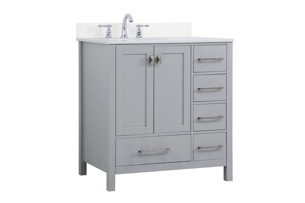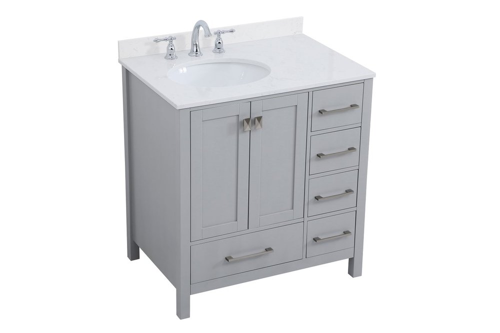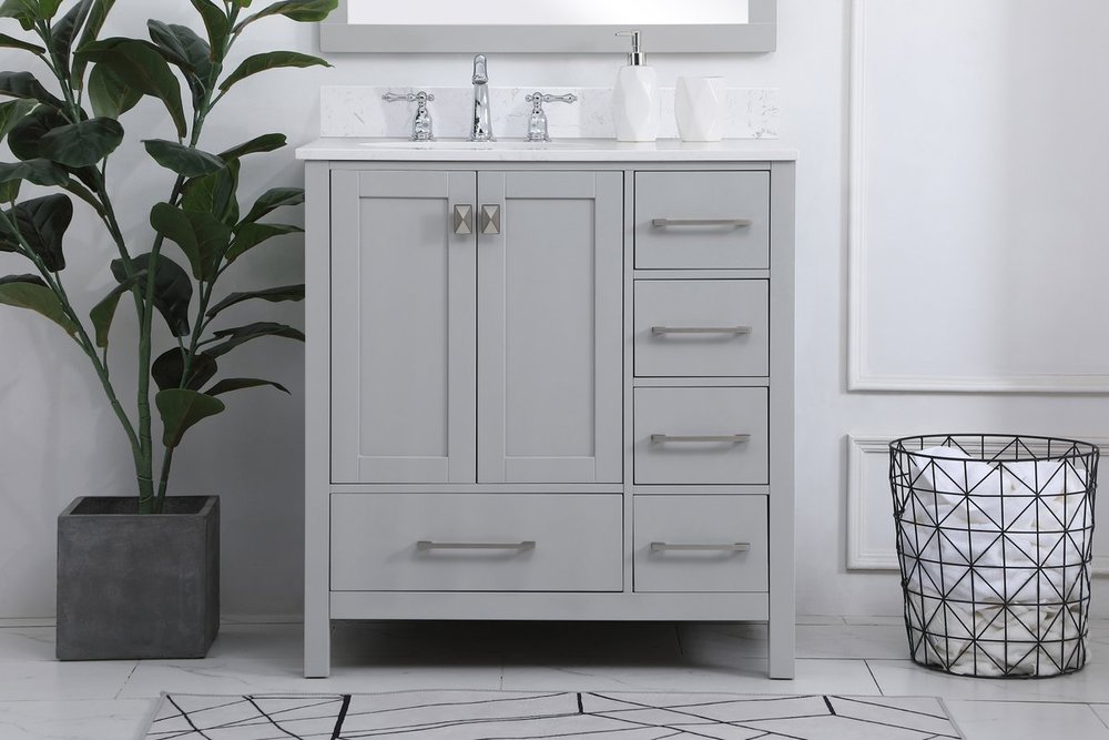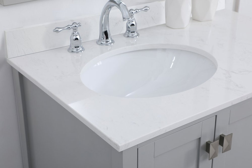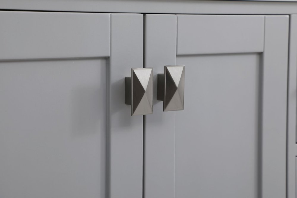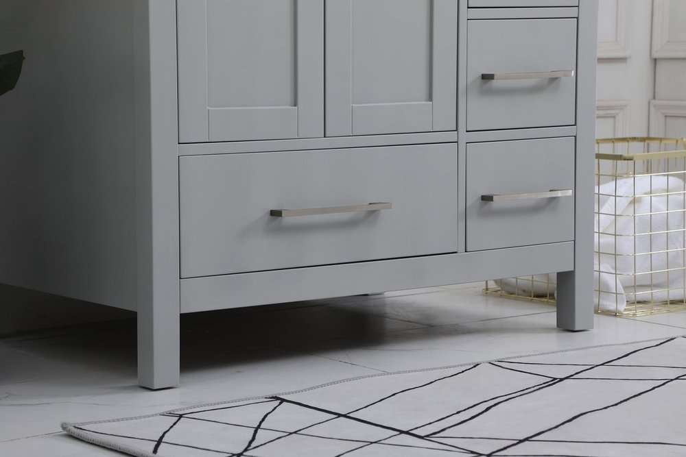 Never compromise beauty--the Irene collection stunning vanity in a gray finish will add lovely sophistication and complement any bathroom or powder room, while utilizing its charm and function to provide you with ample storage spaces. Brushed nickel pulls gently adorn the minimalist cabinet doors and drawers at the base, allowing for you to store away your bathroom essentials. The calacatta engineered marble countertop, porcelain undermount sink, dignified subtle engravings on the side edges, and squared legs all come together to create contemporary beauty. Work with your space, and design a beautiful room, no matter the size. Comes with a matching backsplash to complete the look and protects your wall.