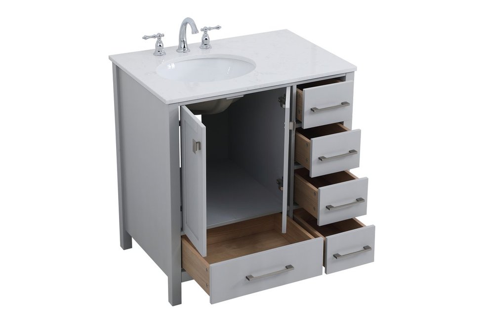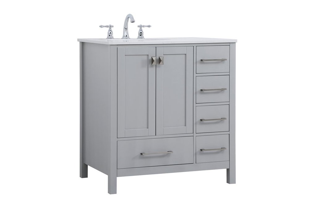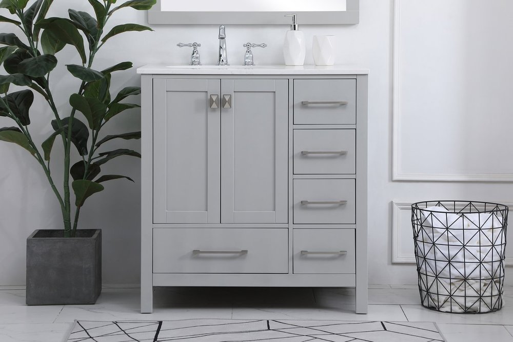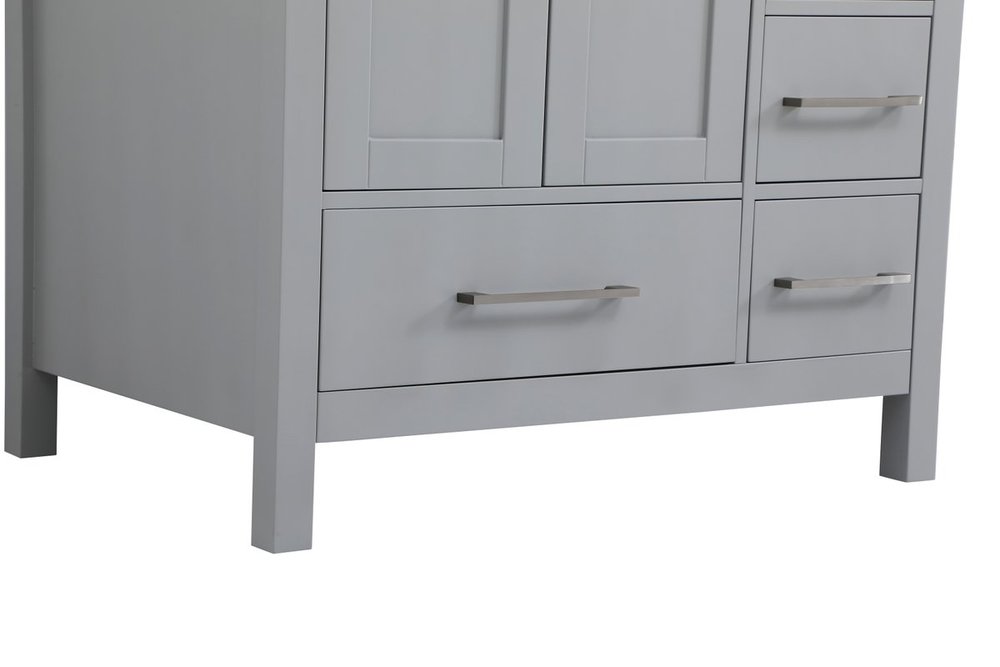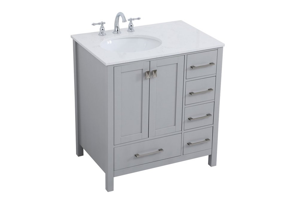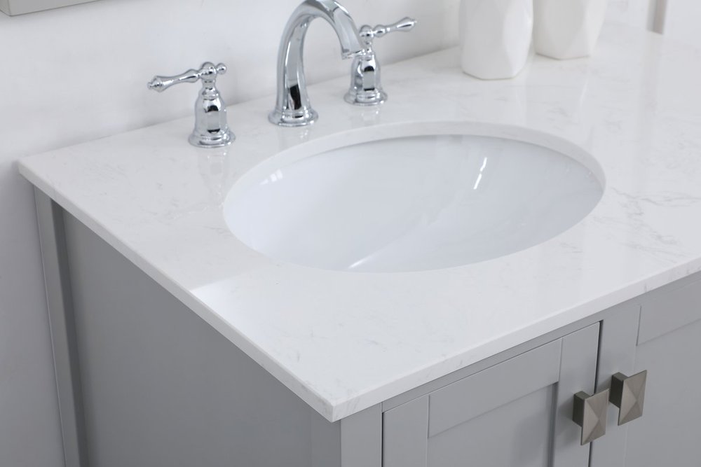 Never compromise beauty--the Irene collection stunning vanity in a gray finish will add lovely sophistication and complement any bathroom or powder room, while utilizing its charm and function to provide you with ample storage spaces. Brushed nickel pulls gently adorn the minimalist cabinet doors and drawers at the base, allowing for you to store away your bathroom essentials. The calacatta engineered marble countertop, porcelain undermount sink, dignified subtle engravings on the side edges, and squared legs all come together to create contemporary beauty. Work with your space, and design a beautiful room, no matter the size.