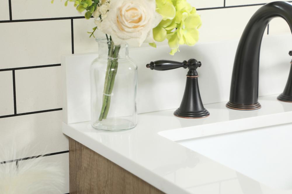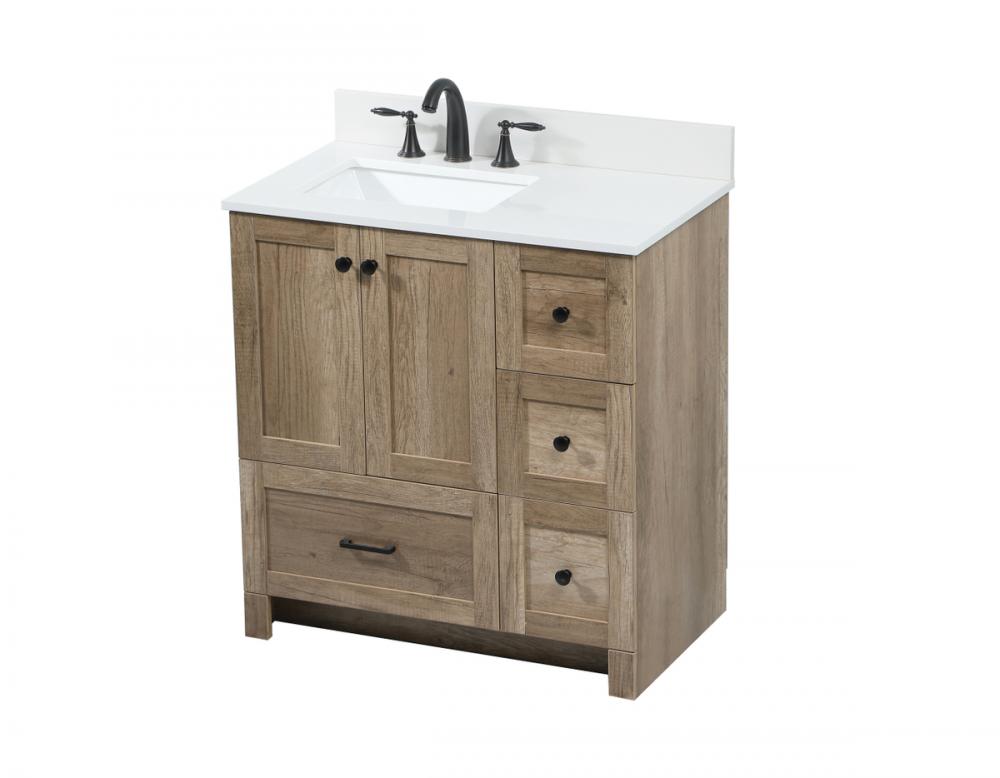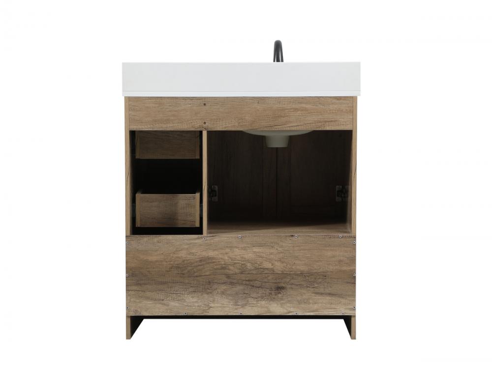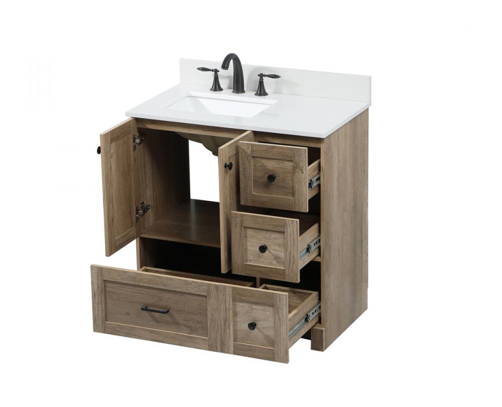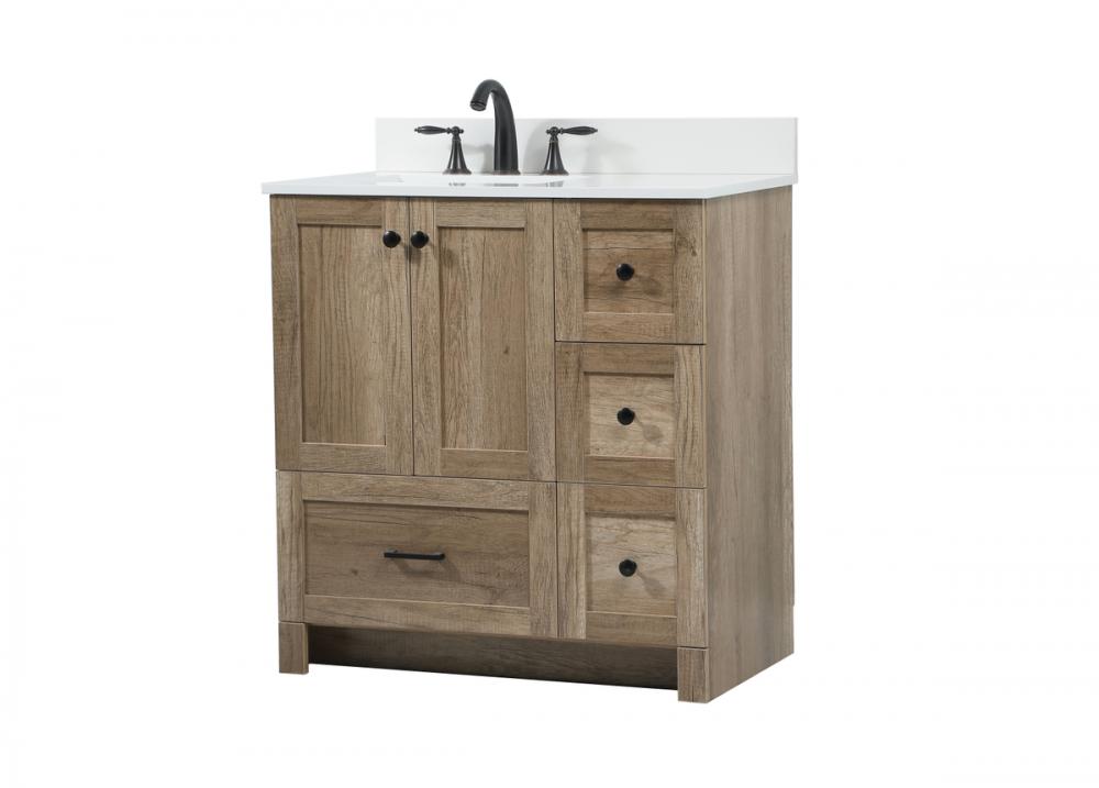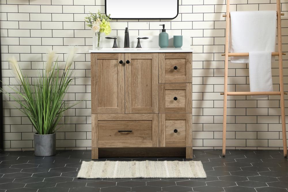 Delve into a world of minimalistic fashion and contemporary styling with this farmhouse 32" vanity. The clean faux lines anchors the weathered design. Black handle adorns the two doors hiding the base of the integrated porcelain sink while the bottom drawer and side drawers allow you to store your bathroom necessities and toiletries. The compact size makes it the perfect vanity for any bathroom or powder room, regardless of size. Comes with a matching backsplash to complete the look and protects your wall.