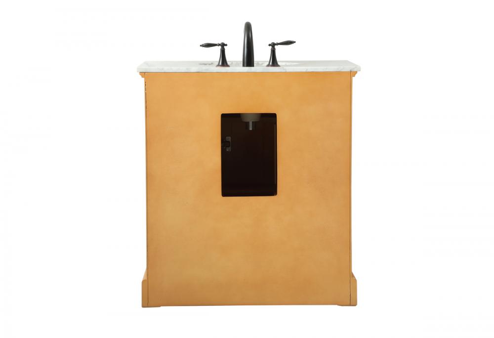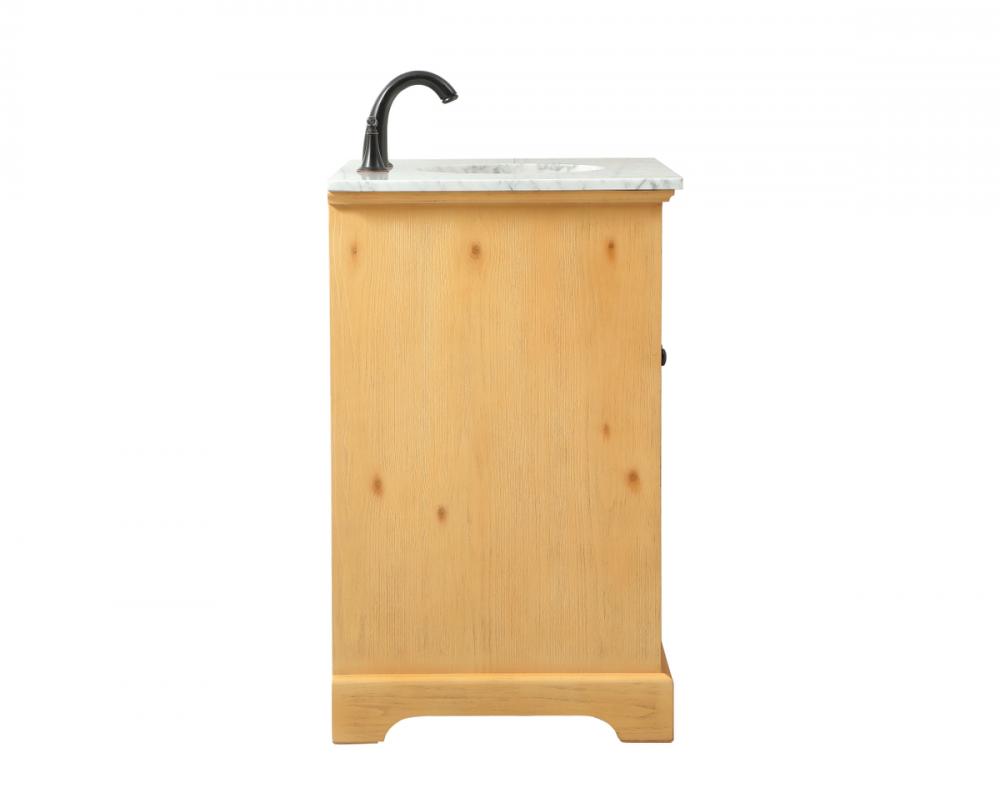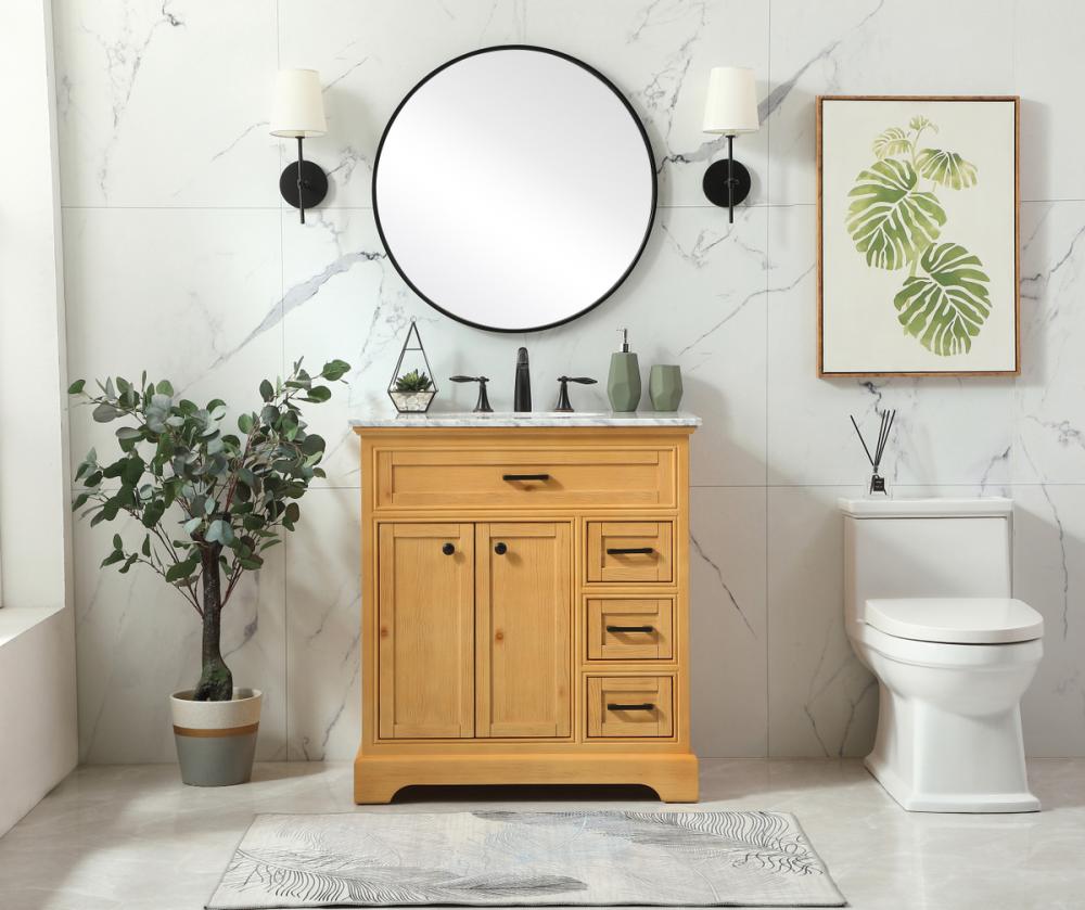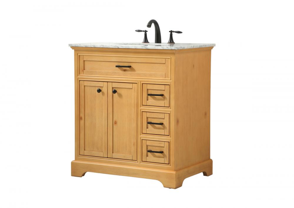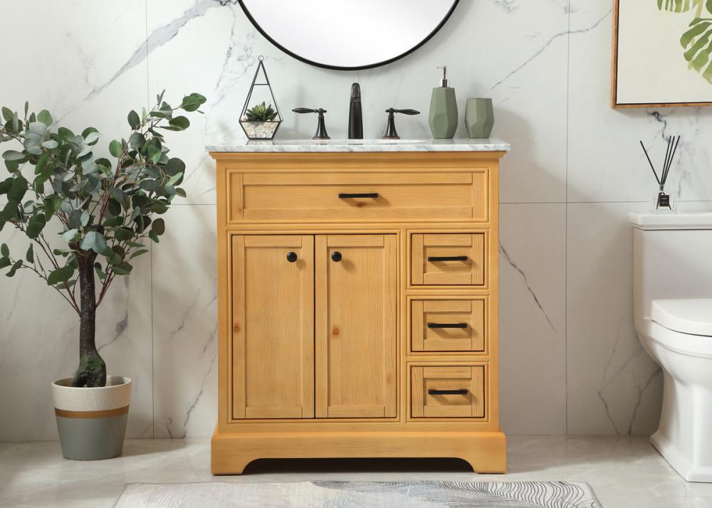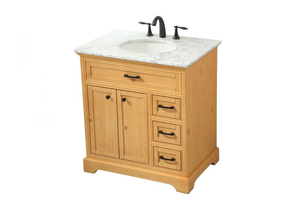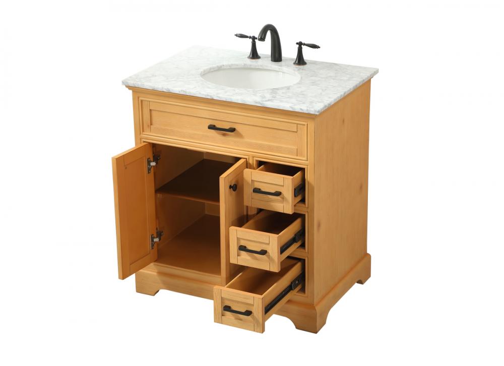 Clean lines and classic form can truly add a fresh look to your bathroom or powder room. This vanity, complemented by round hardware, will surely charm you with its confident style and subtle charisma. This vanity can store all of your bathroom toiletries, from extra towels to make up essentials. The vanity is crowned with carrara white marble and includes a porcelain undermount sink--adding both function and form that will truly amaze.