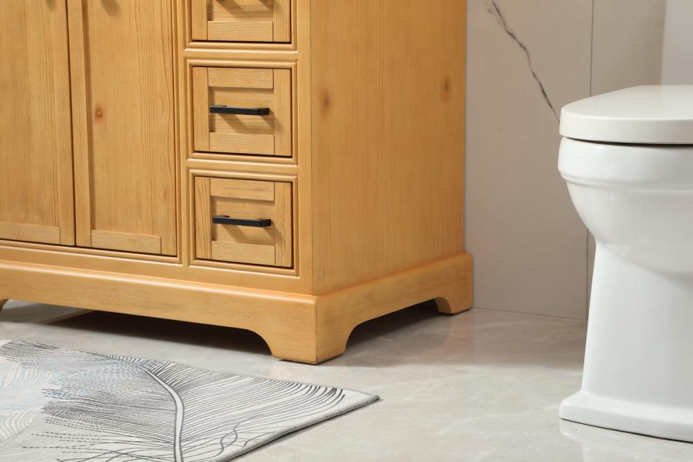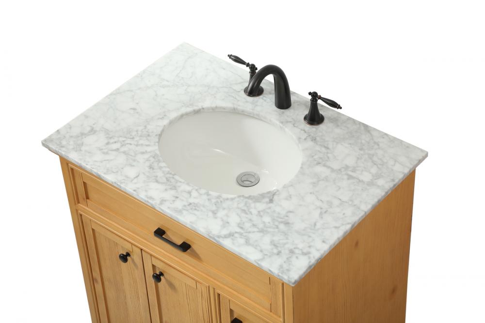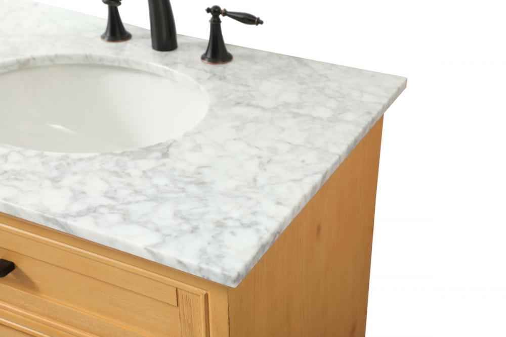 Comes with an undermount porcelain sink and a carrara white marble countertop