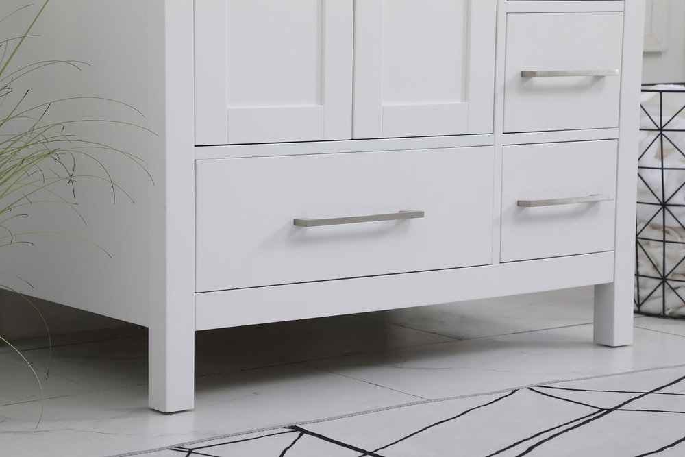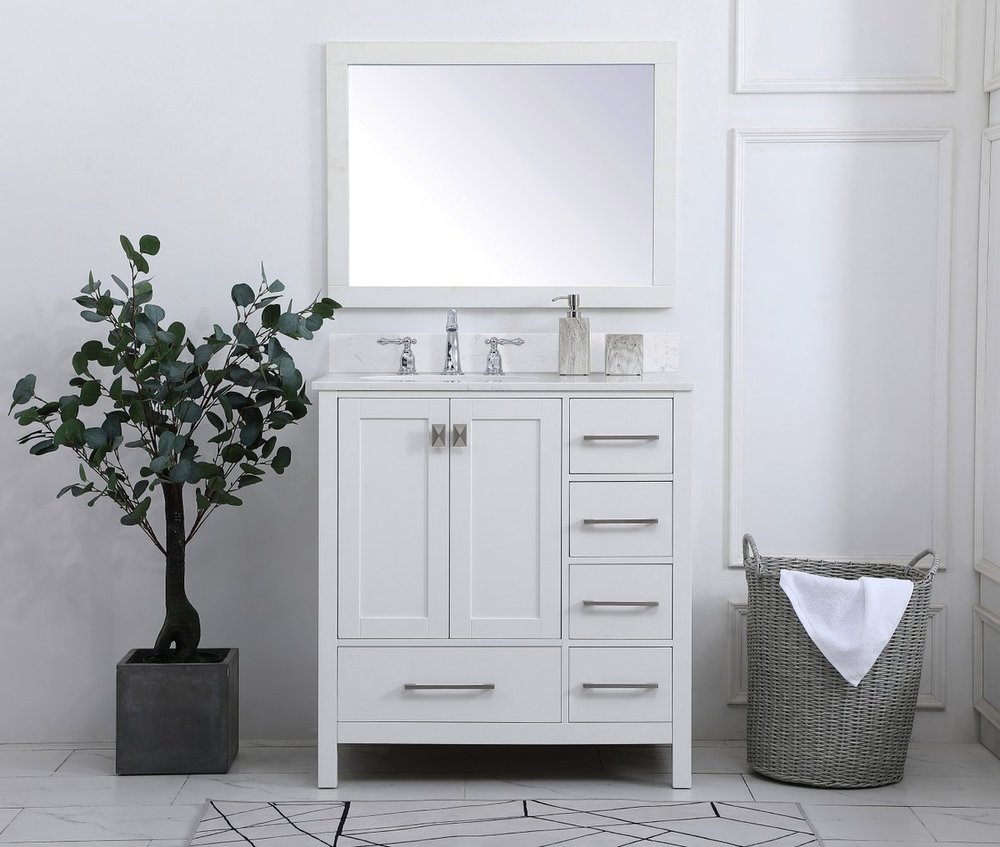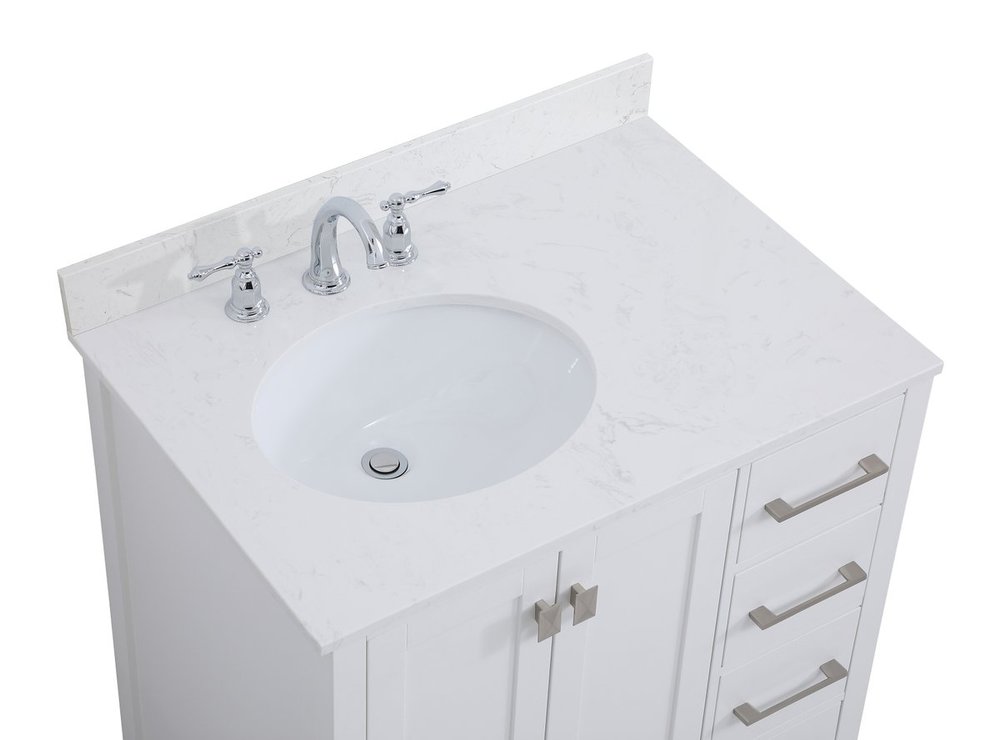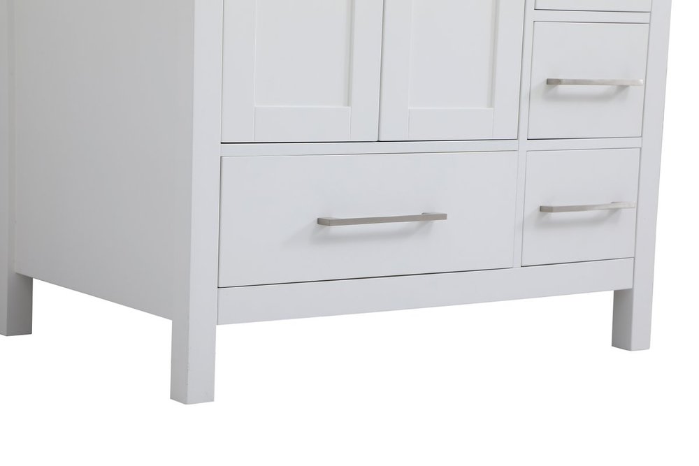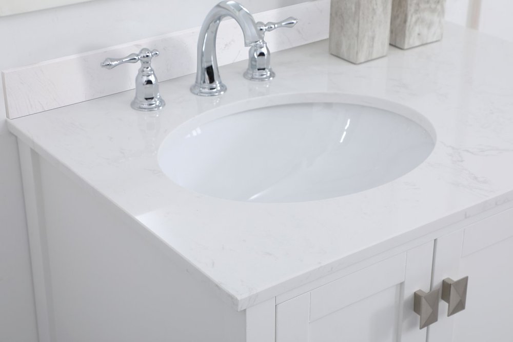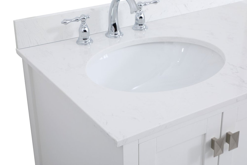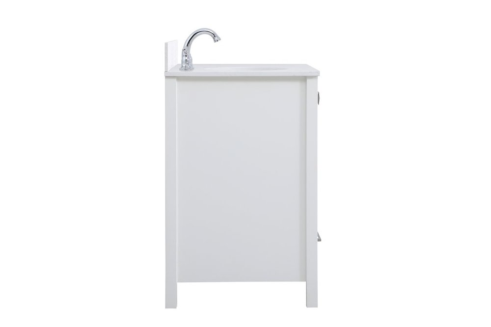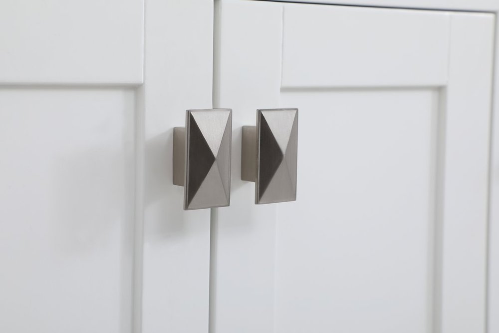 Never compromise beauty--the Irene collection stunning vanity in a white finish will add lovely sophistication and complement any bathroom or powder room, while utilizing its charm and function to provide you with ample storage spaces. Brushed nickel pulls gently adorn the minimalist cabinet doors and drawers at the base, allowing for you to store away your bathroom essentials. The calacatta engineered marble countertop, porcelain undermount sink, dignified subtle engravings on the side edges, and squared legs all come together to create contemporary beauty. Work with your space, and design a beautiful room, no matter the size. Comes with a matching backsplash to complete the look and protects your wall.