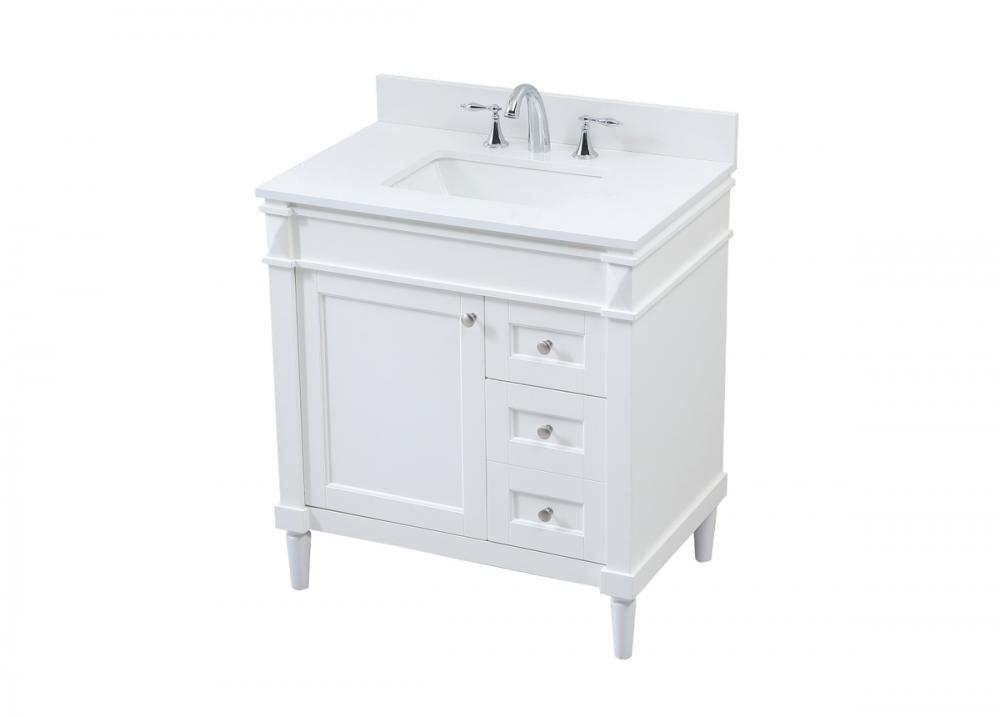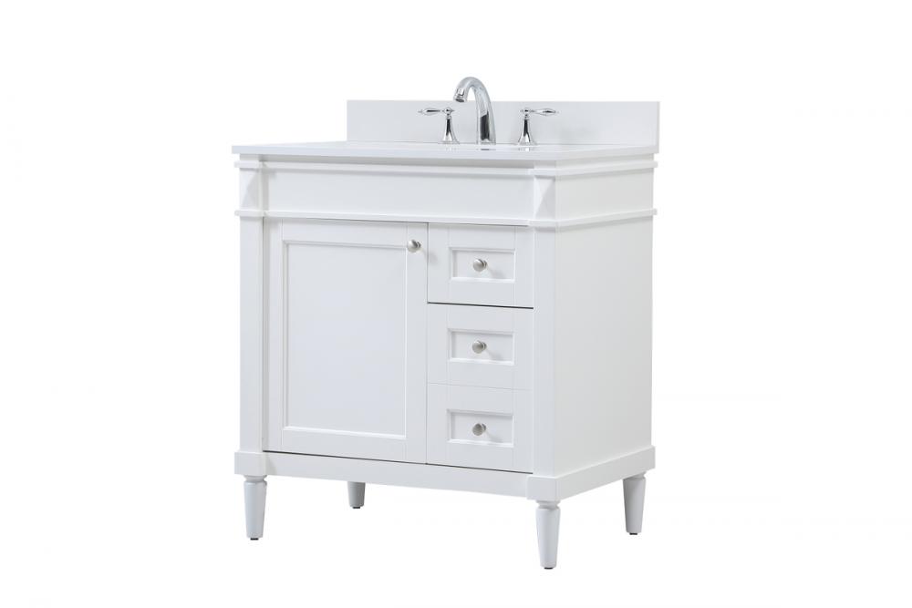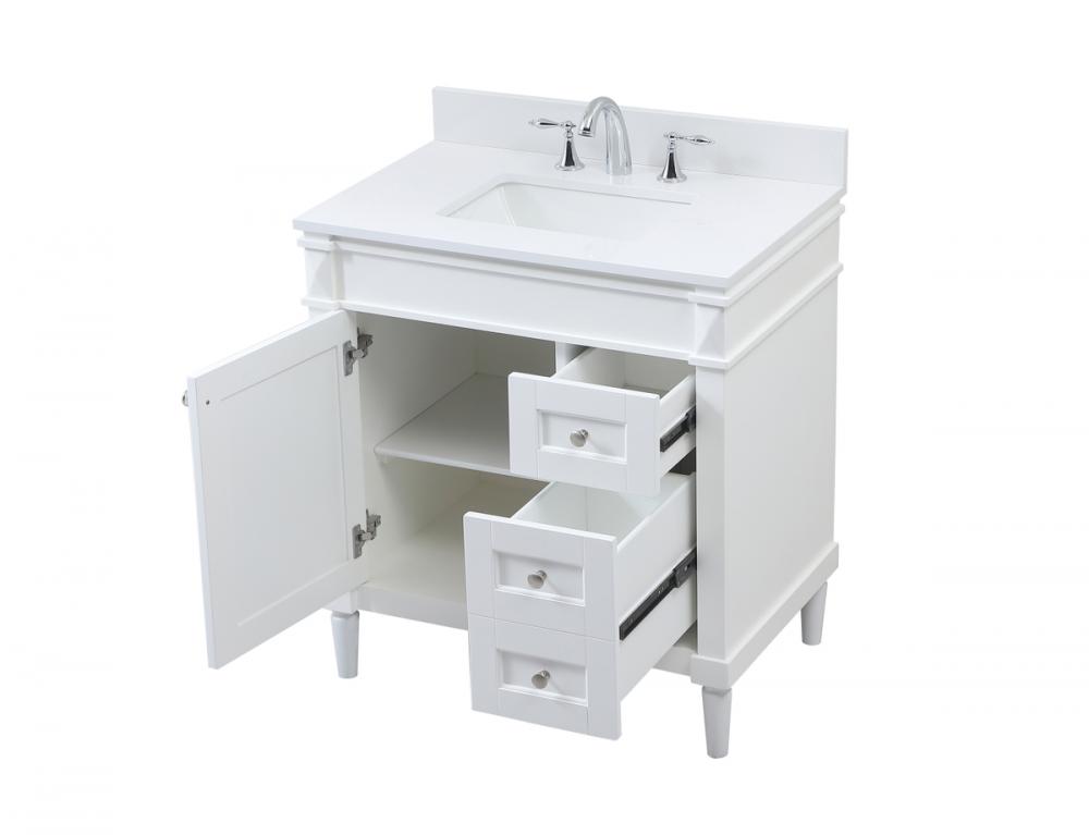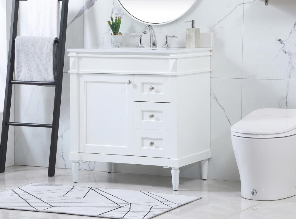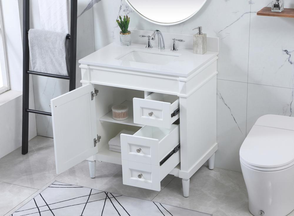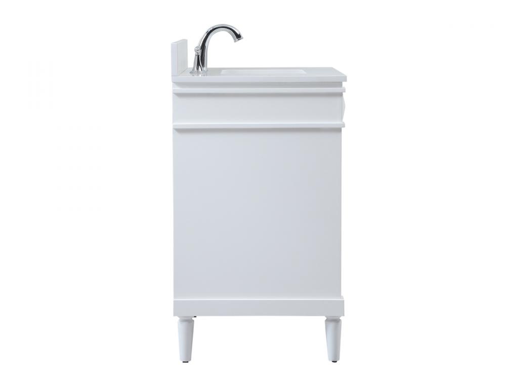 This transitional vanity is a beautiful piece of bathroom furniture will look amazing in your design scheme. The cabinet features a shaker style smooth door panel with simple round knobs and soft close hinges provide ample room for accessories. Packed with multiple side drawers with soft close glides for added comfort and full access to bath supplies. Convenient deep drawer stores all of your tall bath essentials. Constructed of engineered wood and solid wood legs with hand painted finish. The durable engineered marble countertop is a versatile material in an ivory white finish. Minor assembly of the legs needed to get this vanity up and running. Comes with a matching backsplash to complete the look and protects your wall.