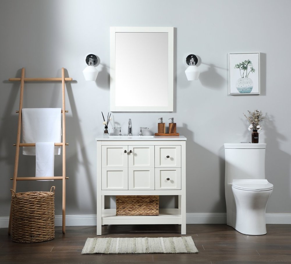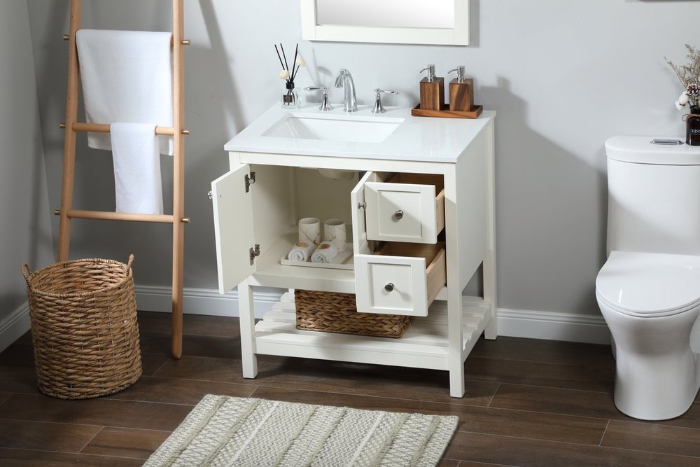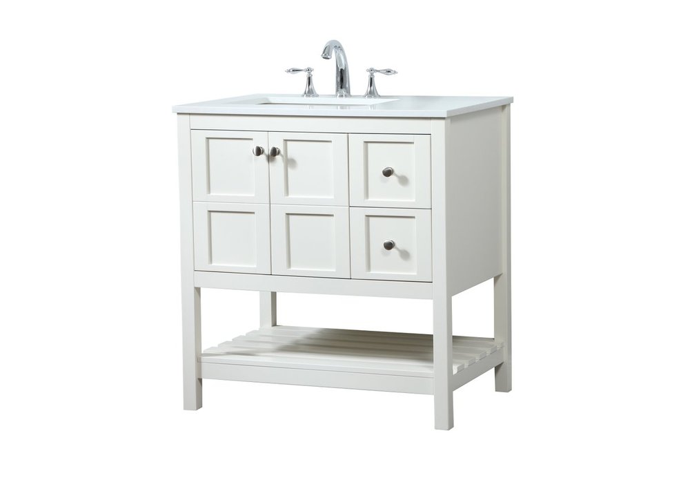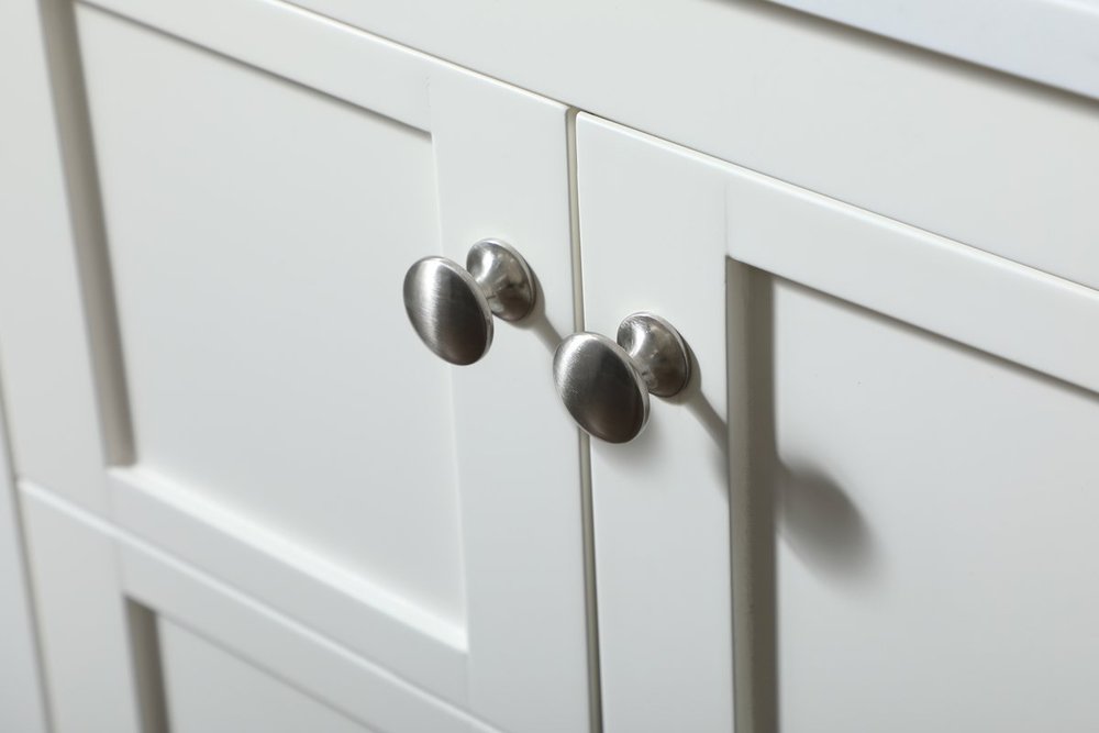 The subtle beauty of the Theo collection vanity exudes comfortable luxury. Its modern, yet traditional beauty will surely dress up your bathroom or powder room without any fuss. The calacatta engineered marble countertop and porcelain undermount sink shows quiet opulence, and the legs support upright without fail. Brushed nickel hardware complements the classic white finish, with pulls adorning the two cabinet doors, showcasing ample storage space within. Slated shelf allows for additional space to organize your towels. Whether this vanity is in your bathroom or for guests, its presence will surely elevate the aesthetics of your room.
