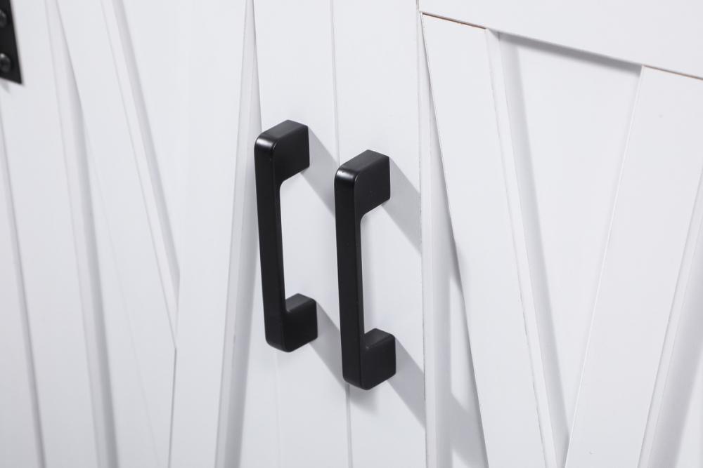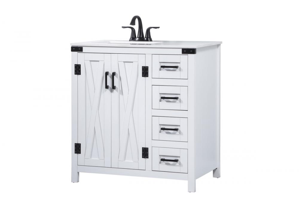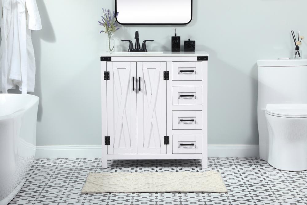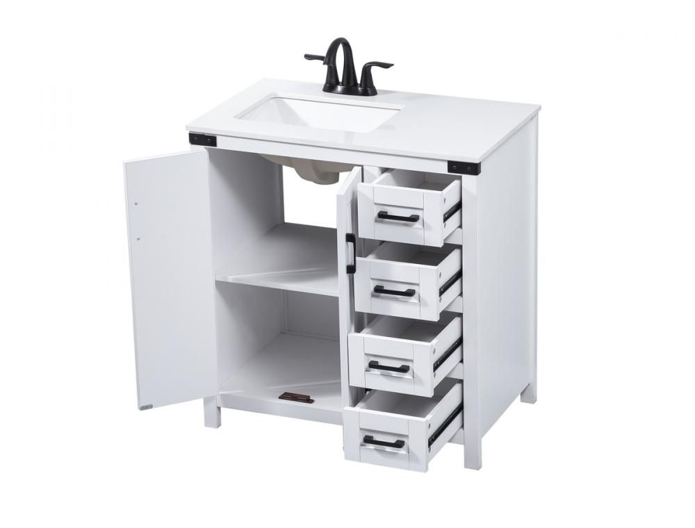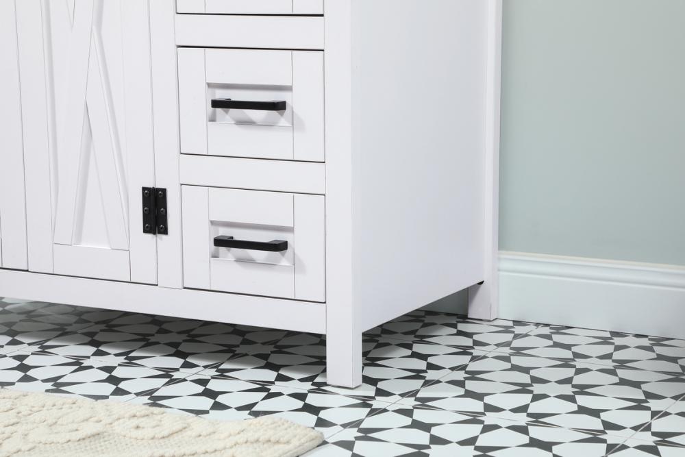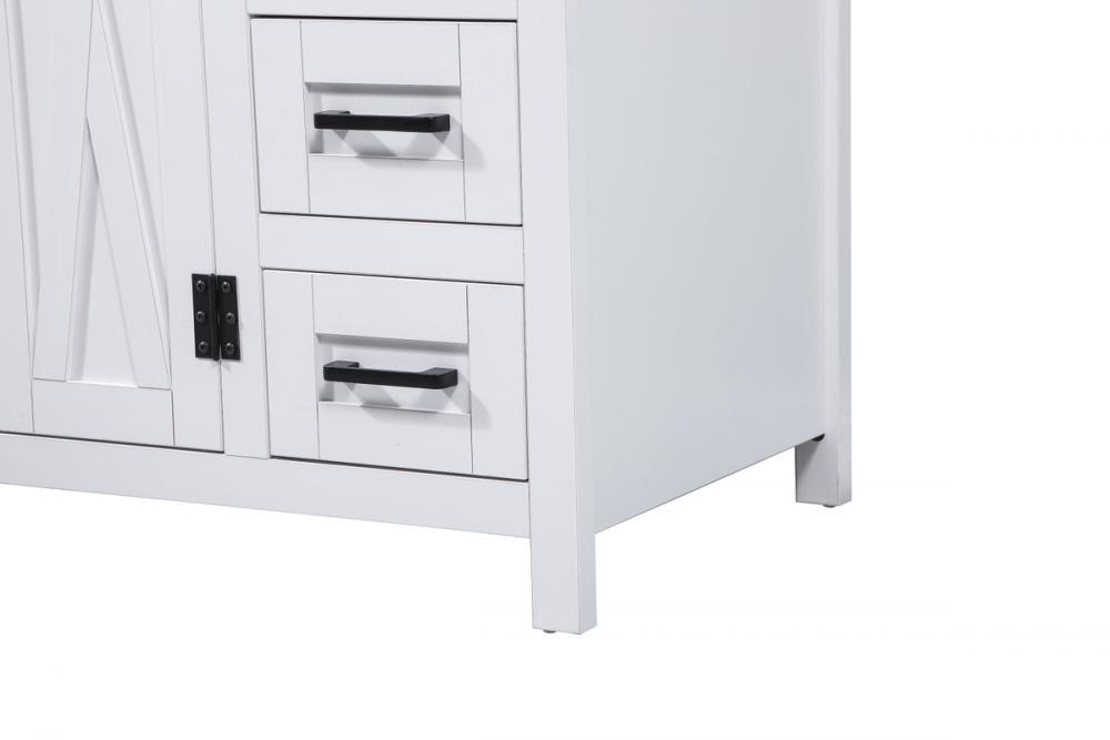 Reminiscent of barn doors, the two door cabinet and four drawers adds both stylistic charm and function with its plethora of storage options for all your bathroom essentials. Whether for your bathroom or the guests', everyone will marvel at its classic look for traditional and farmhouse aesthetics. A slab of engineered marble rounds out the piece up top, as well as the porcelain under mount sink and predrilled faucet holes. This vanity arrives fully assembled.